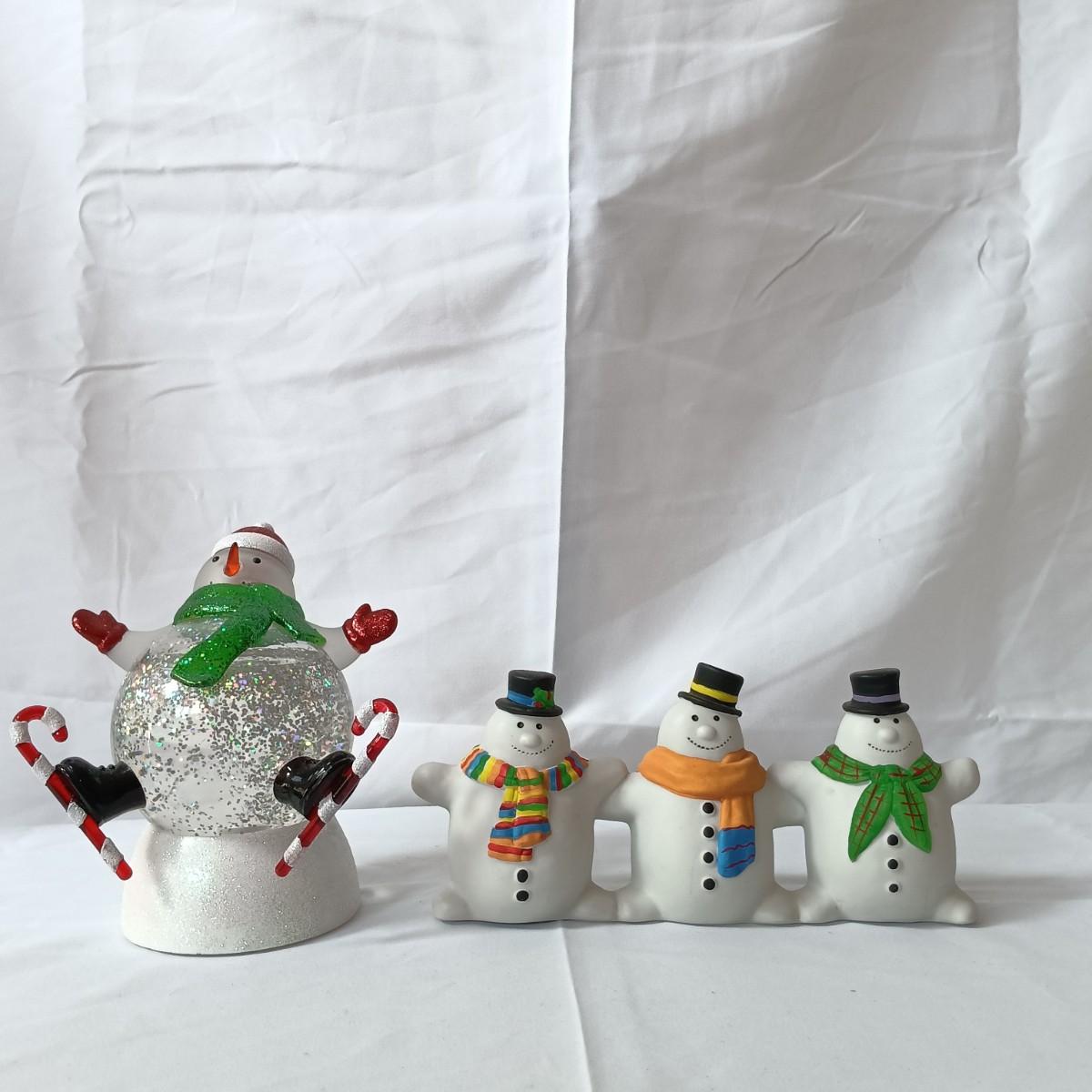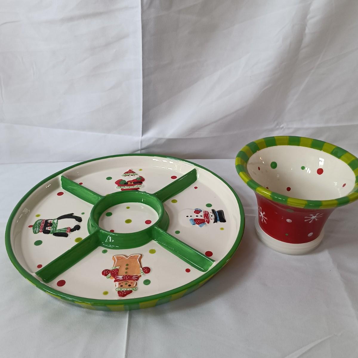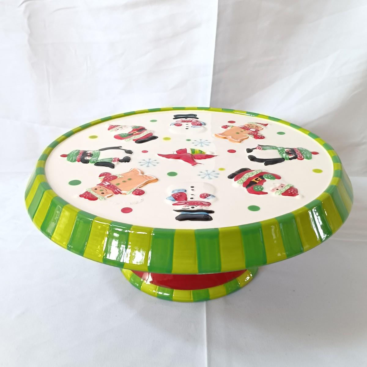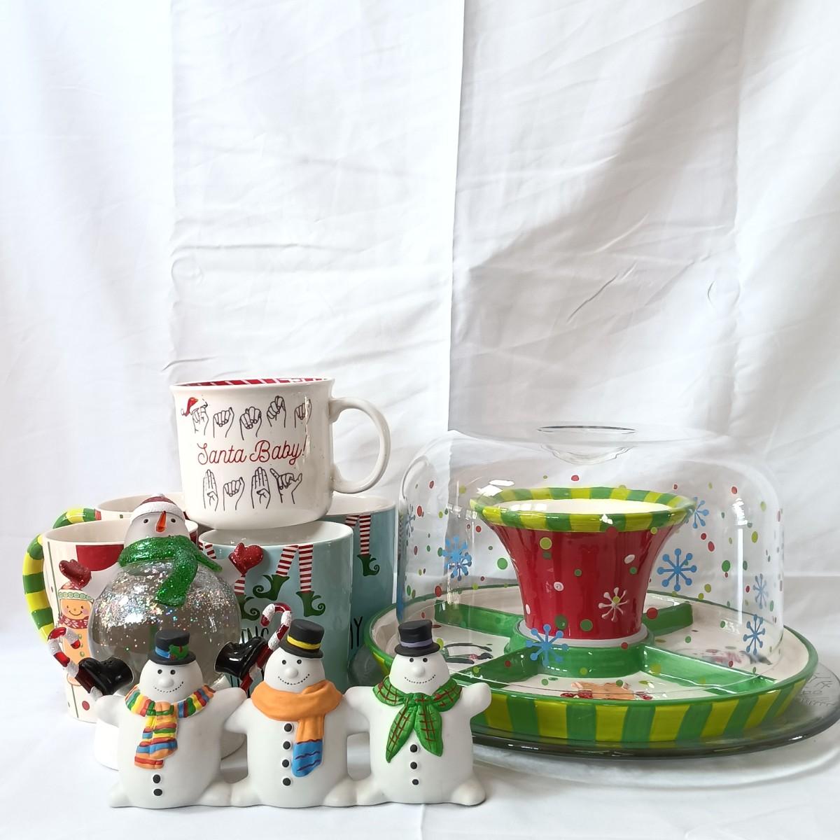 LOT 131: Whimiscal Holiday Mugs, Cake/Appetizer Tray, Dept 56 Snowmen Figure