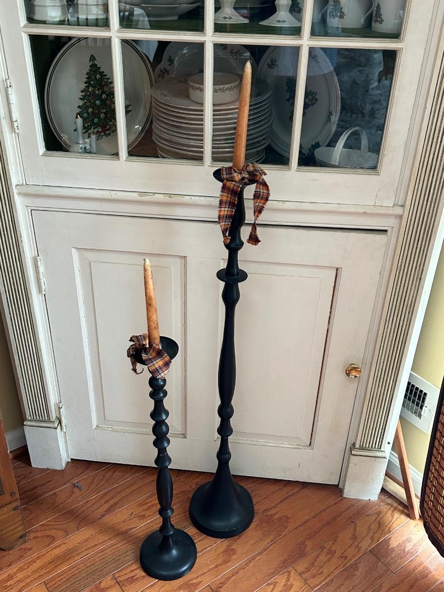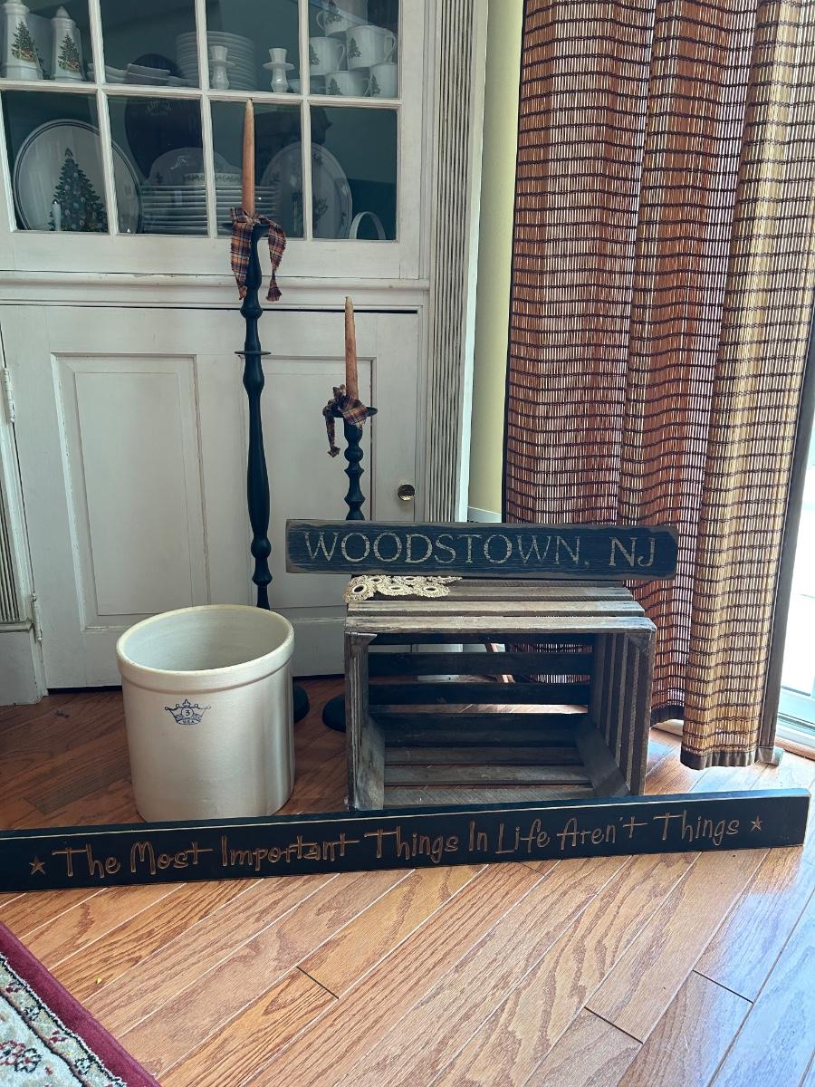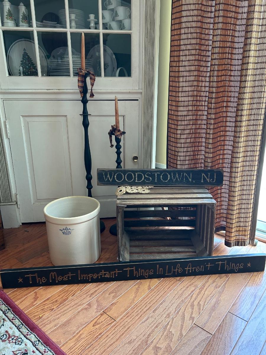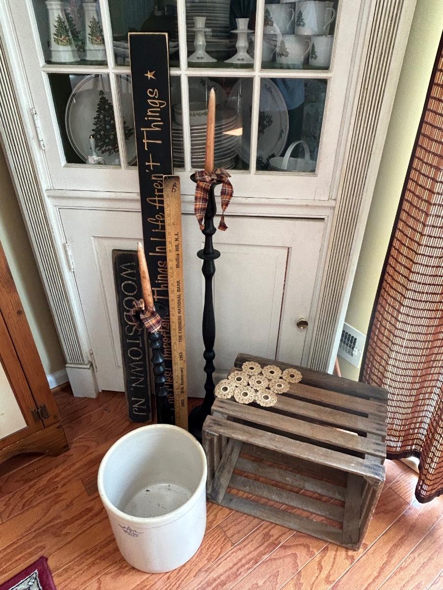 LOT 176: Farmhouse Decor - No. 3 Crock, Wood Crate, Tall Candlesticks & Signs