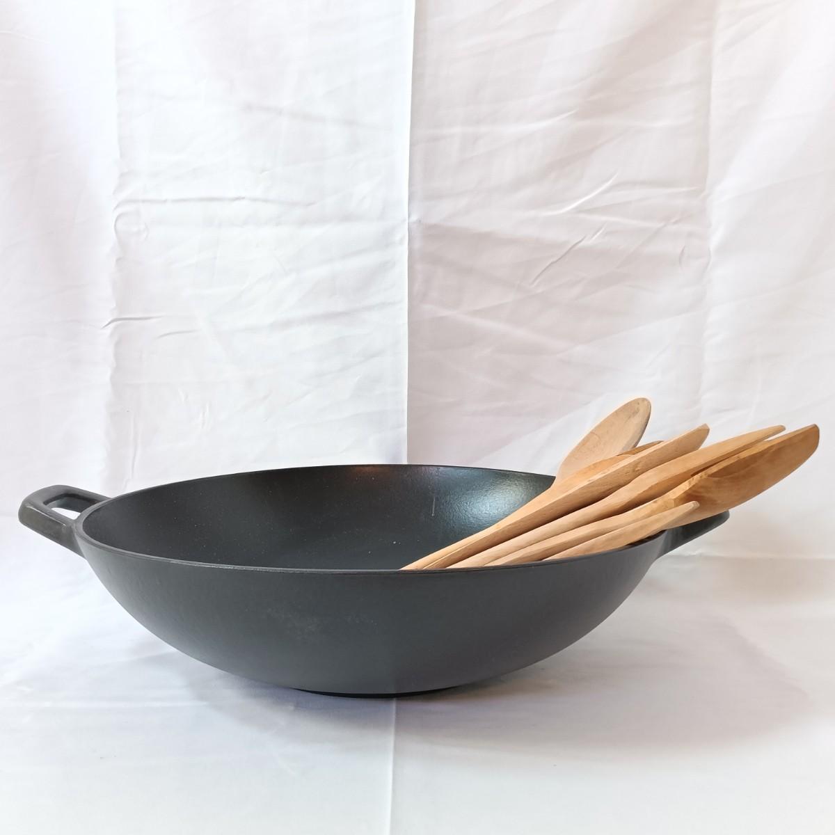 LOT 196: Zakarian Dash 14" Cast Iron Wok w/ Wood Cooking Utensils