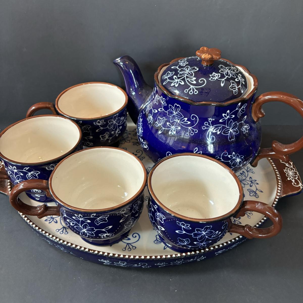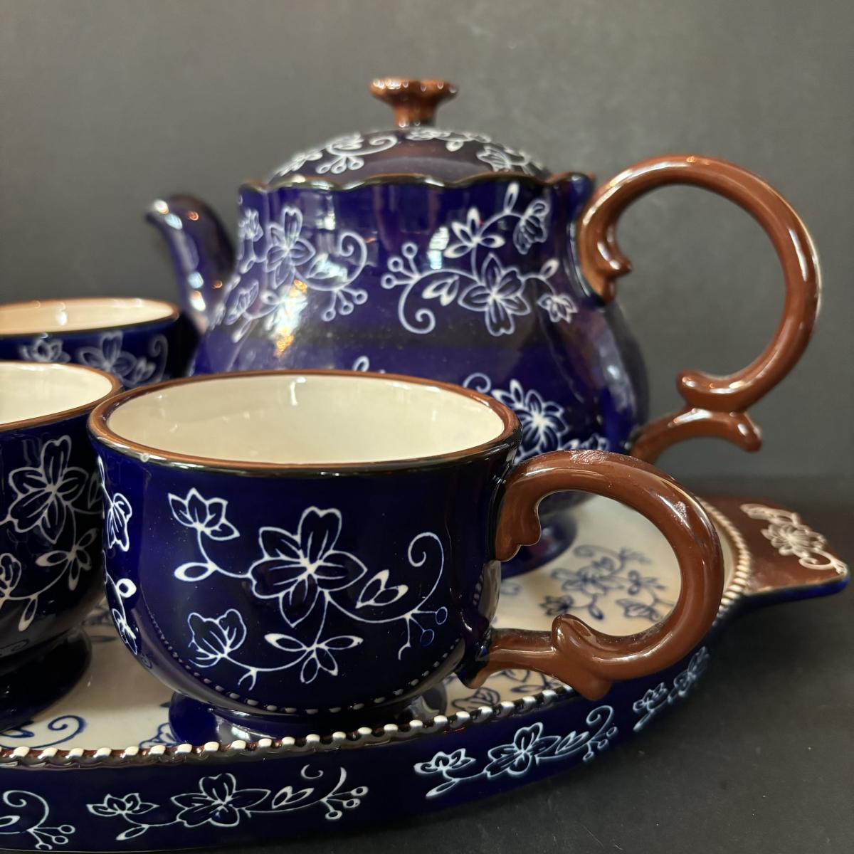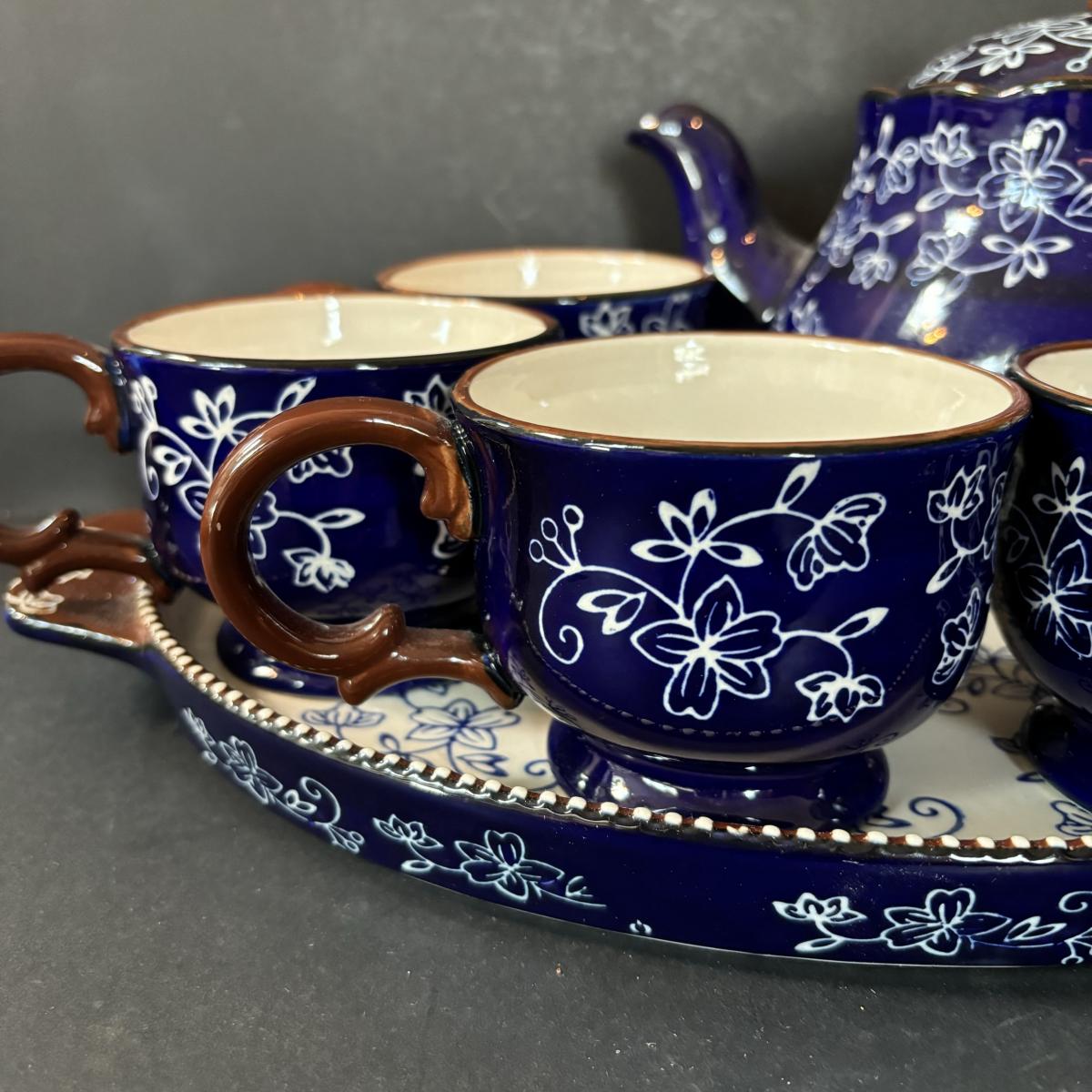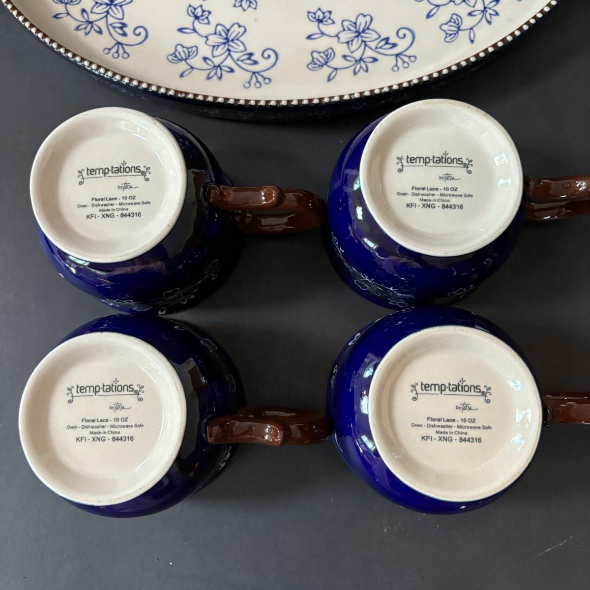 LOT 224: Temp-Tations by Tara Blue Floral Lace Tea Service for Four: Teapot, Cups & Serving Tray