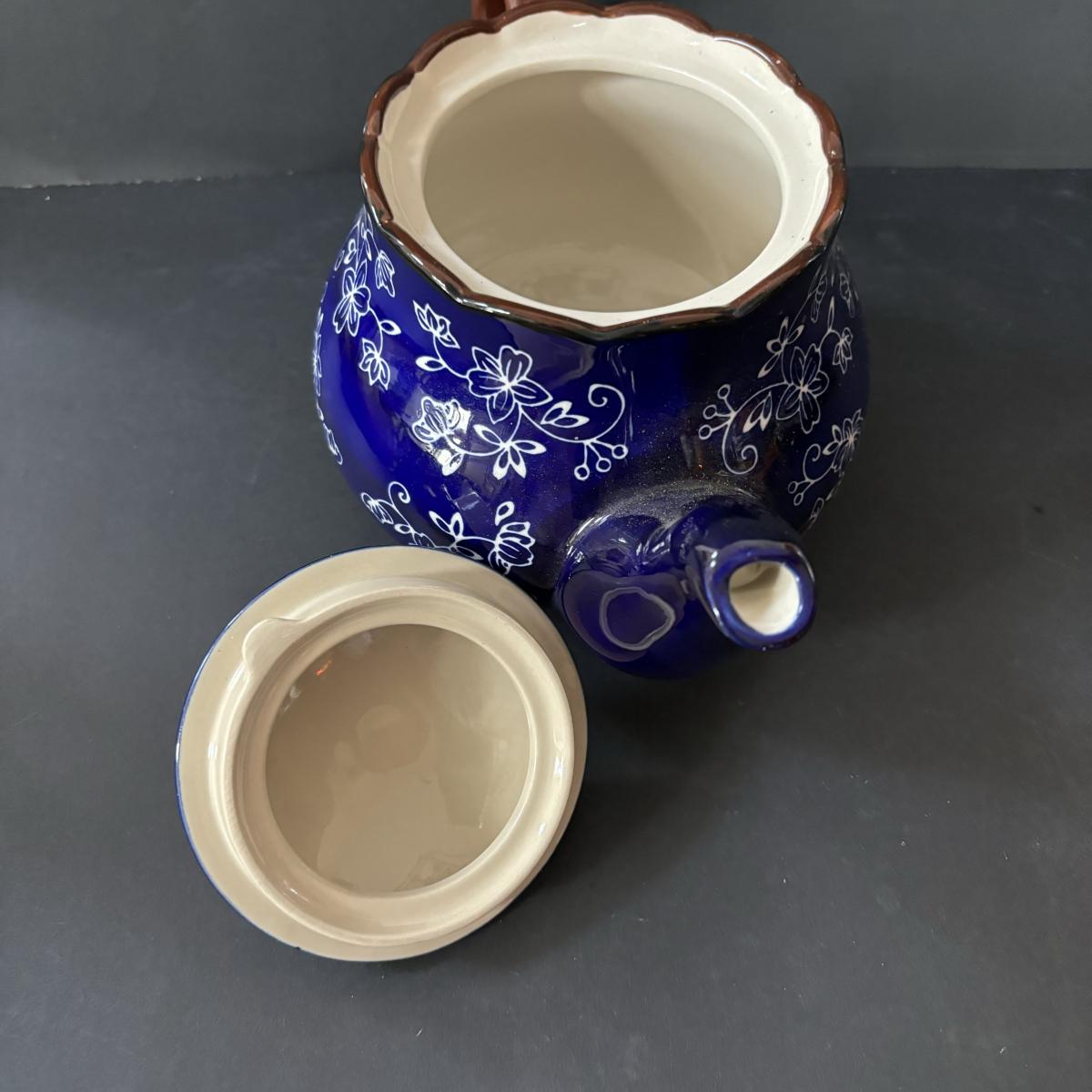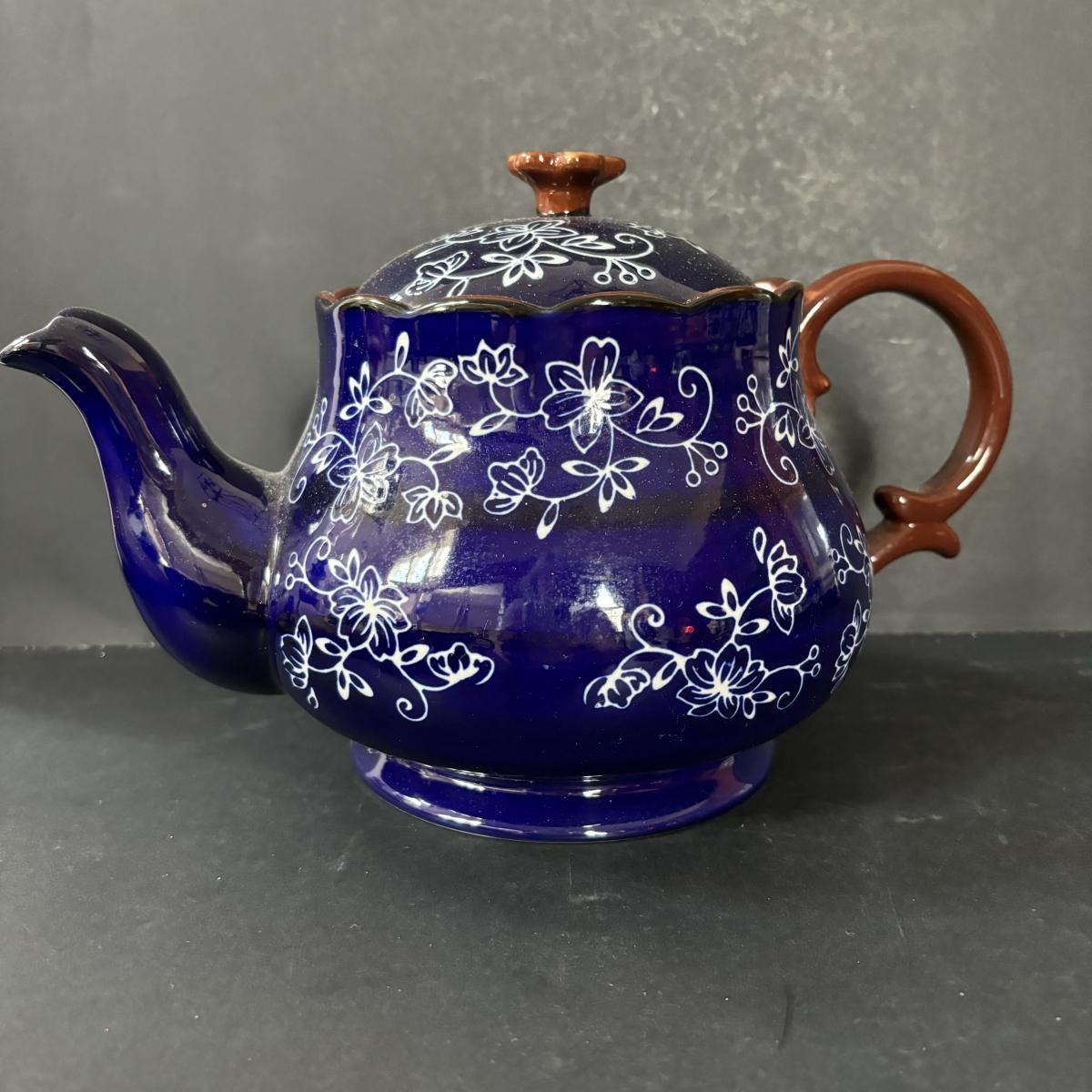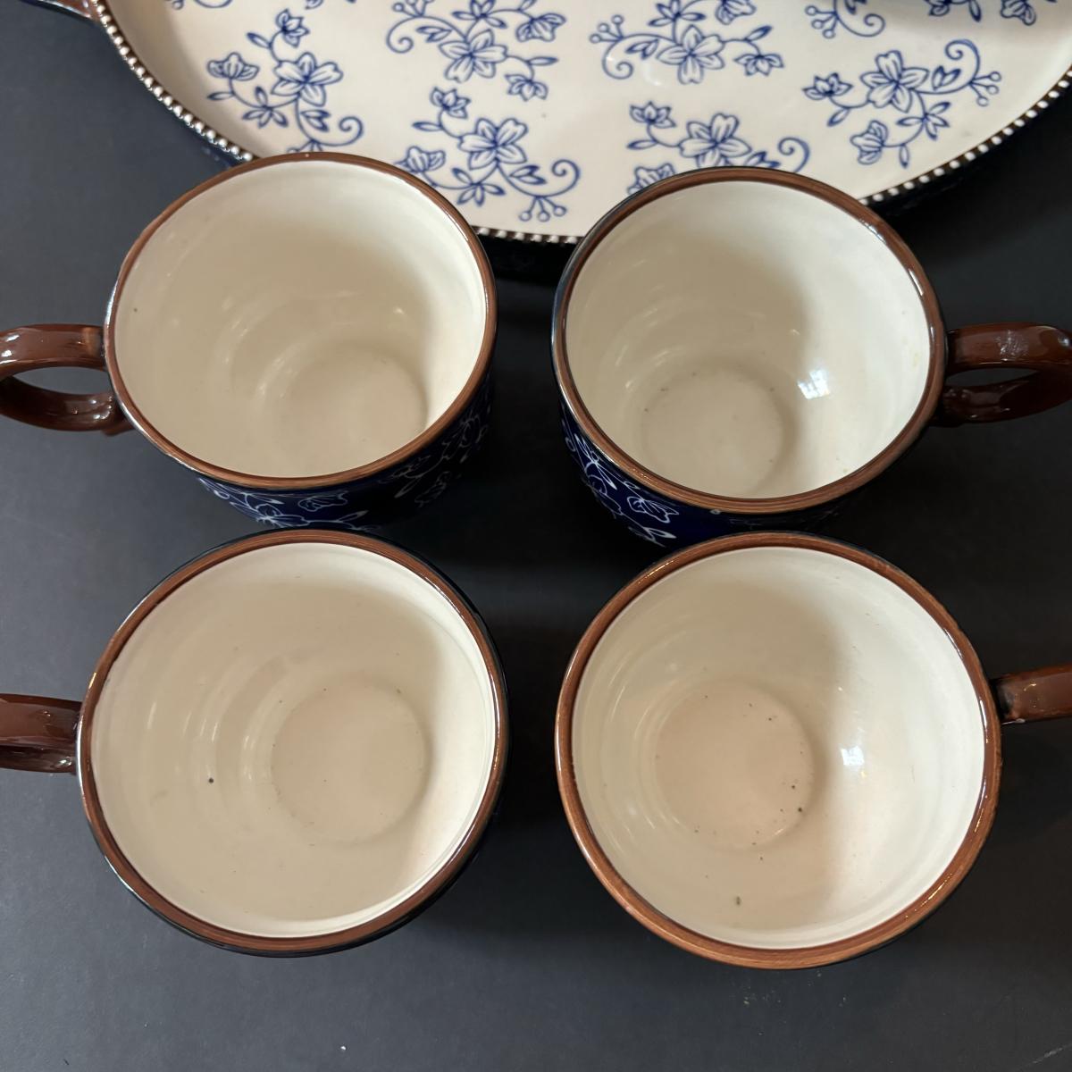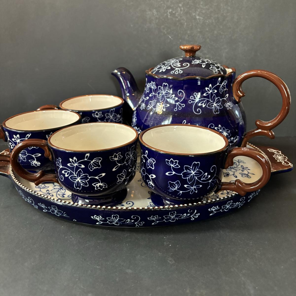 LOT 224: Temp-Tations by Tara Blue Floral Lace Tea Service for Four: Teapot, Cups & Serving Tray