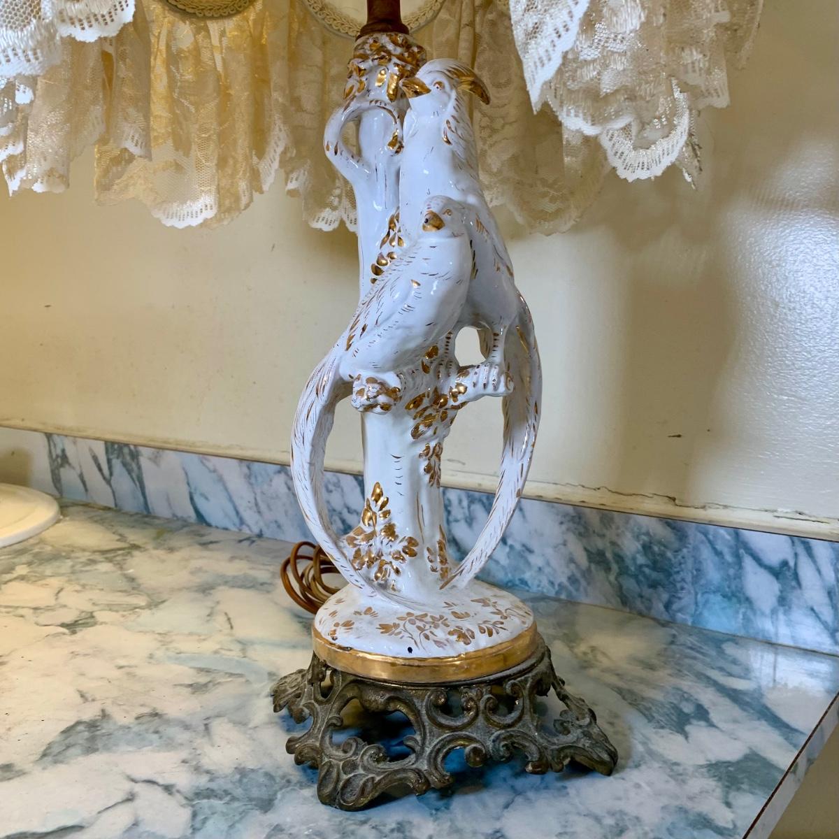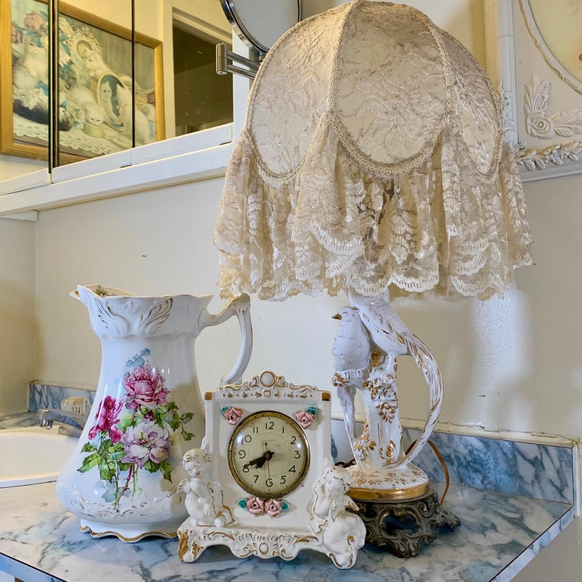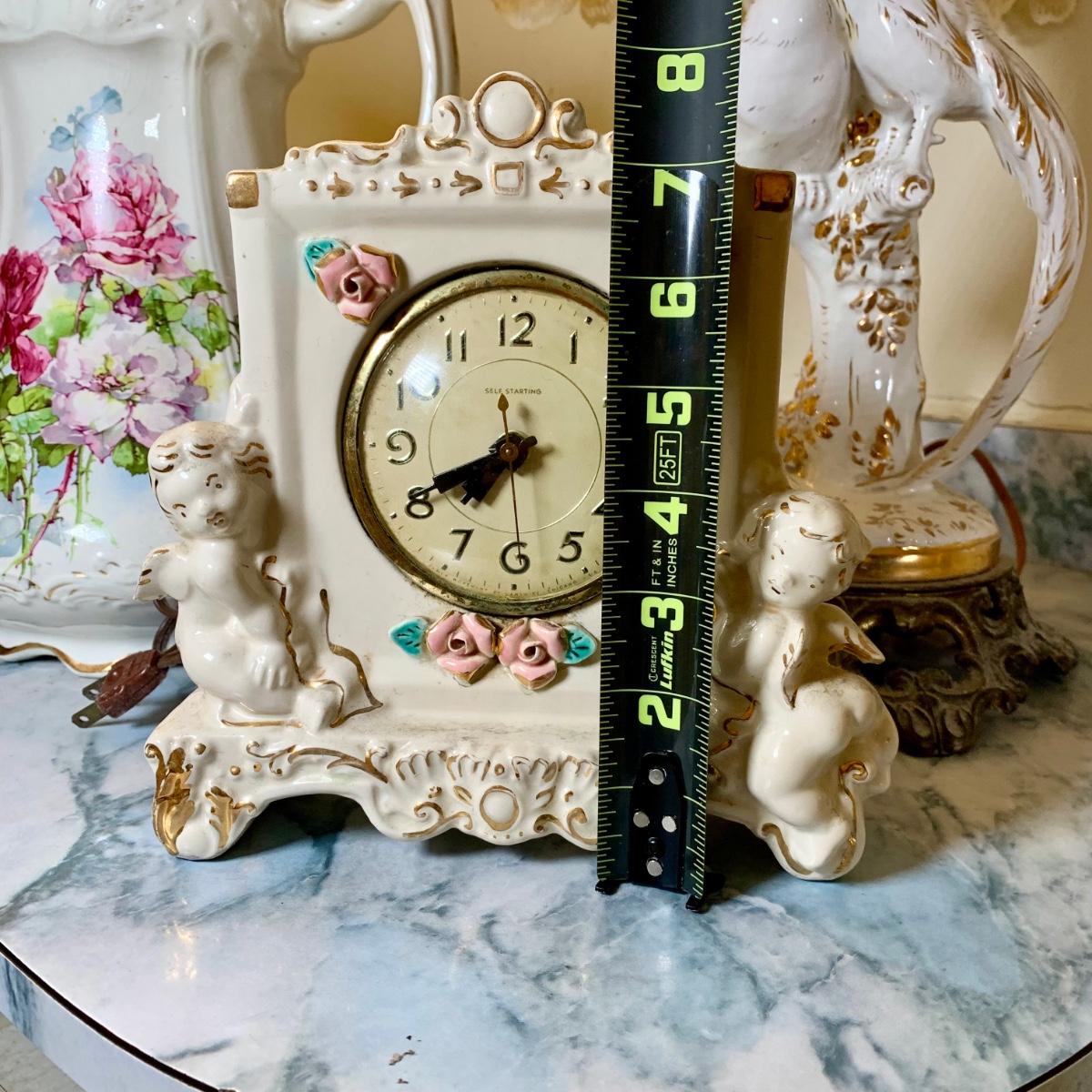 LOT 2 L: Marbro Lamp Co. Italian Porcelain Pheasant Lamp w/ Lace Lampshade, Lanshire Porcelain Self Starting Cherub & Rose Mantel Clock, & More