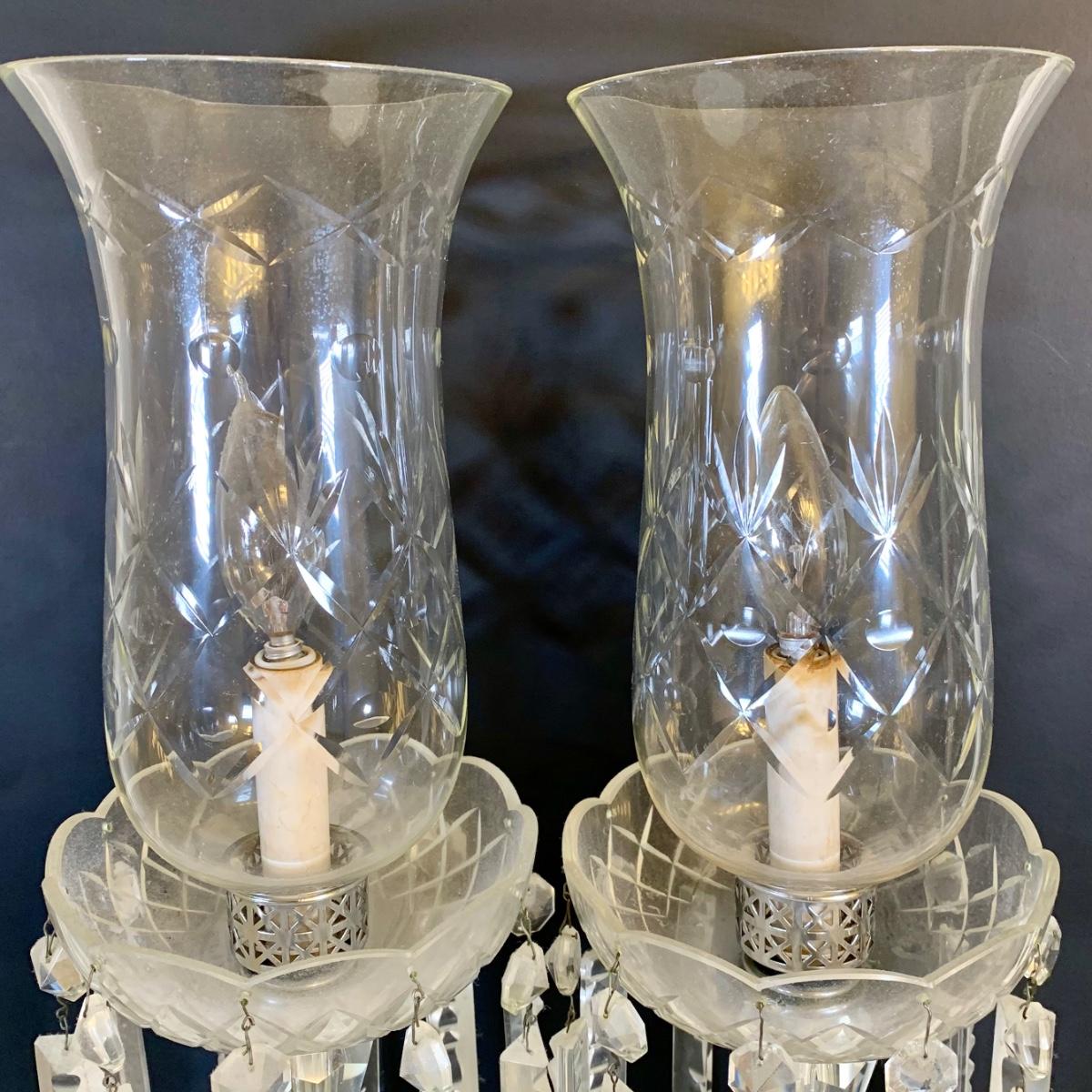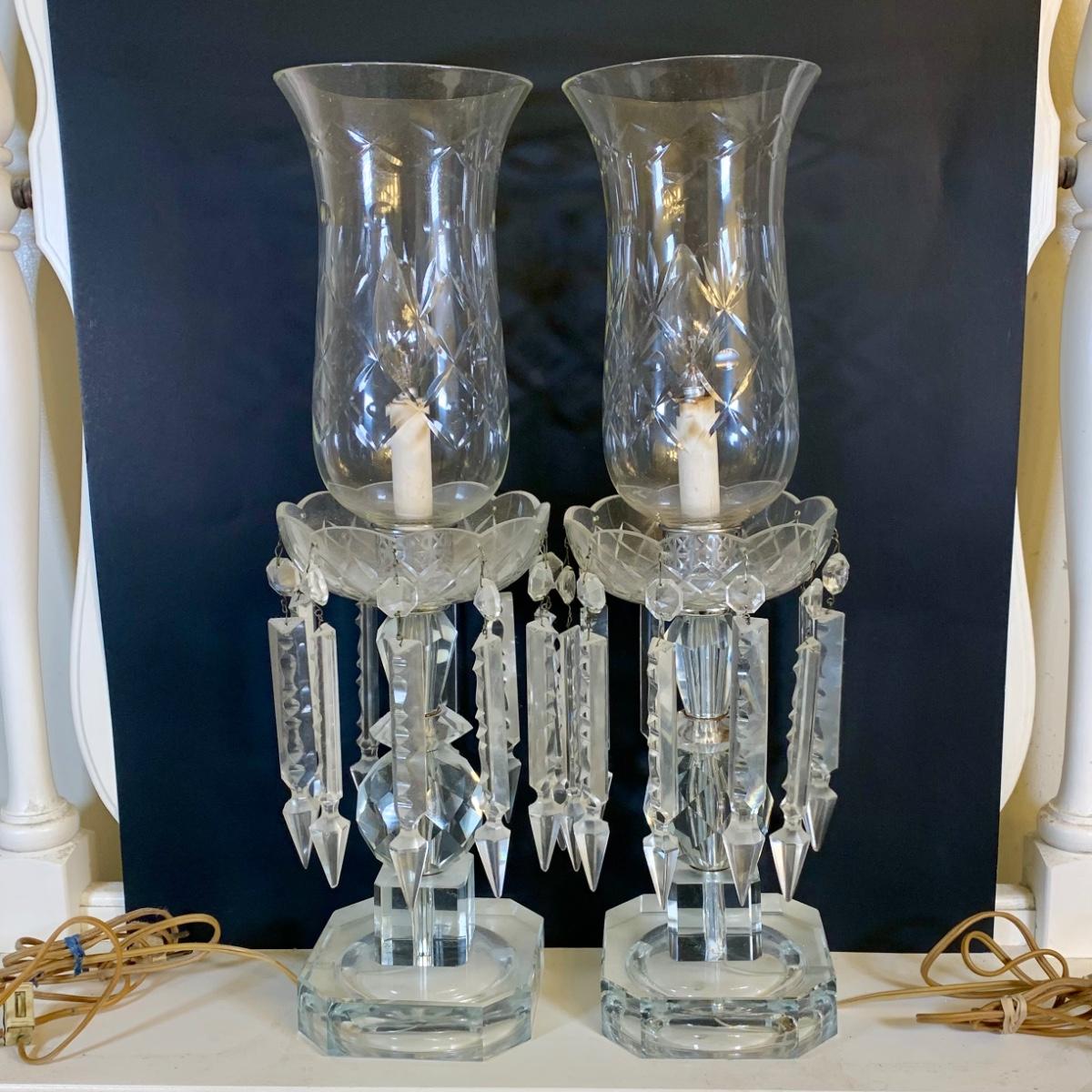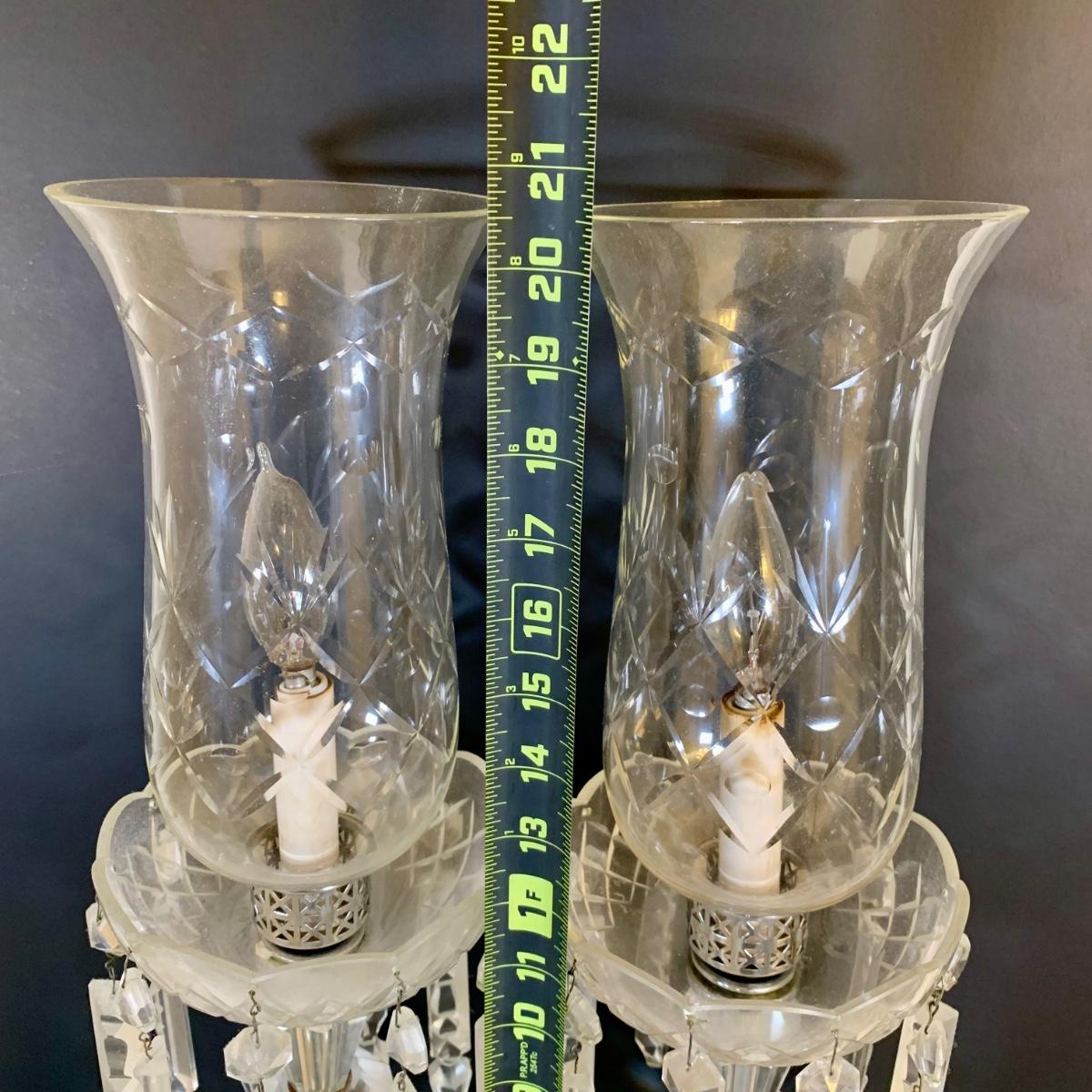 LOT 4 L: Vintage Pair of Cut Crystal Hurricane Lamps w/ Hanging Prisms