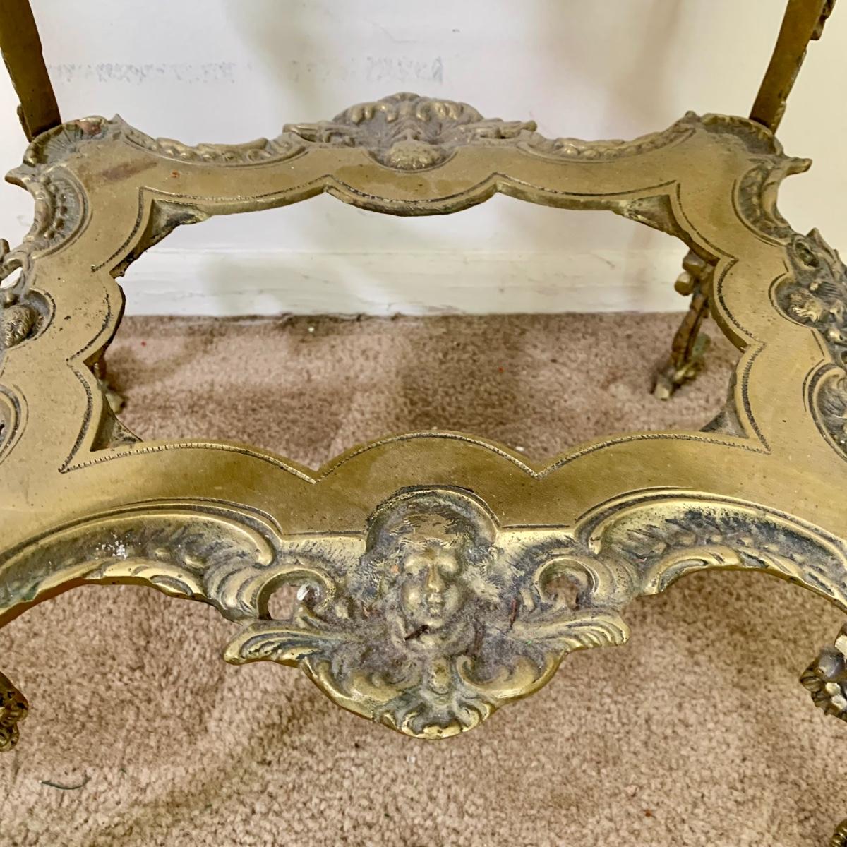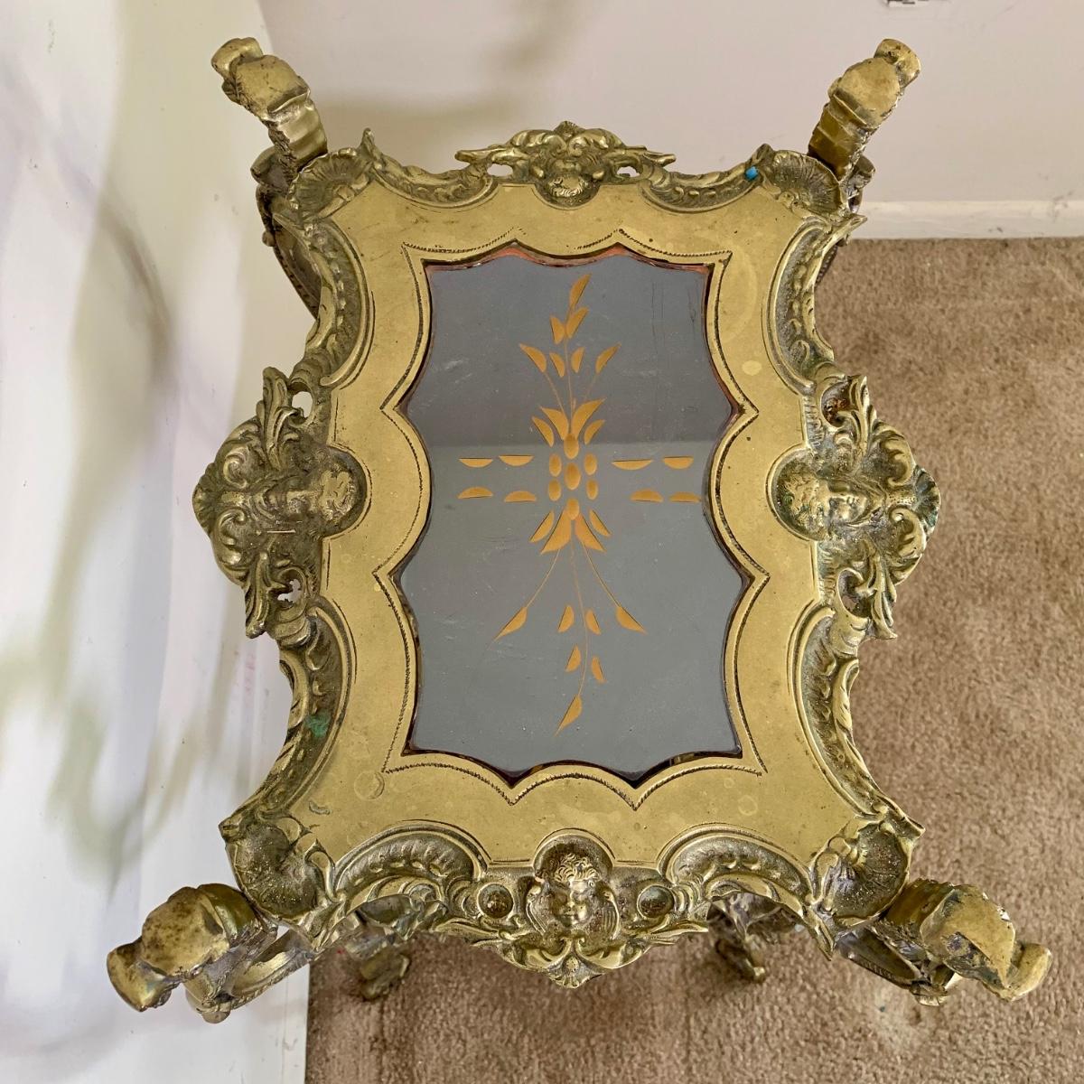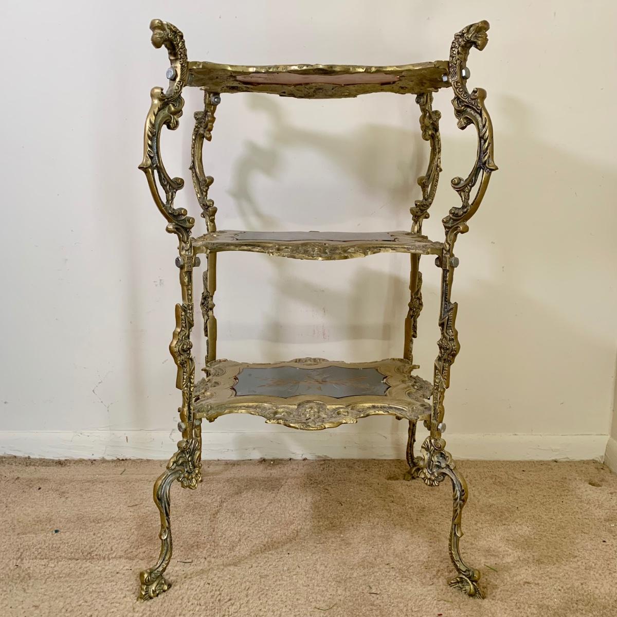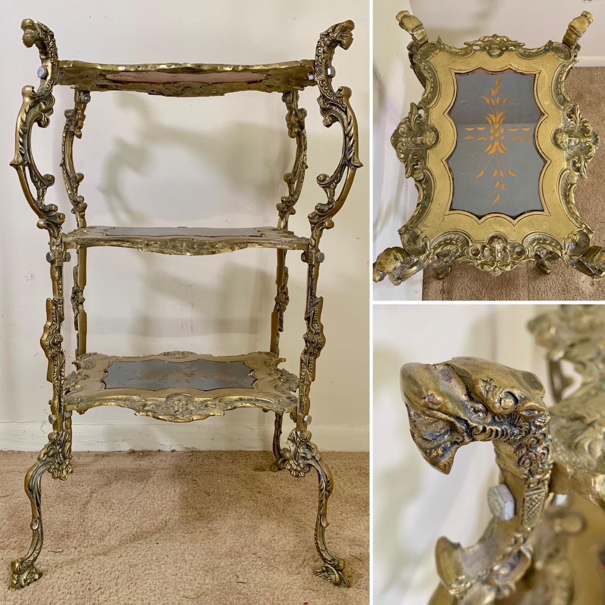LOT 16 L: Gorgeous Ornate Victorian 3 Tier Brass End Table featuring Dragons, Cherubs, & Removable Mirrored Inlays