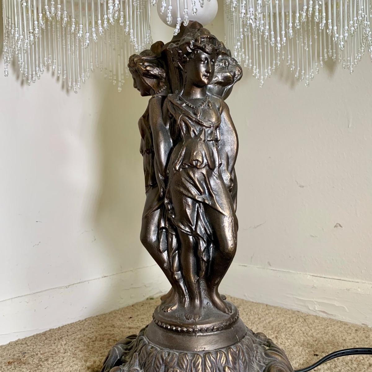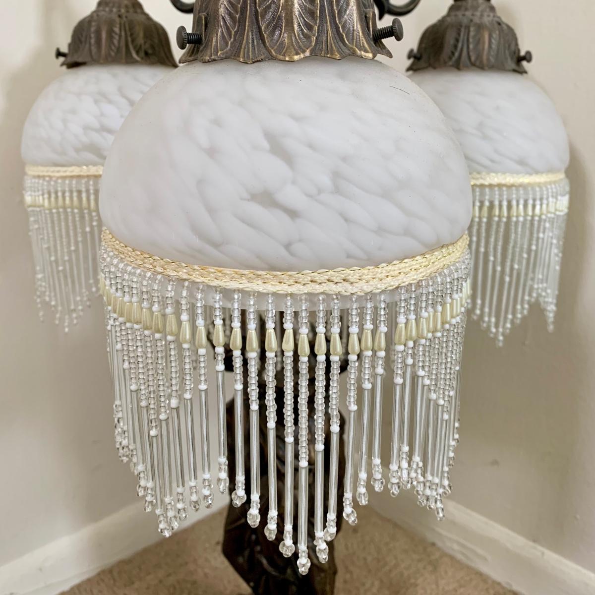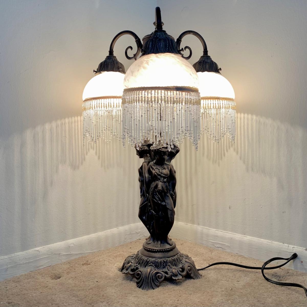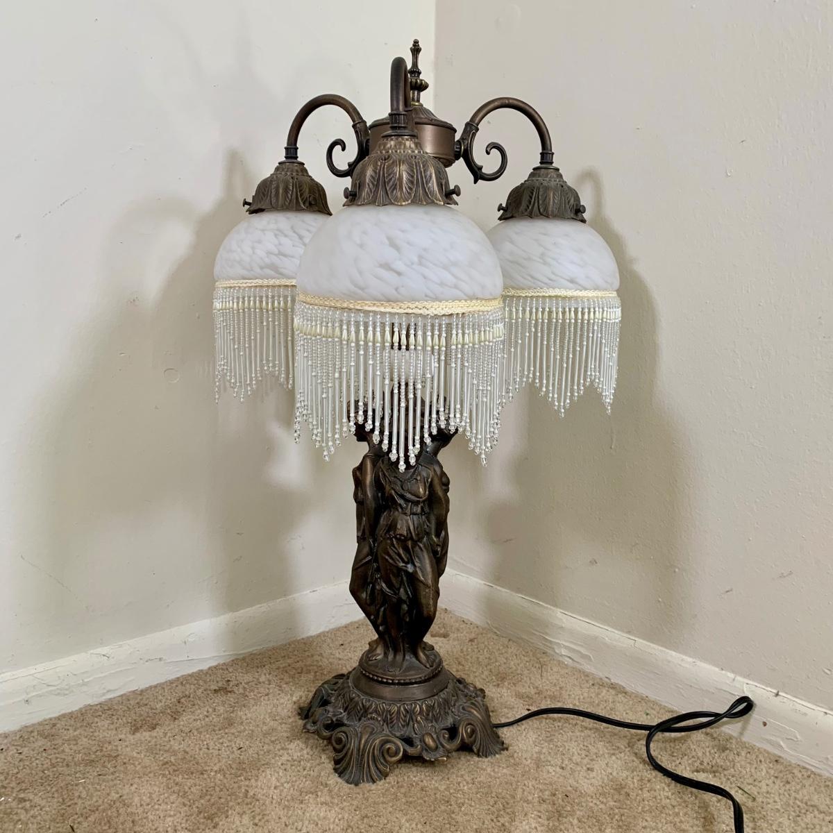 LOT 20 L: Stunning Meyda Tiffany "3 Graces" Trio Light Table Lamp w/ Dappled Glass & Beaded Fringe Shades