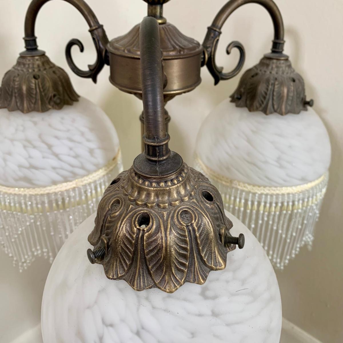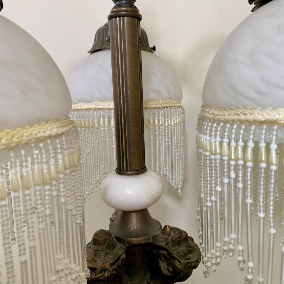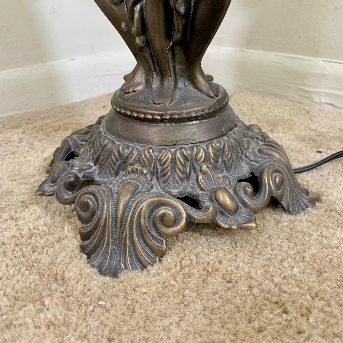 LOT 20 L: Stunning Meyda Tiffany "3 Graces" Trio Light Table Lamp w/ Dappled Glass & Beaded Fringe Shades