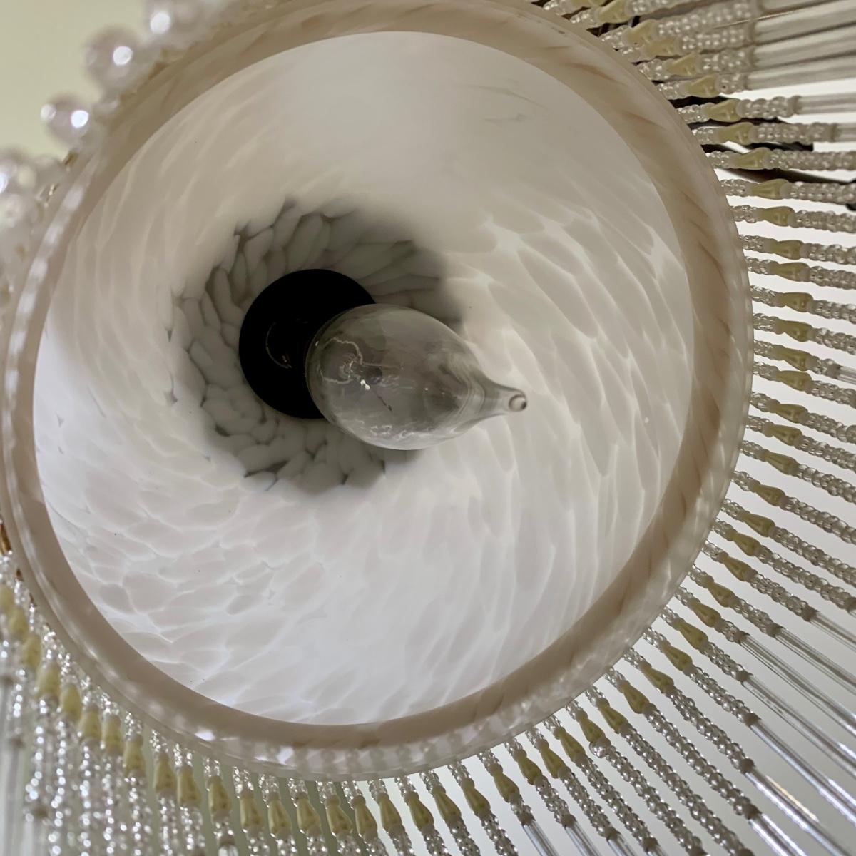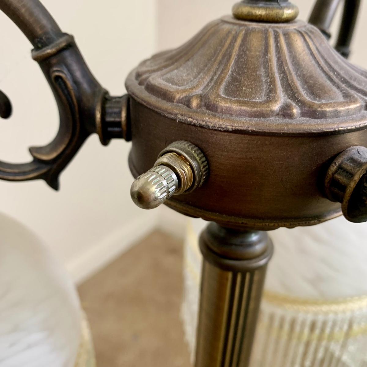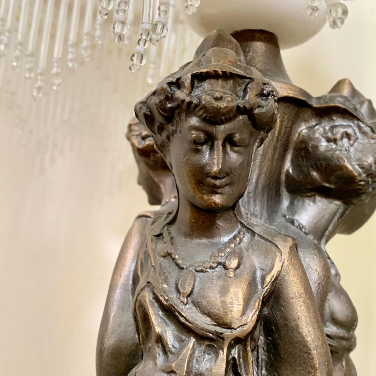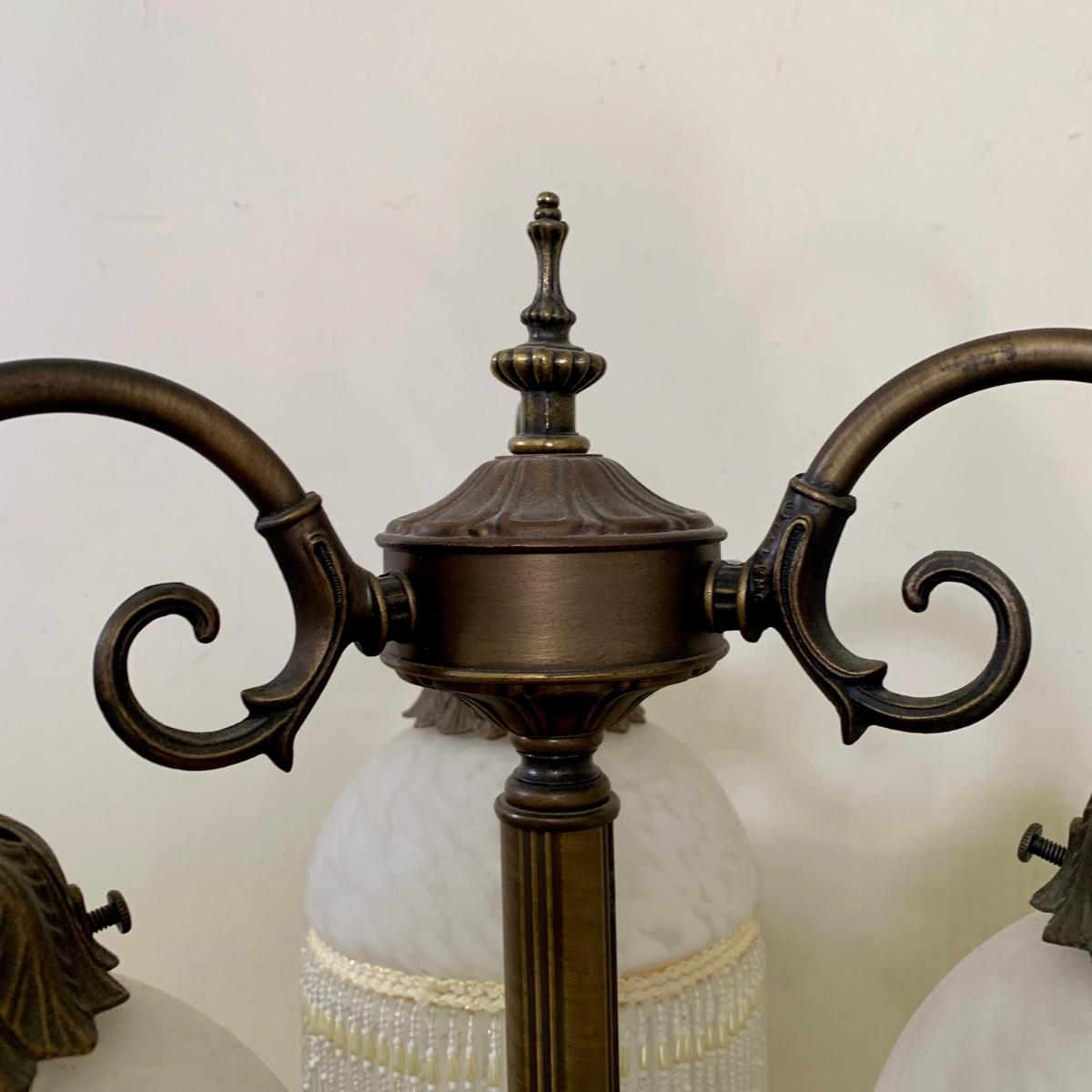 LOT 20 L: Stunning Meyda Tiffany "3 Graces" Trio Light Table Lamp w/ Dappled Glass & Beaded Fringe Shades