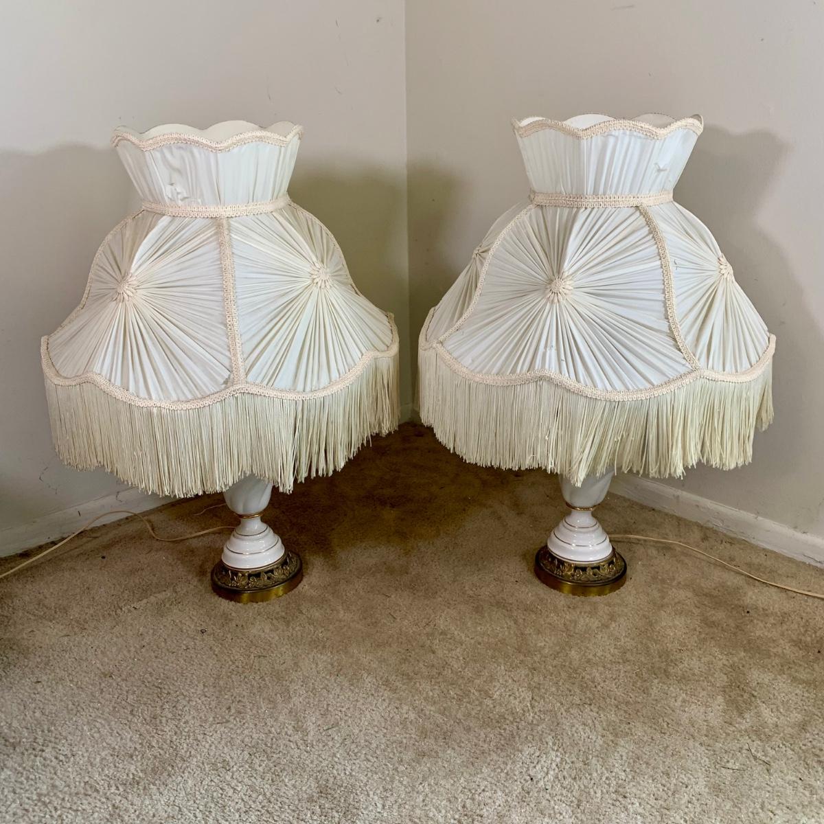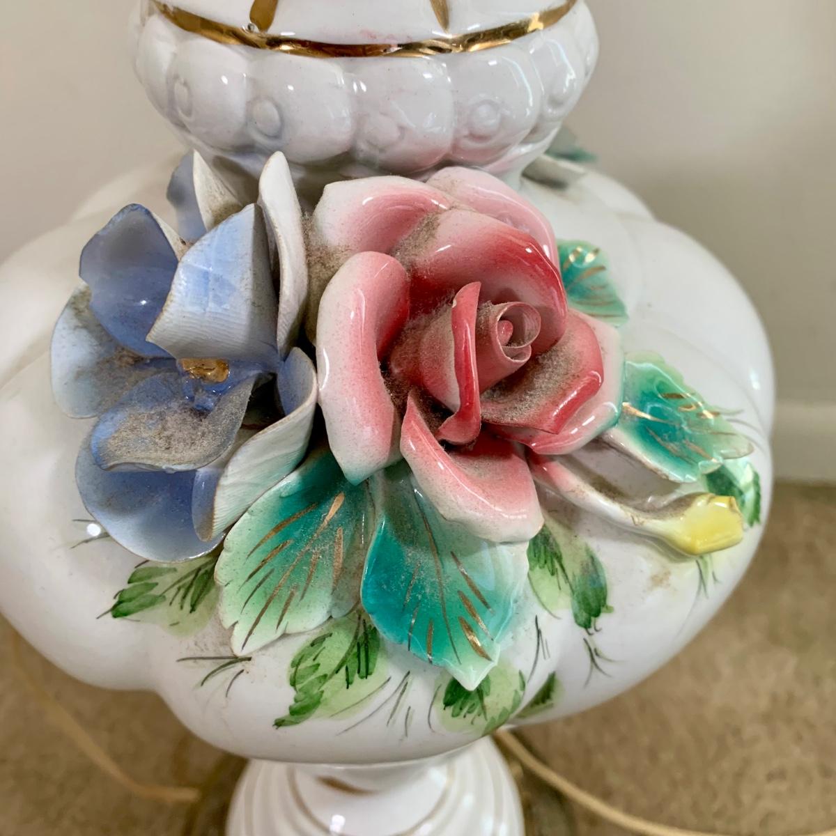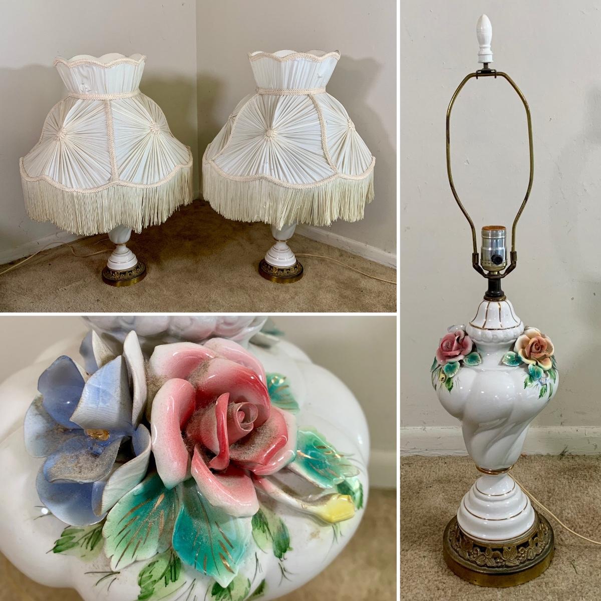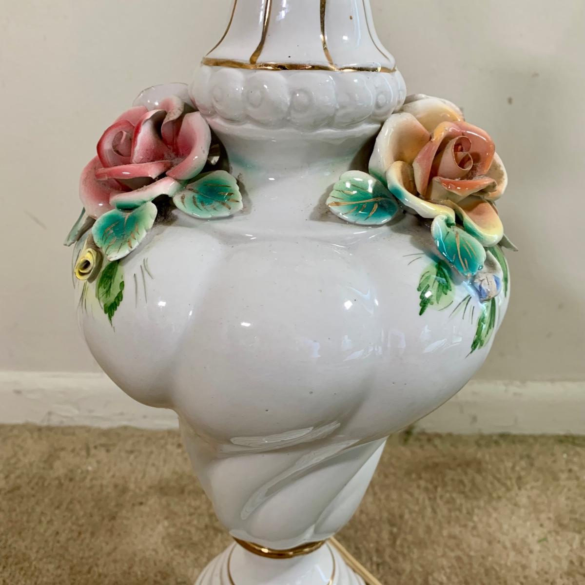 LOT 26 L: Pair of Capodimonte Style Floral Spiral Urn Lamps w/ Large Fringed Shades