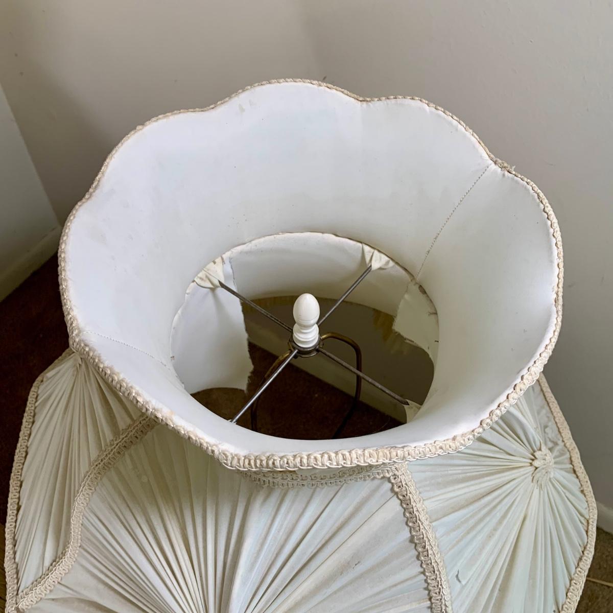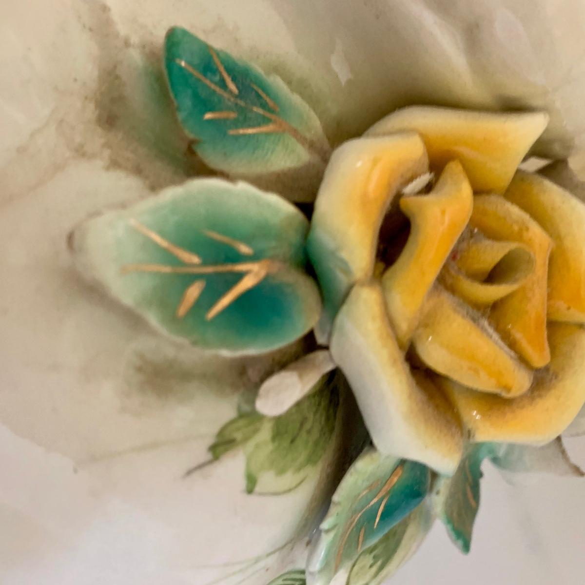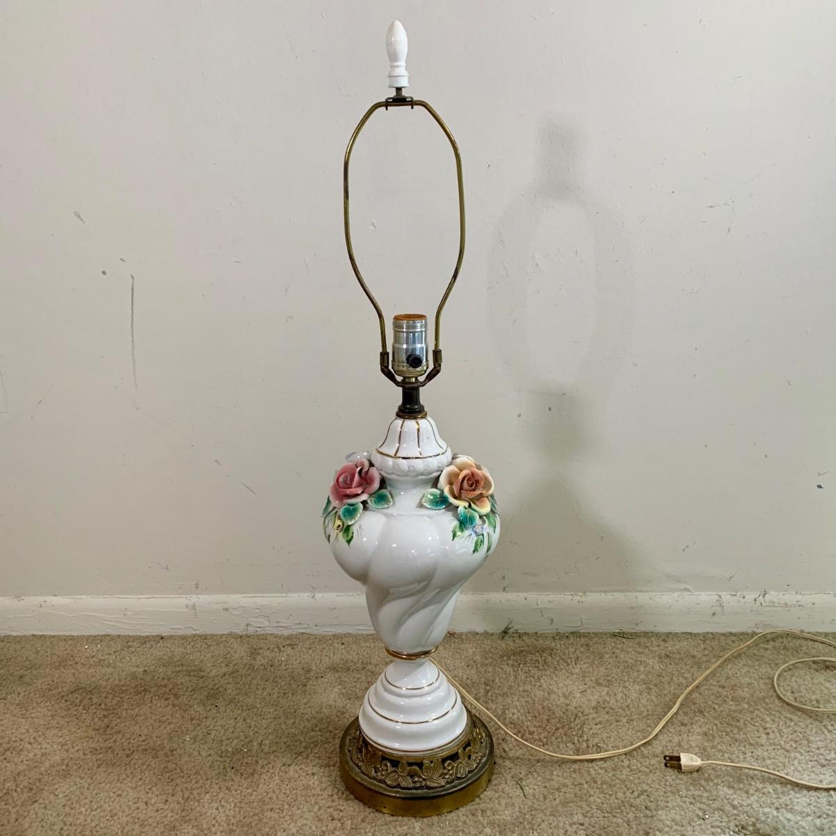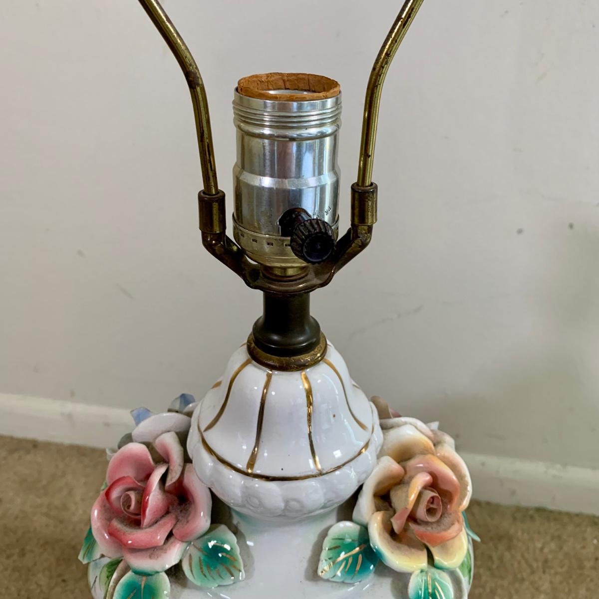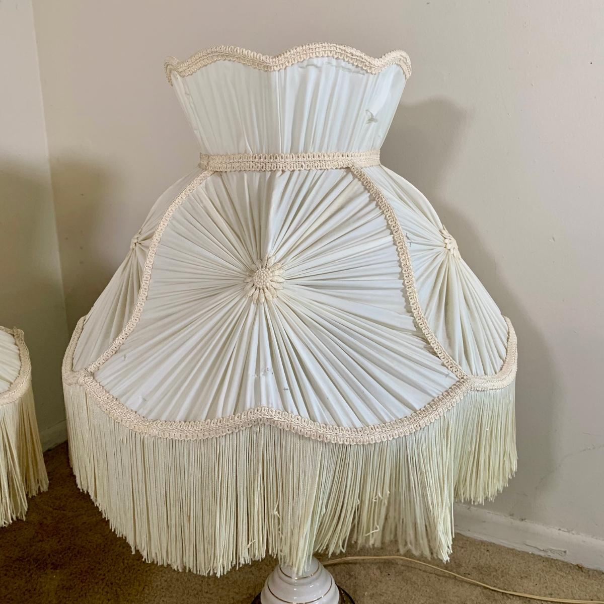 LOT 26 L: Pair of Capodimonte Style Floral Spiral Urn Lamps w/ Large Fringed Shades