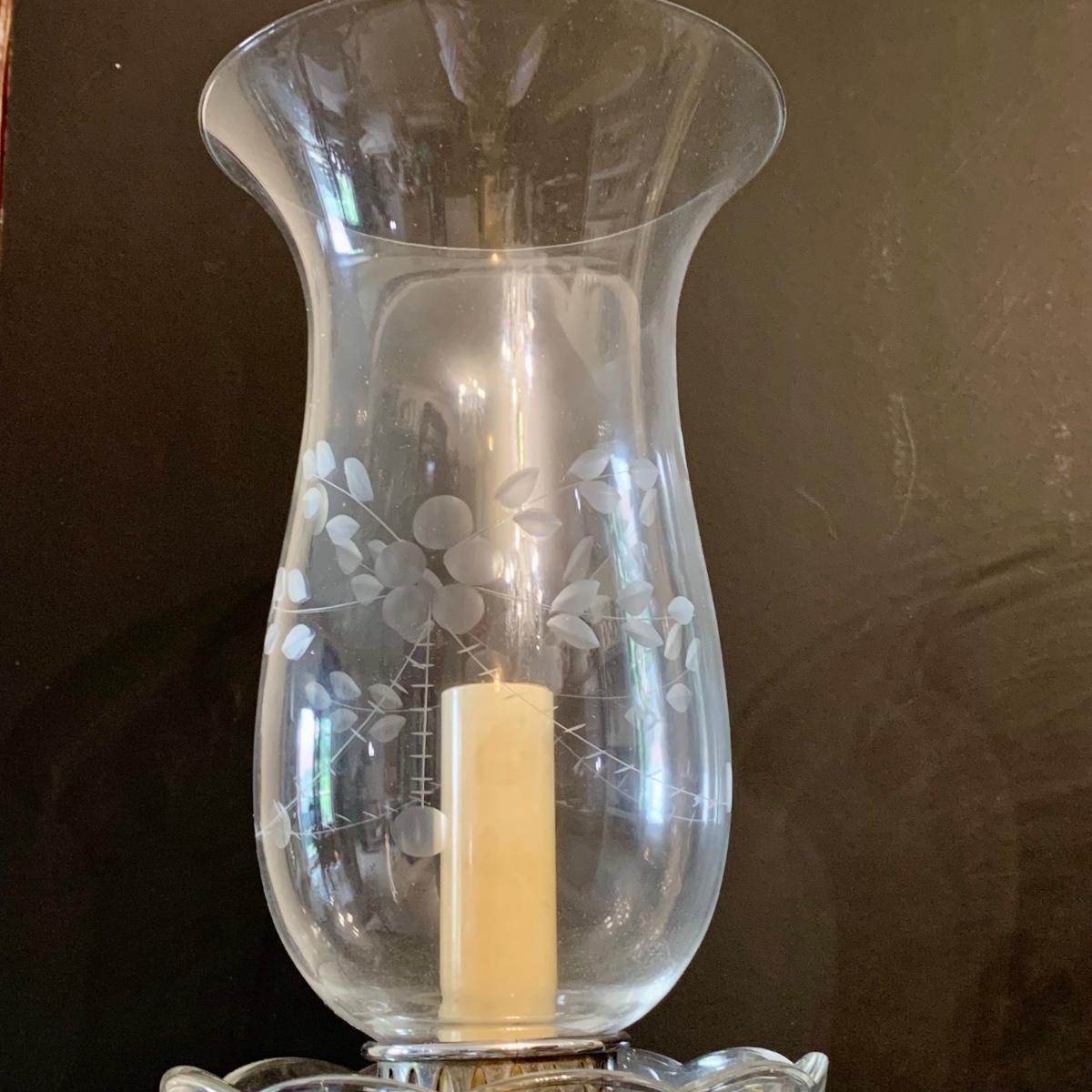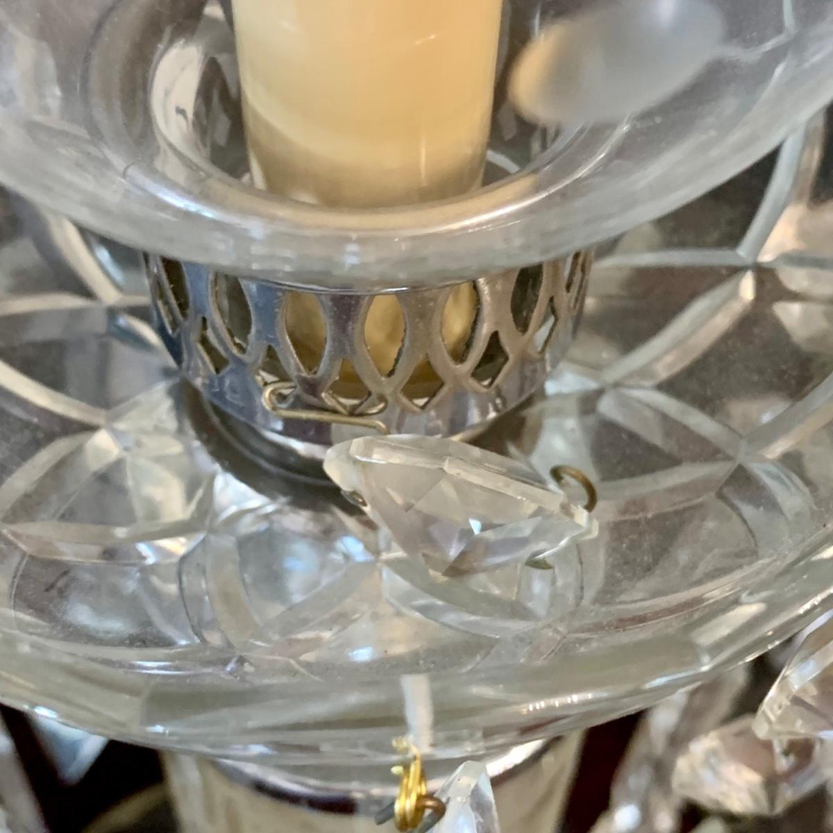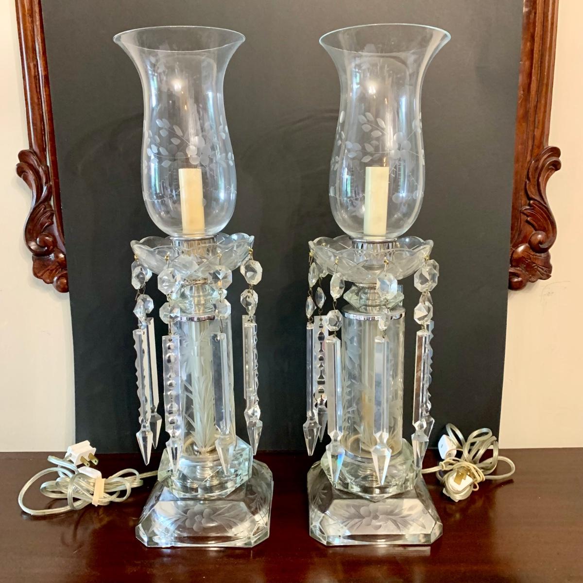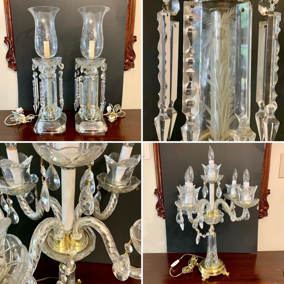 LOT 29 L: Vintage Pair of Etched Glass Hurricane Lamps w/ Hanging Prisms & Chandelier Style Candle Stick Cut Crystal 4 Armed Table Lamp w/ Brass Base