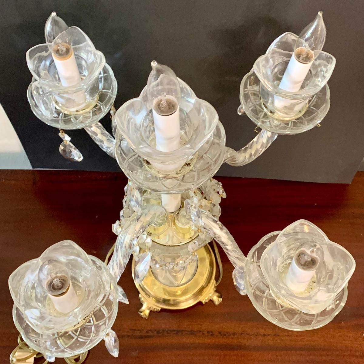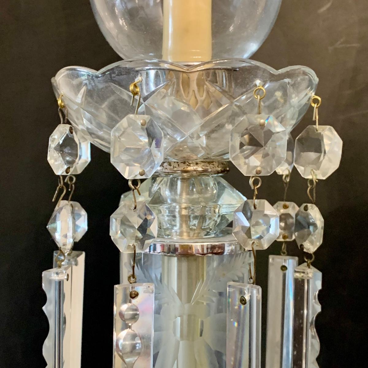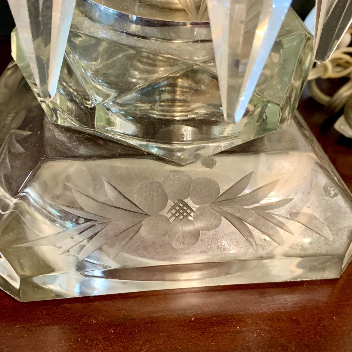 LOT 29 L: Vintage Pair of Etched Glass Hurricane Lamps w/ Hanging Prisms & Chandelier Style Candle Stick Cut Crystal 4 Armed Table Lamp w/ Brass Base