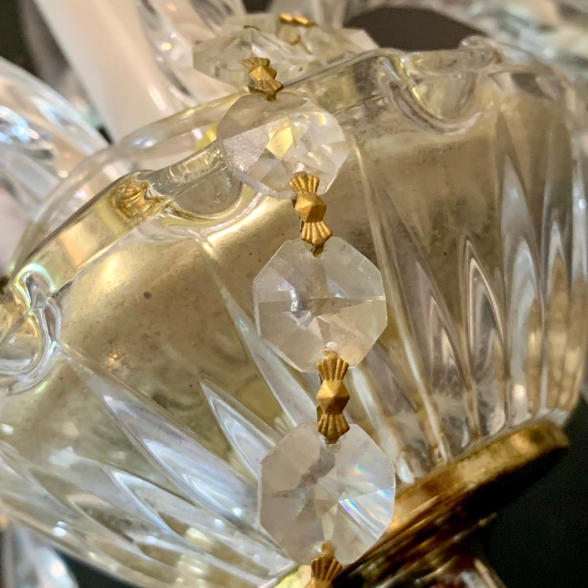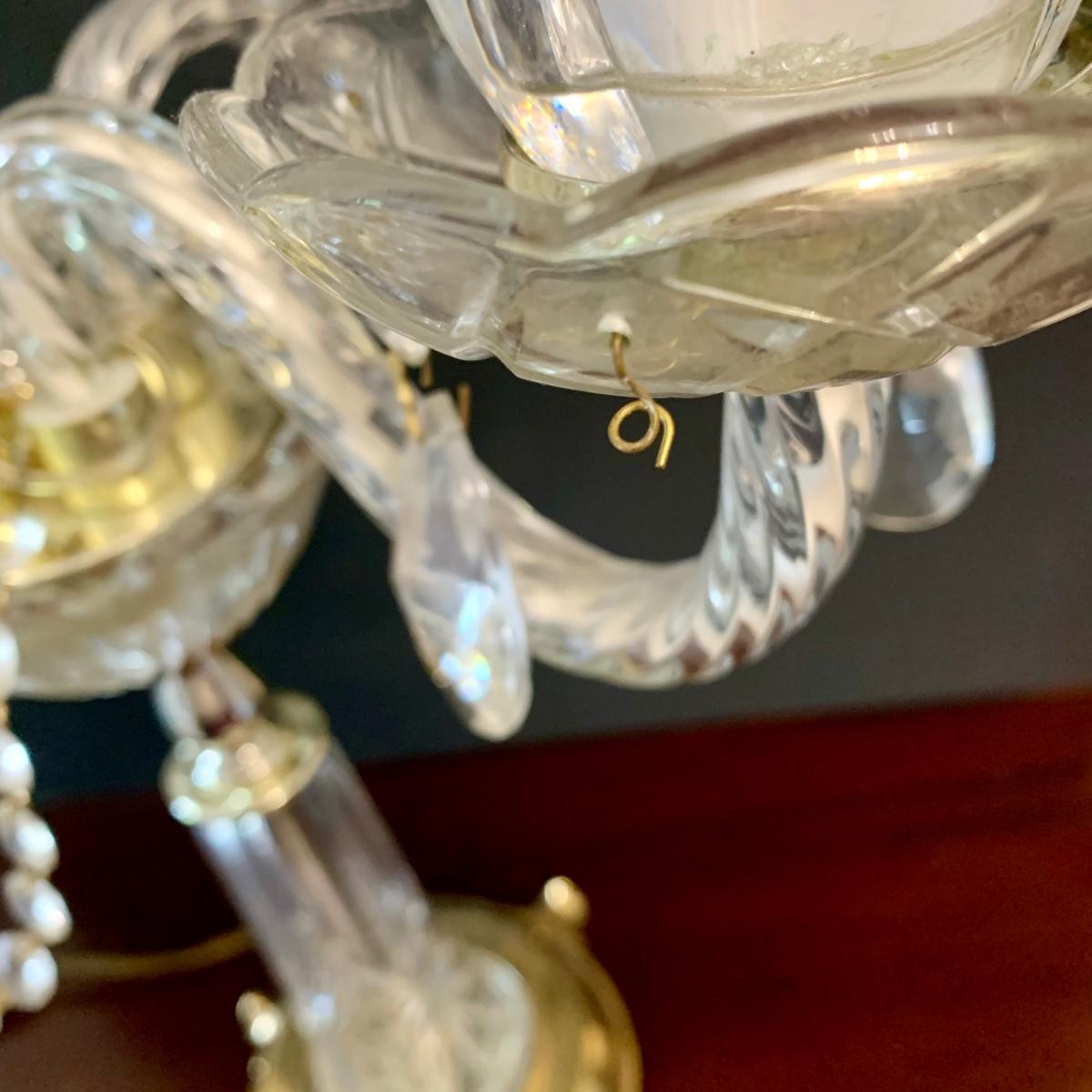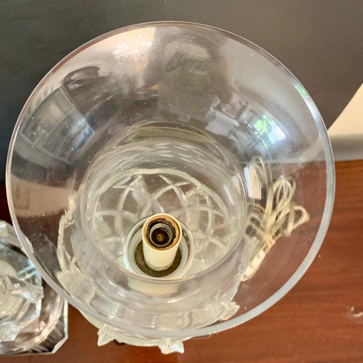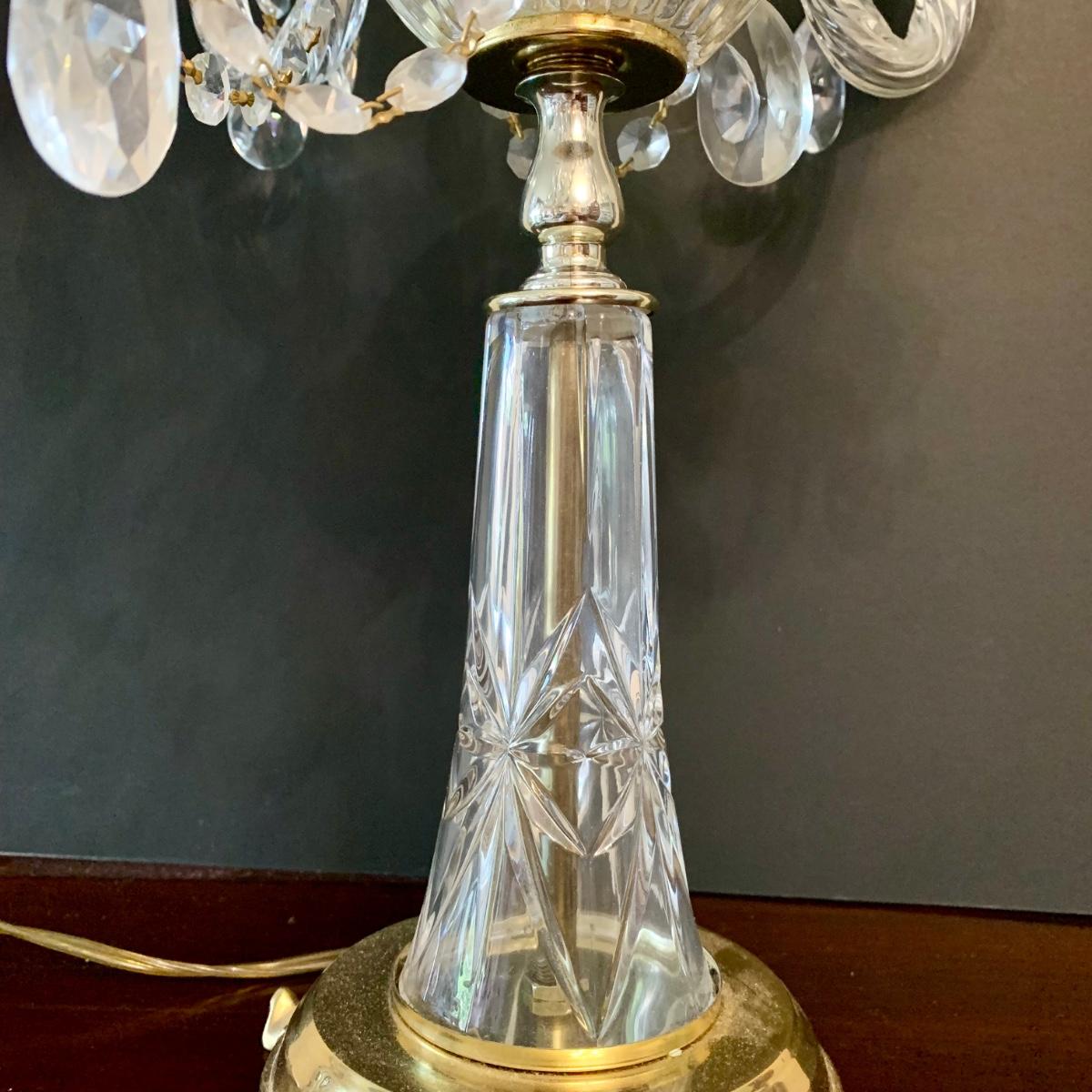 LOT 29 L: Vintage Pair of Etched Glass Hurricane Lamps w/ Hanging Prisms & Chandelier Style Candle Stick Cut Crystal 4 Armed Table Lamp w/ Brass Base
