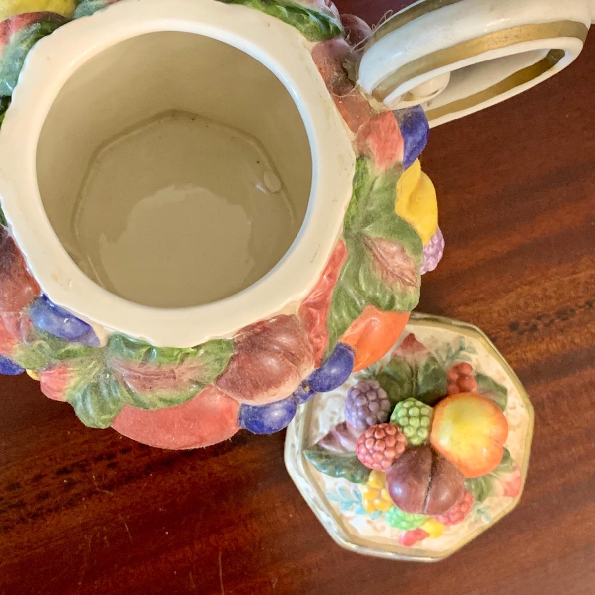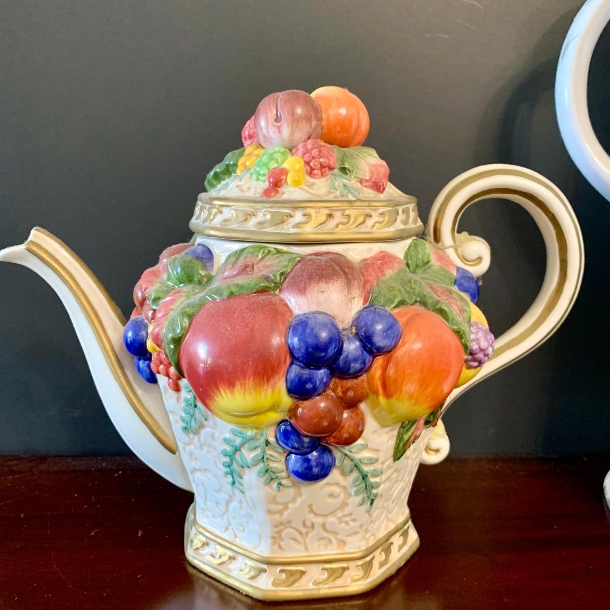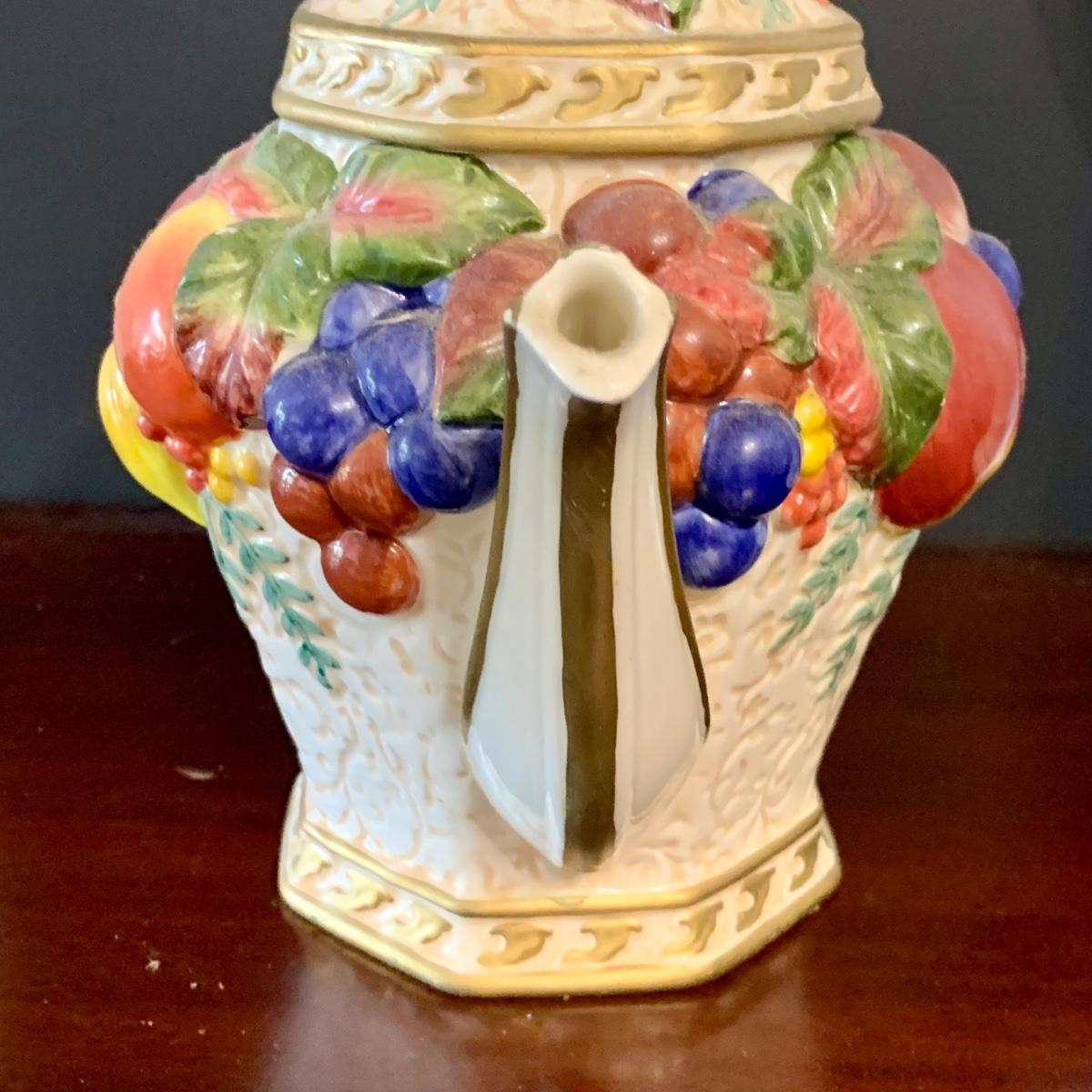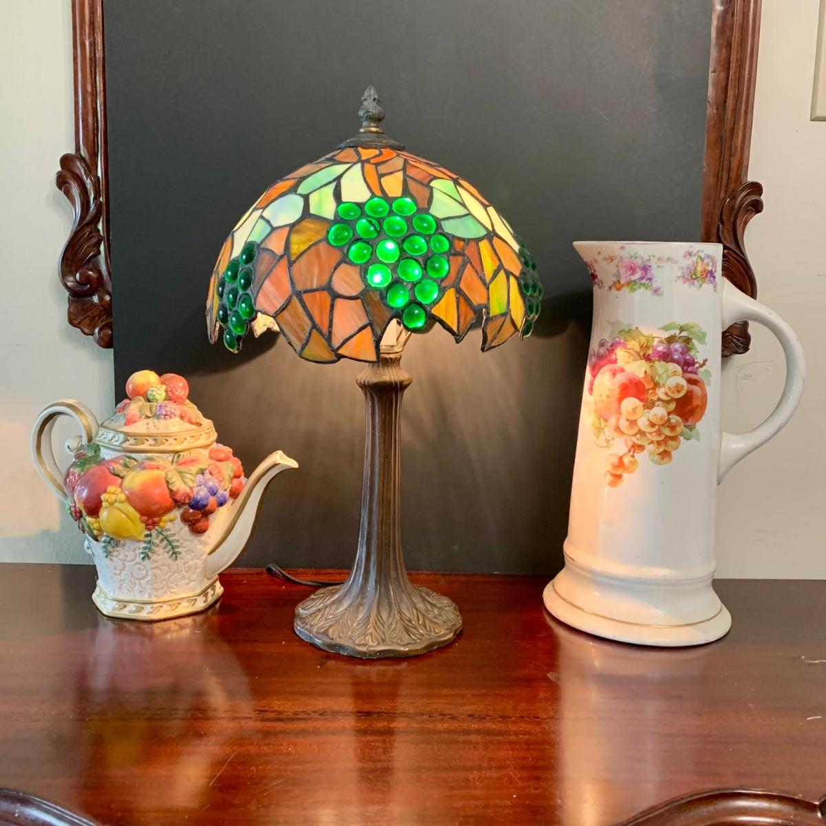LOT 32 L: Tiffany Style Stained Glass Grapes Table Lamp, Lebeau Porcelaine Fruit & Flower Tall Pitcher, & Fitz & Floyd Fruit Teapot