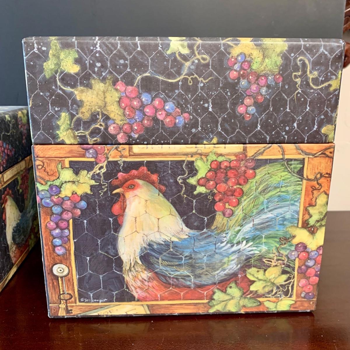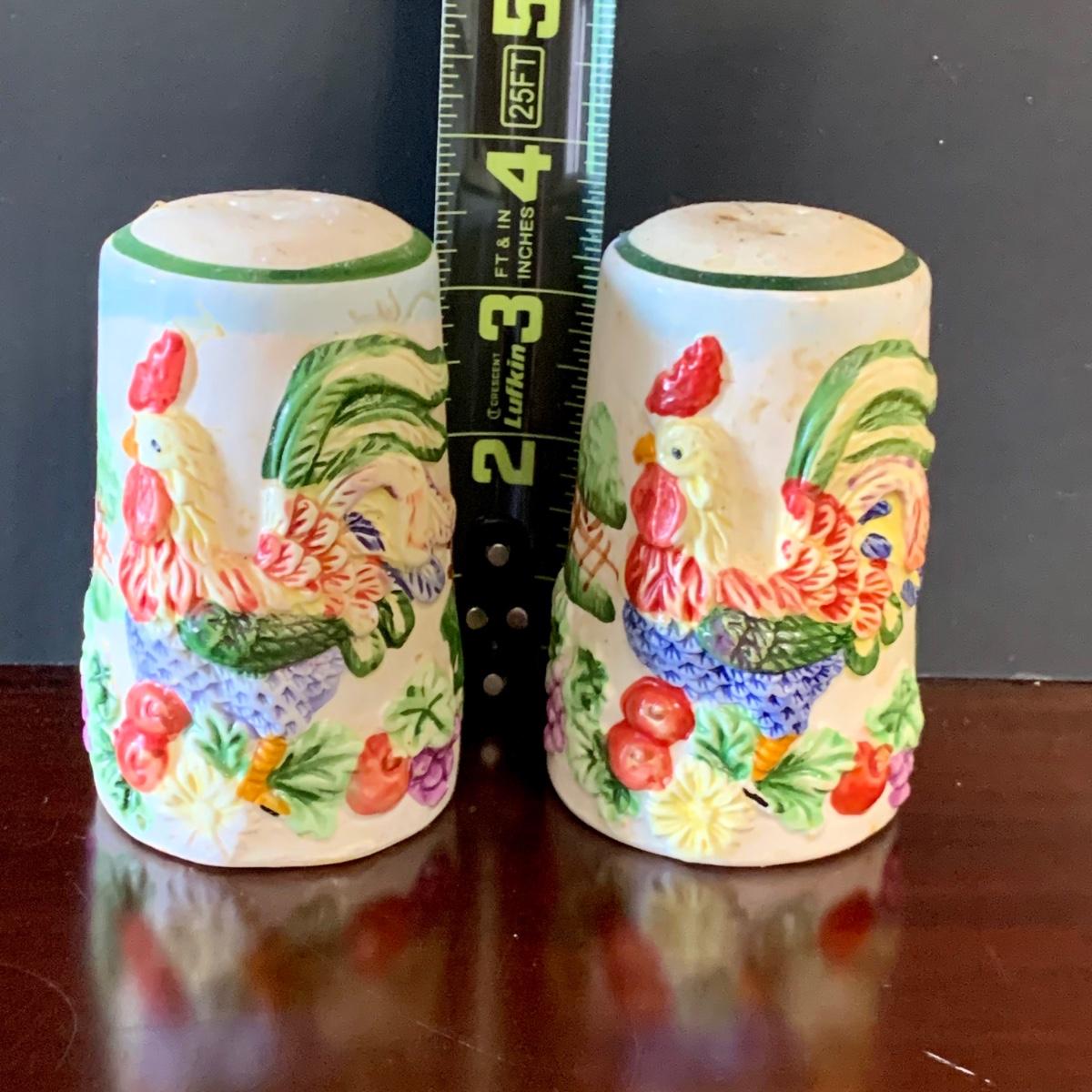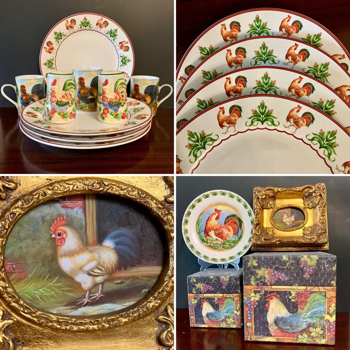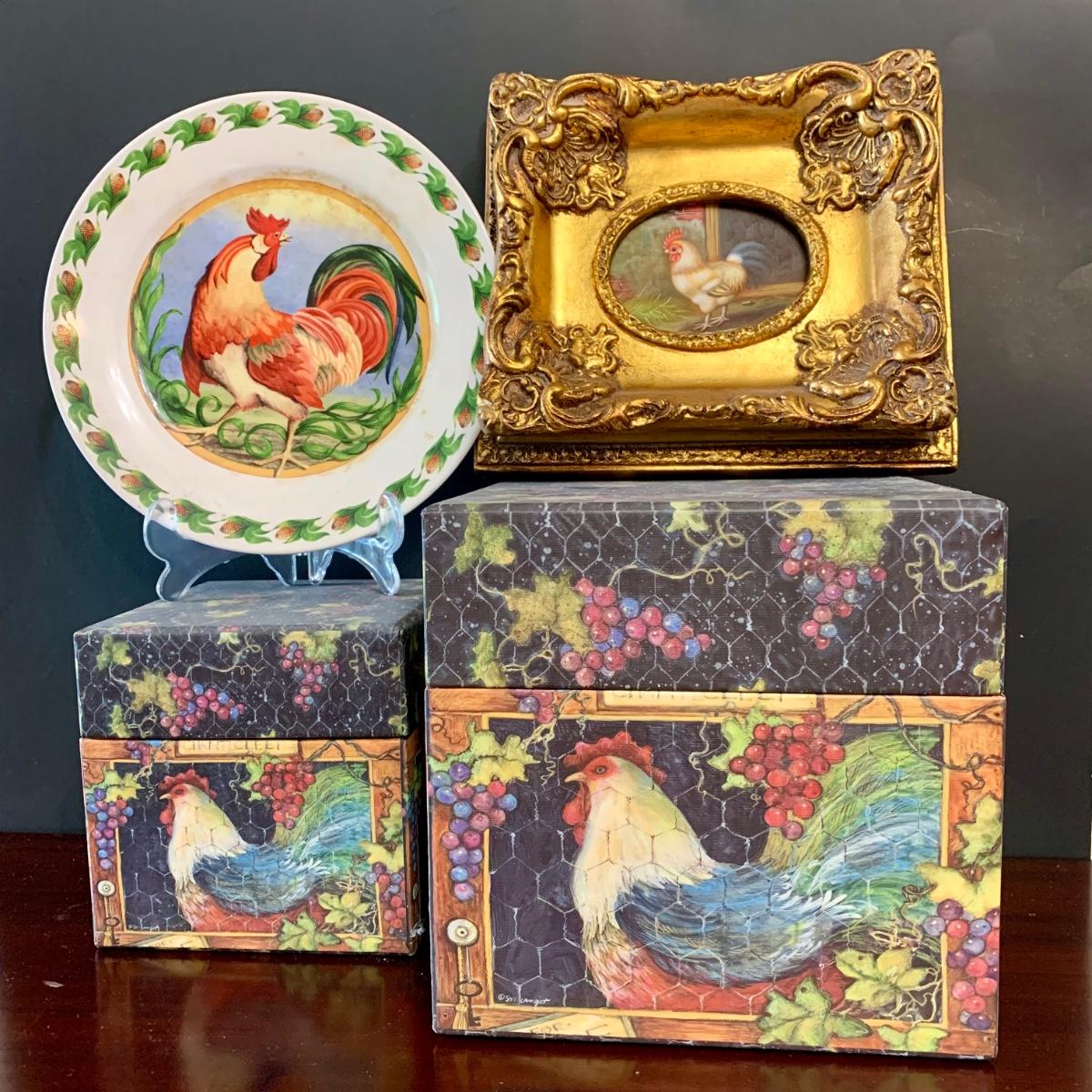 LOT 34 K: Rooster Collection: "Country Gate" Enesco Plates, "Rooster" Dept 56 Mugs, Salt & Pepper Shakers, Stacking Boxes, & Small Gilded Frame Rooster Painting