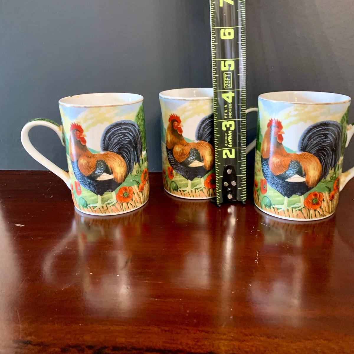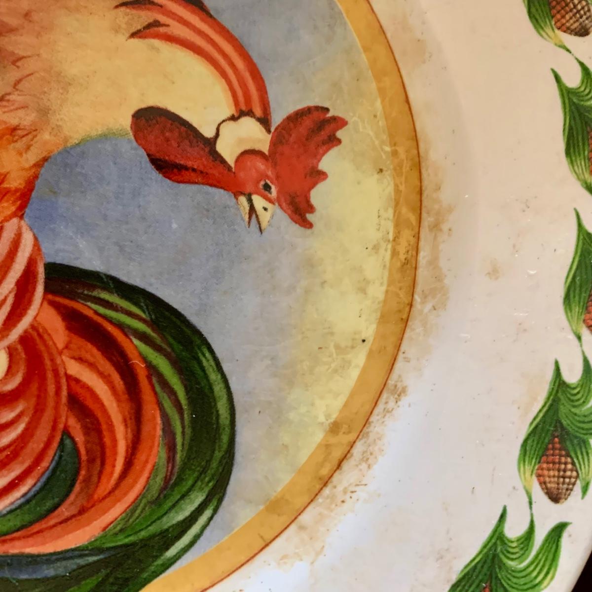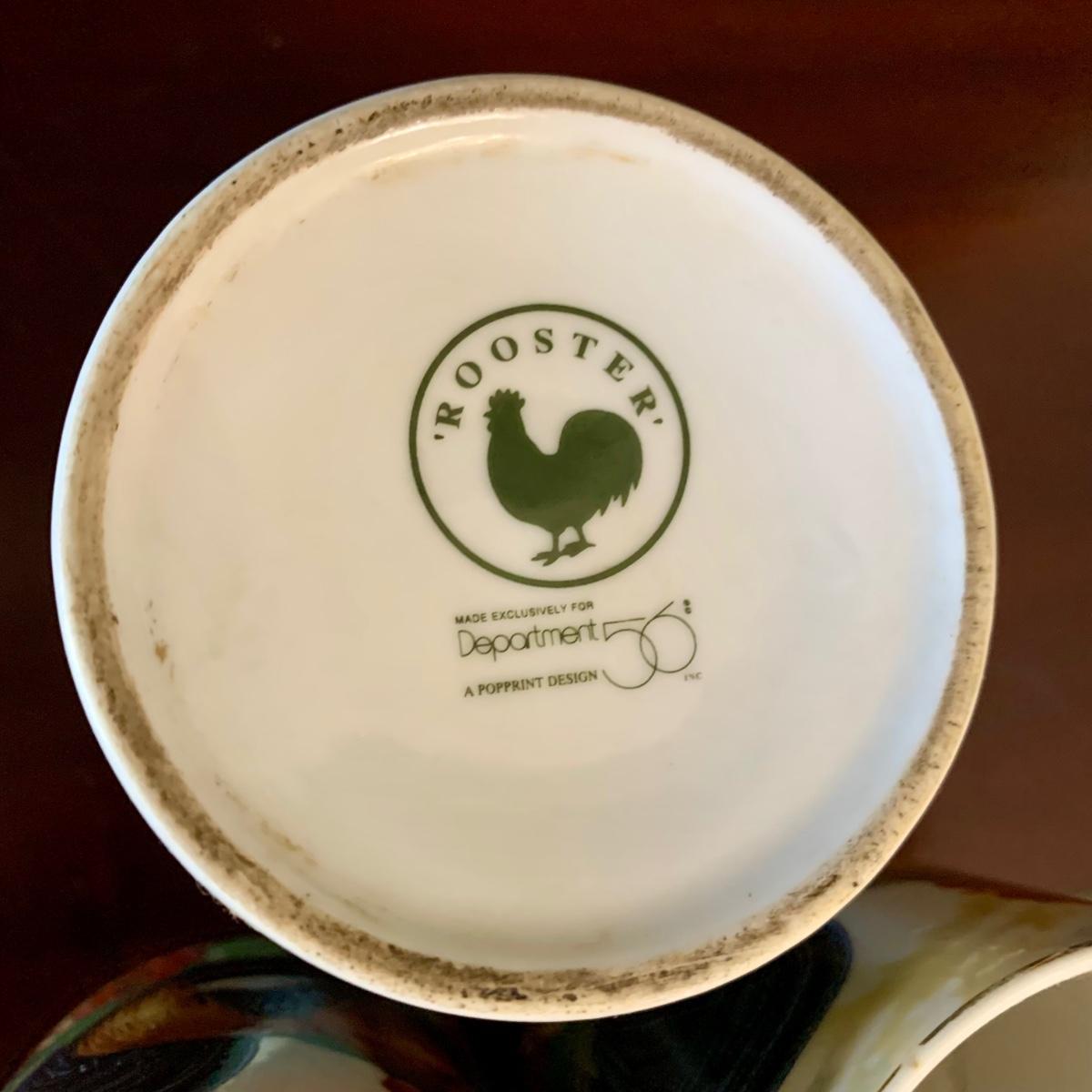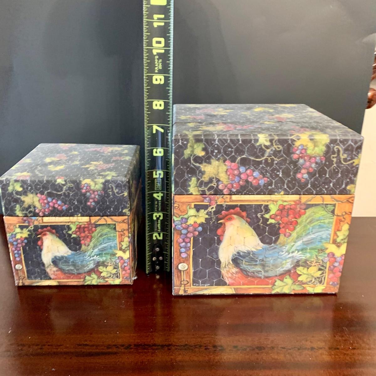 LOT 34 K: Rooster Collection: "Country Gate" Enesco Plates, "Rooster" Dept 56 Mugs, Salt & Pepper Shakers, Stacking Boxes, & Small Gilded Frame Rooster Painting