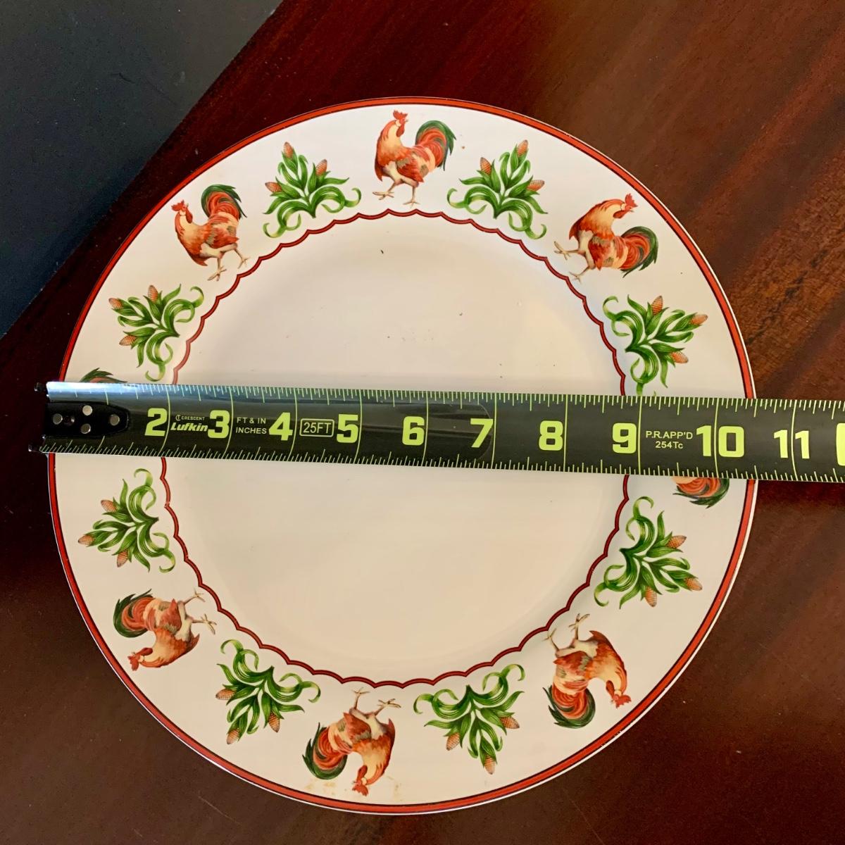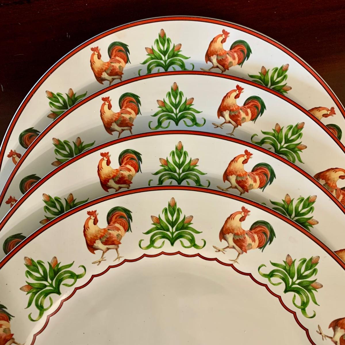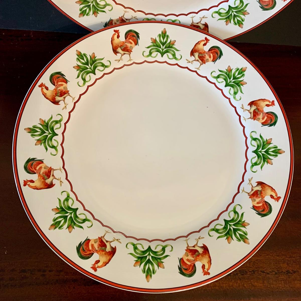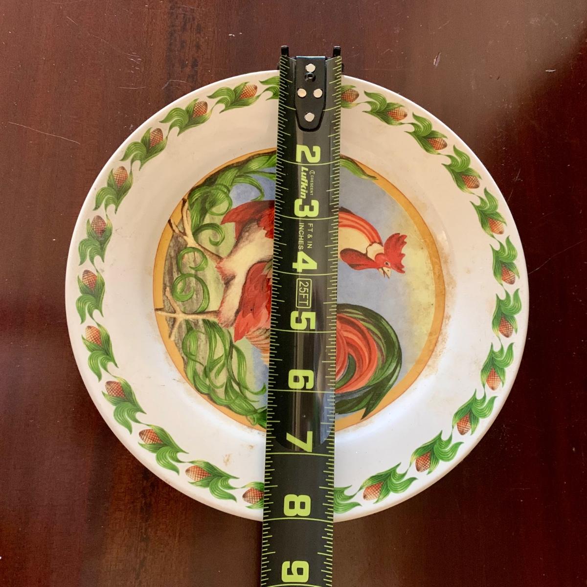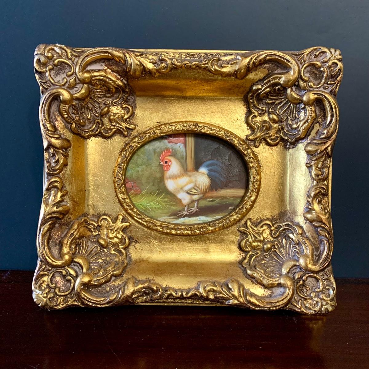 LOT 34 K: Rooster Collection: "Country Gate" Enesco Plates, "Rooster" Dept 56 Mugs, Salt & Pepper Shakers, Stacking Boxes, & Small Gilded Frame Rooster Painting