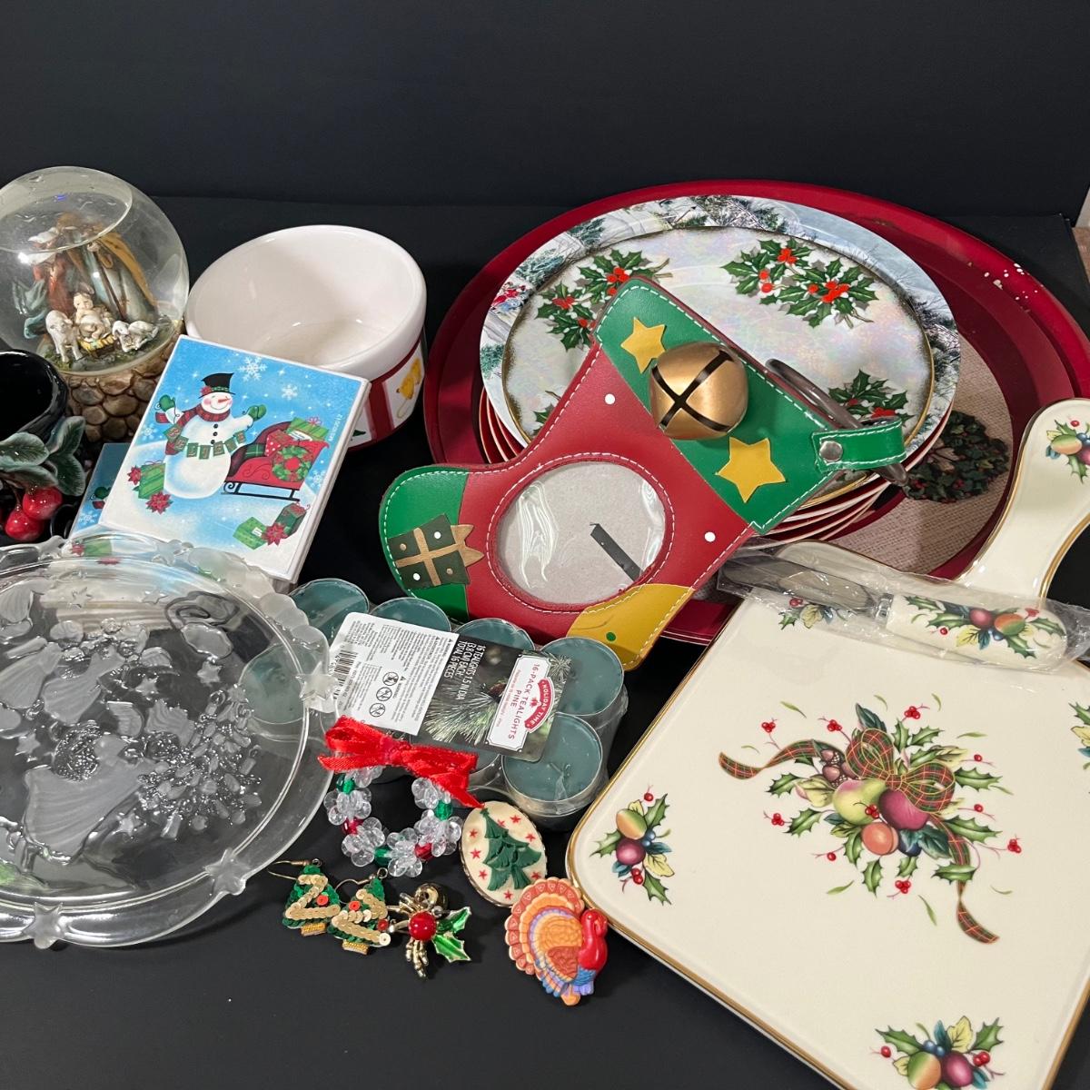 LOT 63: Miscellaneous Christmas Decor & Jewelry - Lenox Cheese Board, Snowglobe & More