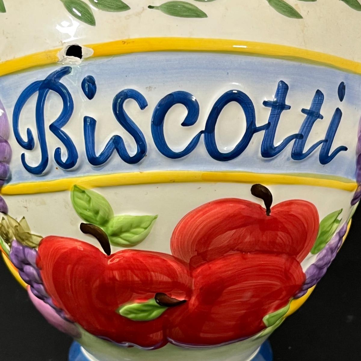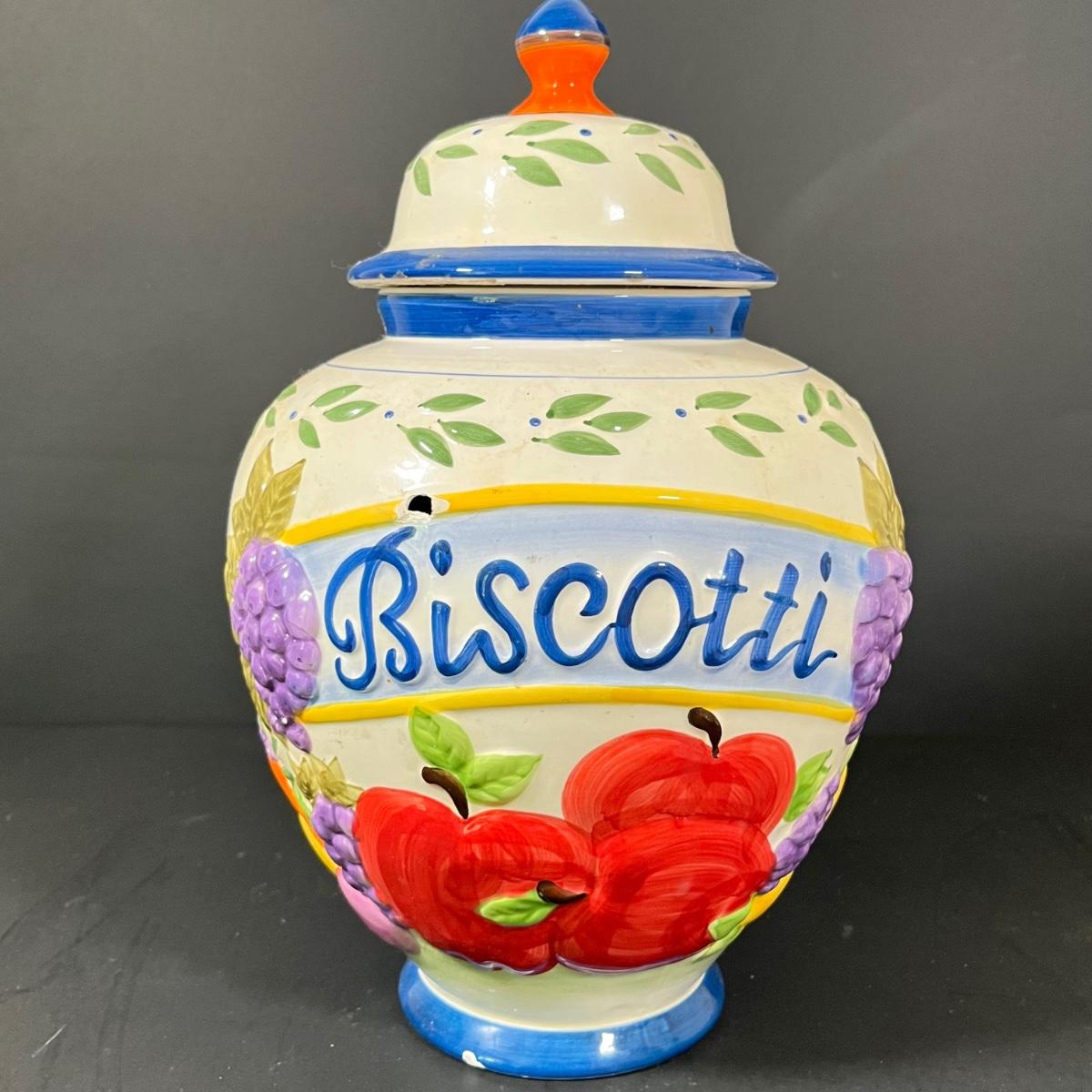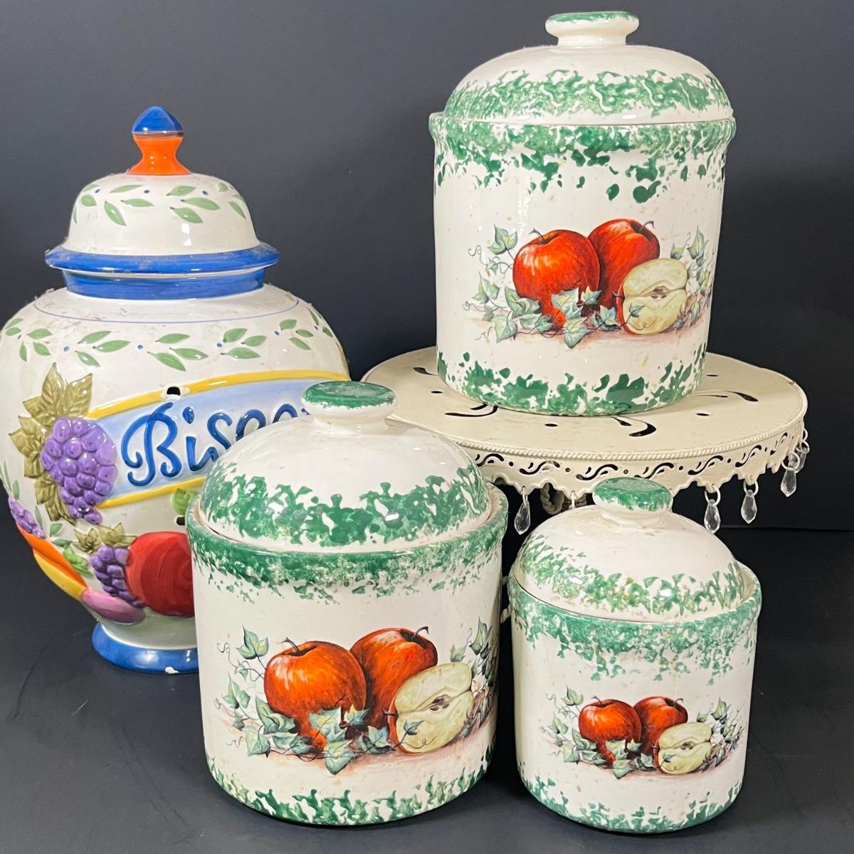 LOT 68: Ceramic Biscotti Cookie Jar and Canister Set + Metal Decorative Cake Stand