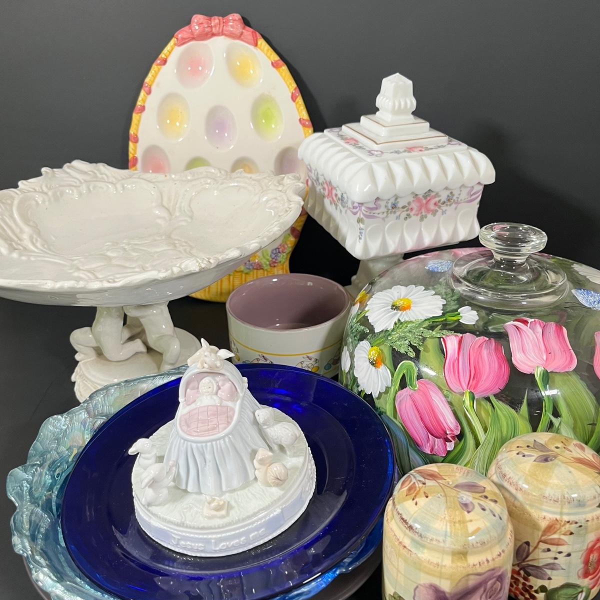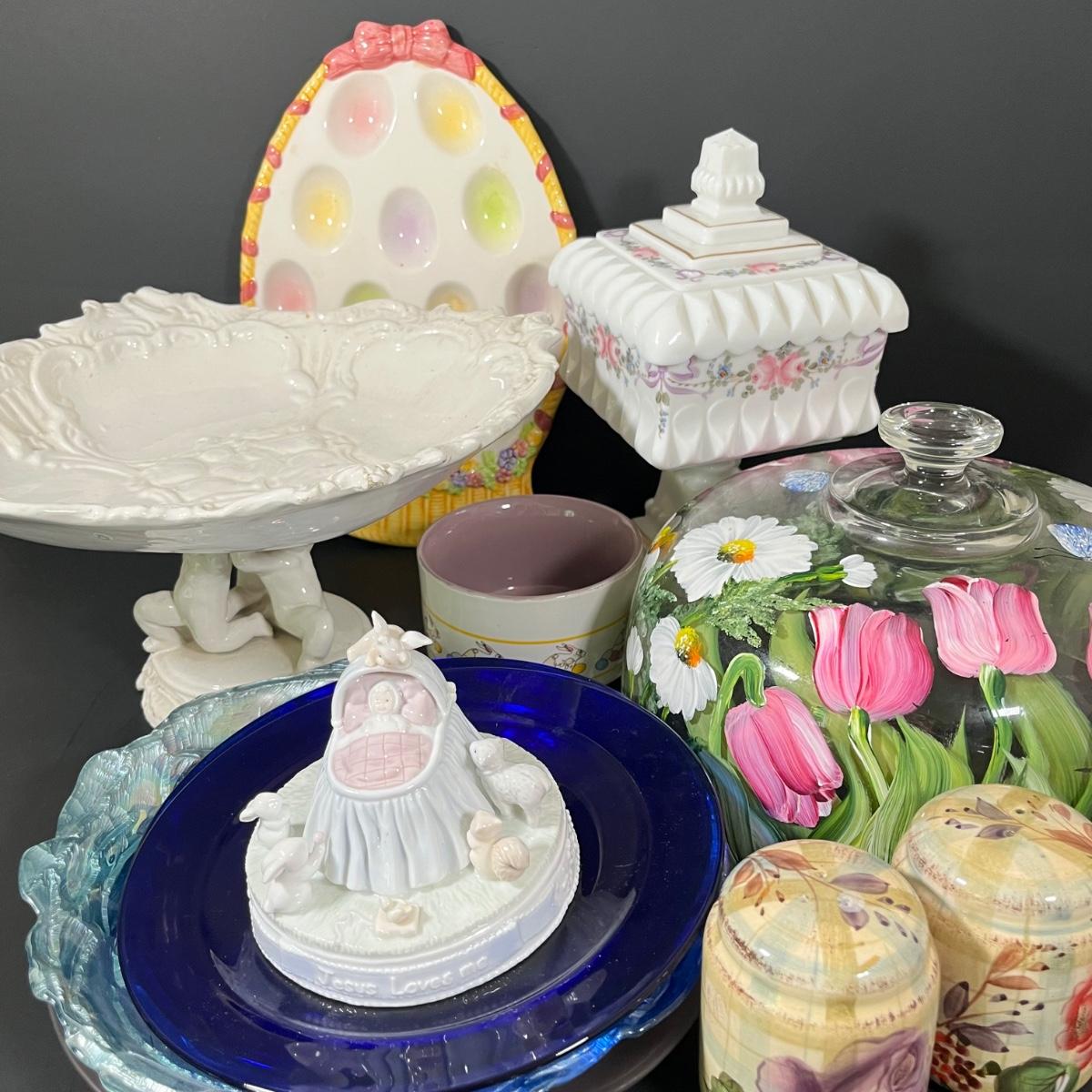 LOT 69: Easter/Spring Ceramic Decor - Salt & Pepper Shakers, Egg Holder, Cake Stand & More