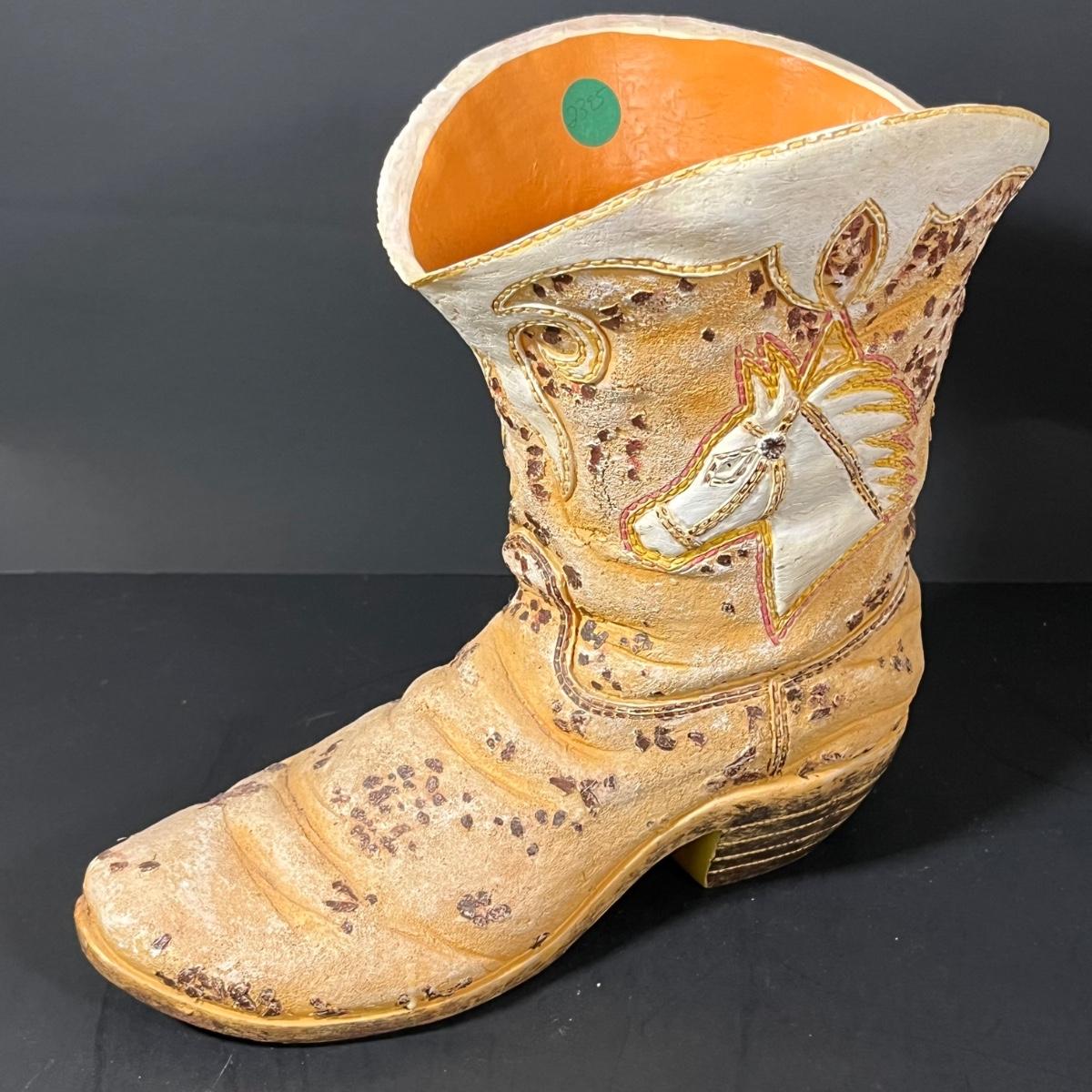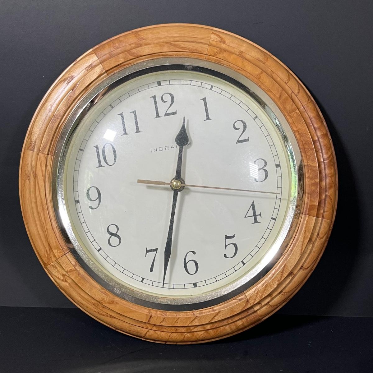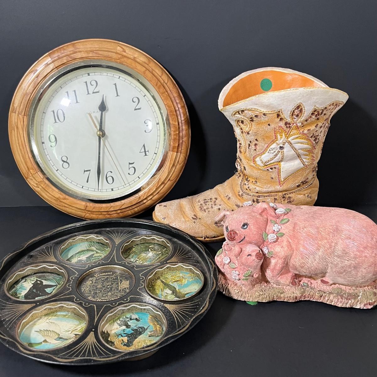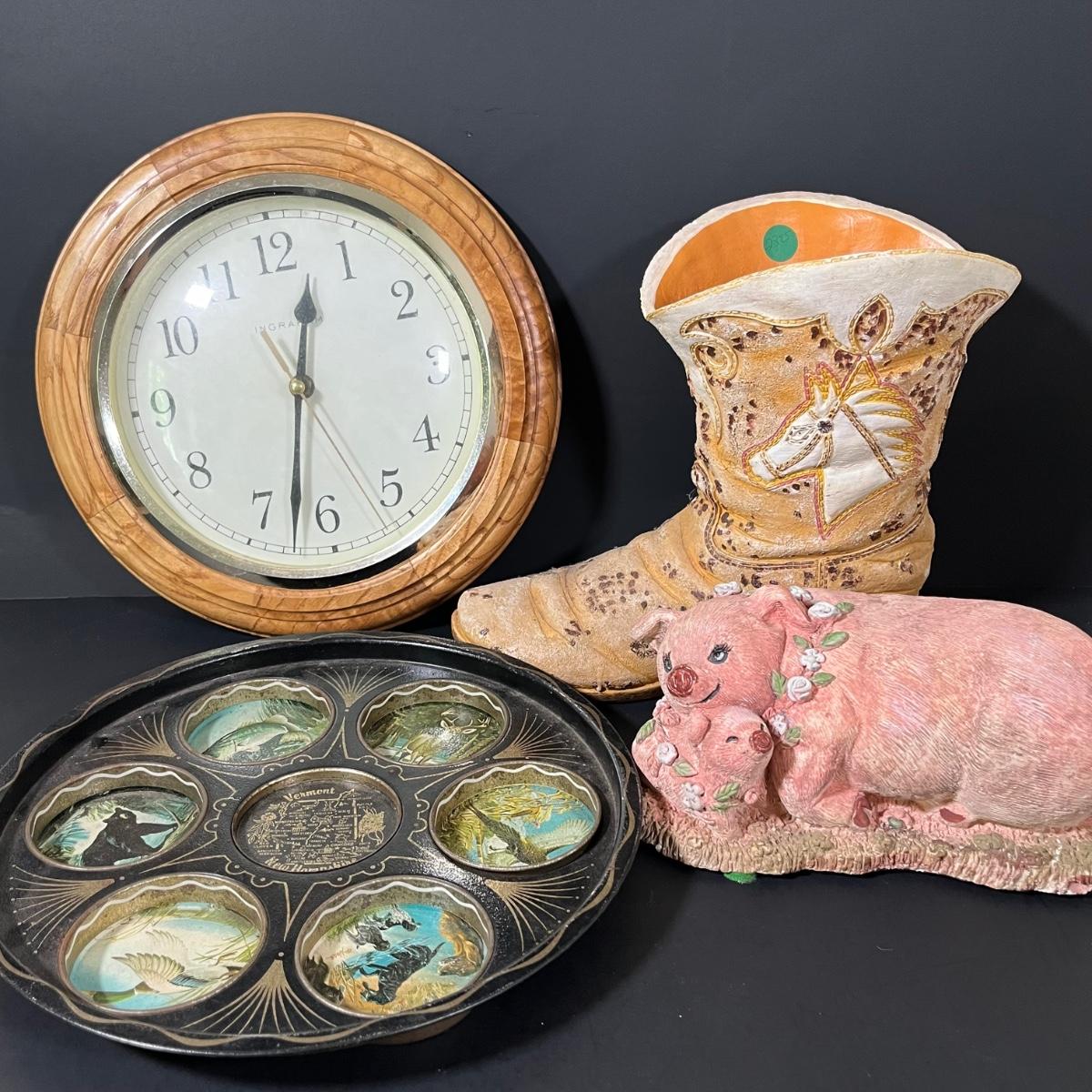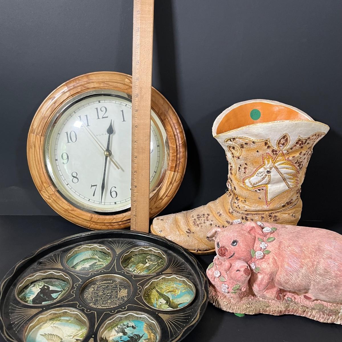 LOT 75: Vintage Working Ingraham Wall Clock, Ceramic Boot Vase, & More