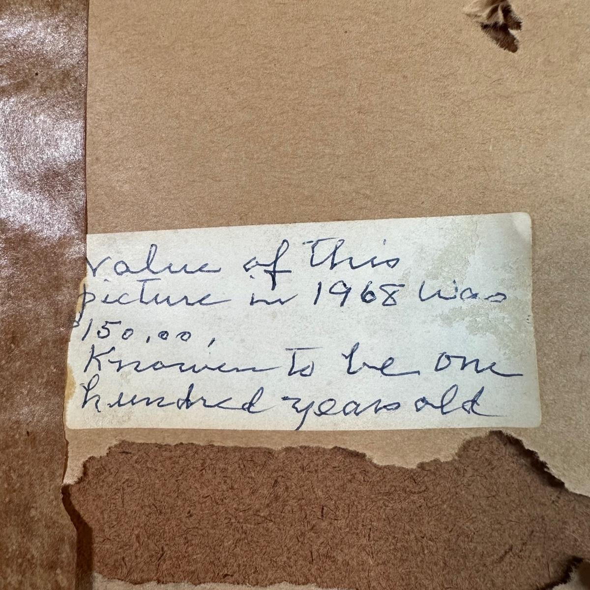 Note on back from home owner reads “Valie of this picture in 1968 was 150,000$ Known to be 100 years old” 26.5x25.5 - Please see all pictures as they are the best representation of the items. The pictures show condition, measurements if taken, and what is included in the lot. Due to the large amount that we photograph and the time frame, we are not always able to take measurements. All items unless noted, are pre-owned and have been used. If you purchased furniture, you must bring help. We do not allow one person to carry large furniture out on their own. Bring help, tools and a truck for the safety of our client’s homes, and your personal safety. Any damages that result to the property including walls, and floors due to moving of the furniture will be charged to the buyer. Company policy. Thank you.