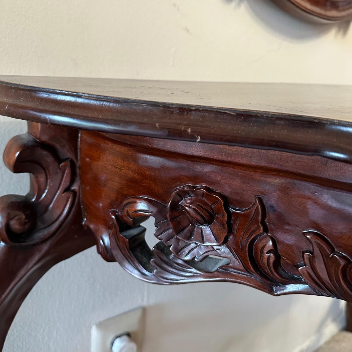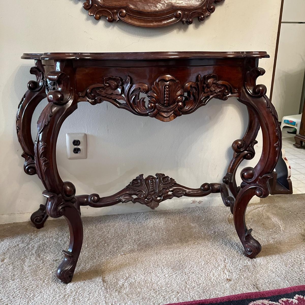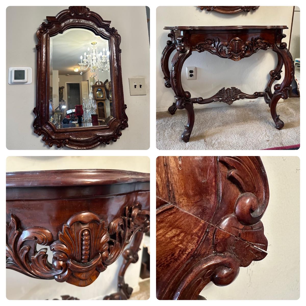 Table is 44x18.5x31.5 and mirror is 27x43, mirror frame is cracked - Please see all pictures as they are the best representation of the items. The pictures show condition, measurements if taken, and what is included in the lot. Due to the large amount that we photograph and the time frame, we are not always able to take measurements. All items unless noted, are pre-owned and have been used. If you purchased furniture, you must bring help. We do not allow one person to carry large furniture out on their own. Bring help, tools and a truck for the safety of our client’s homes, and your personal safety. Any damages that result to the property including walls, and floors due to moving of the furniture will be charged to the buyer. Company policy. Thank you.