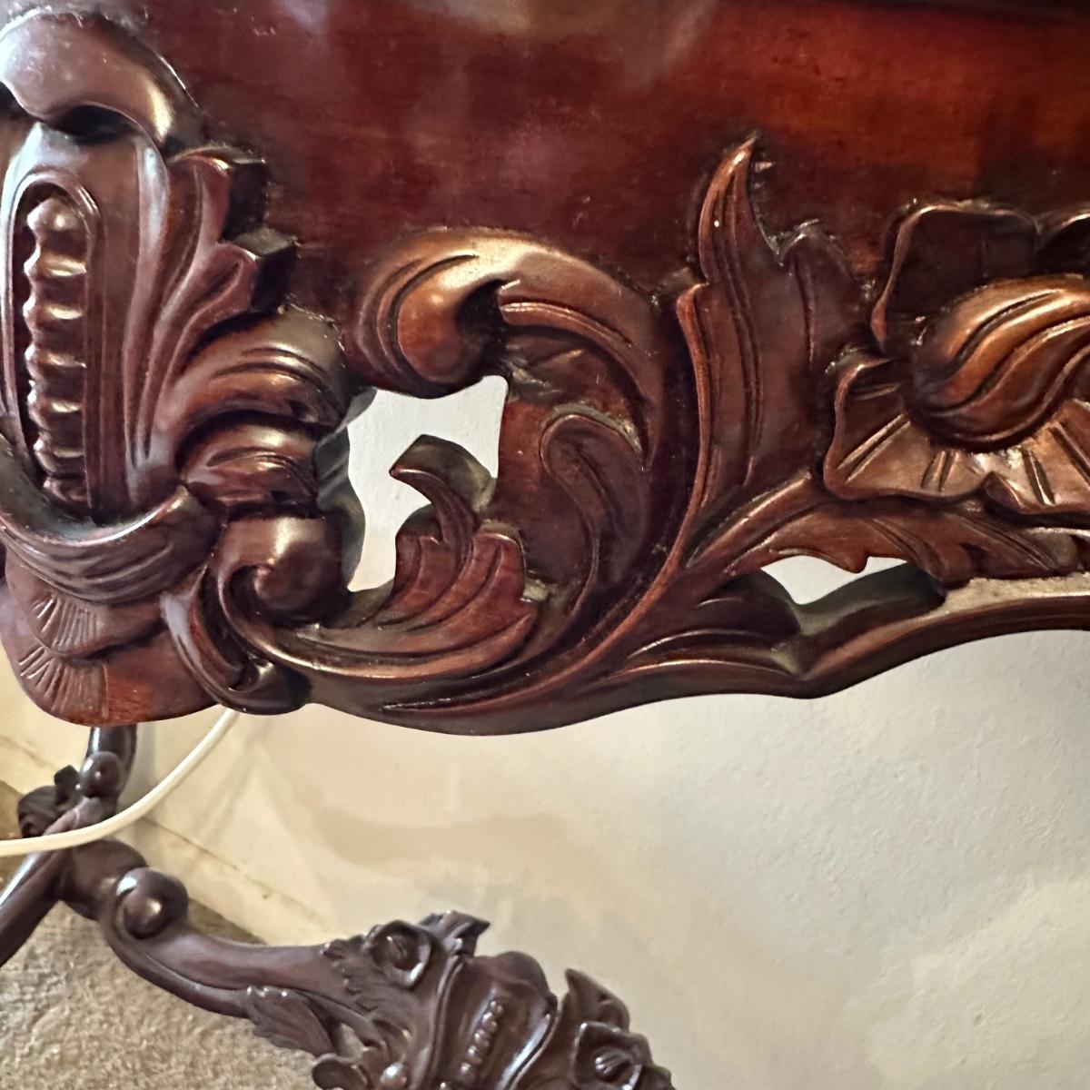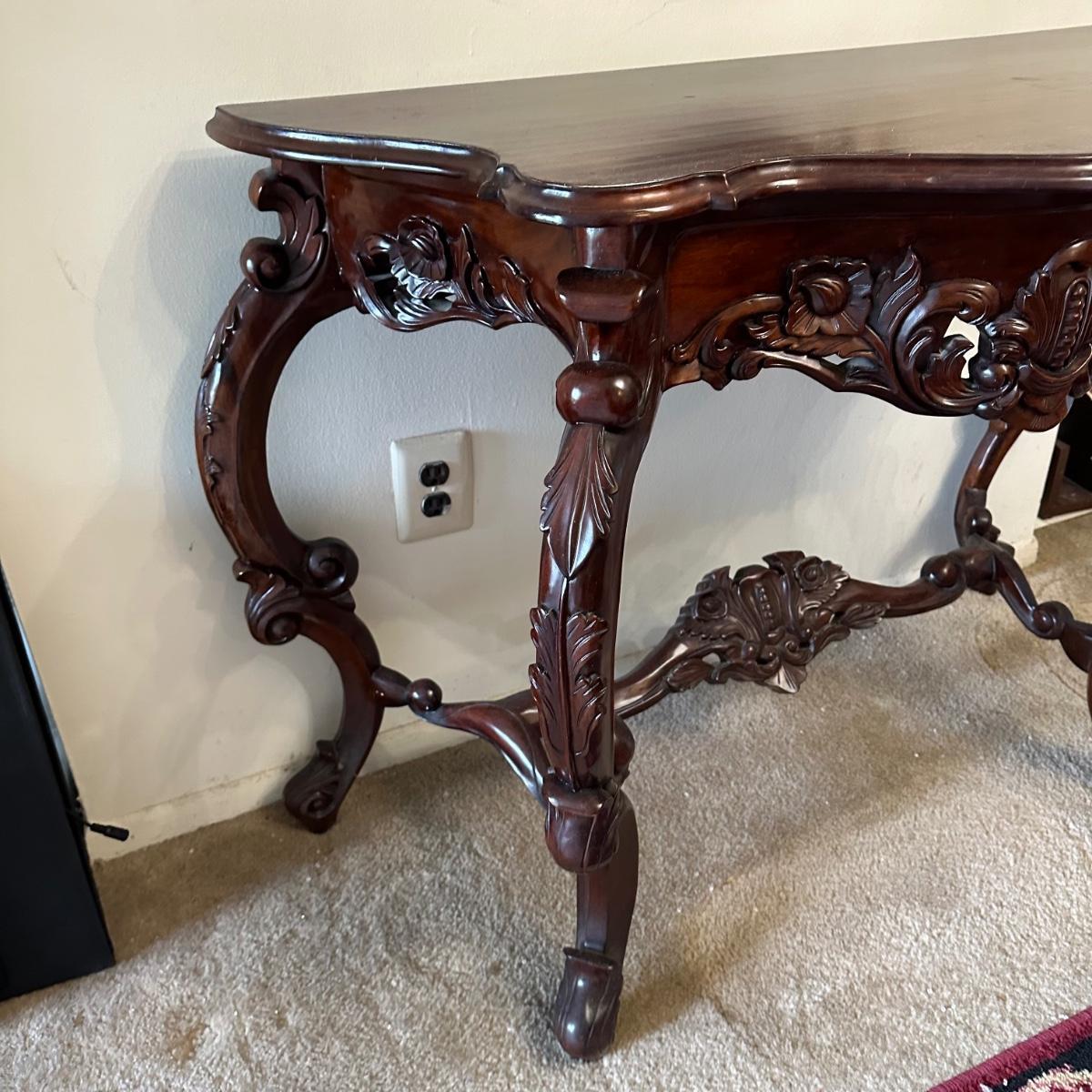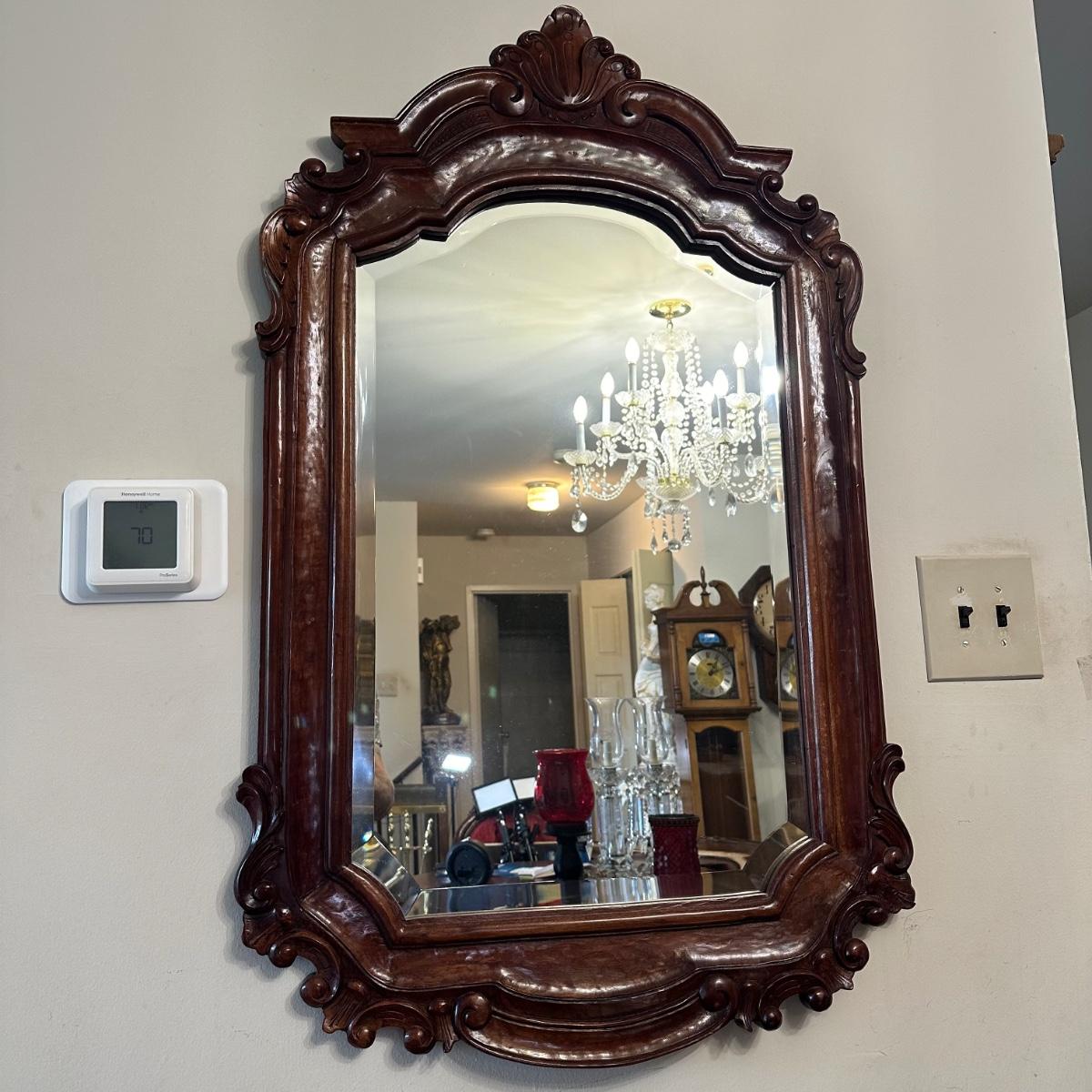 Table is 44x18.5x31.5 and mirror is 27x43, mirror frame is cracked - Please see all pictures as they are the best representation of the items. The pictures show condition, measurements if taken, and what is included in the lot. Due to the large amount that we photograph and the time frame, we are not always able to take measurements. All items unless noted, are pre-owned and have been used. If you purchased furniture, you must bring help. We do not allow one person to carry large furniture out on their own. Bring help, tools and a truck for the safety of our client’s homes, and your personal safety. Any damages that result to the property including walls, and floors due to moving of the furniture will be charged to the buyer. Company policy. Thank you.