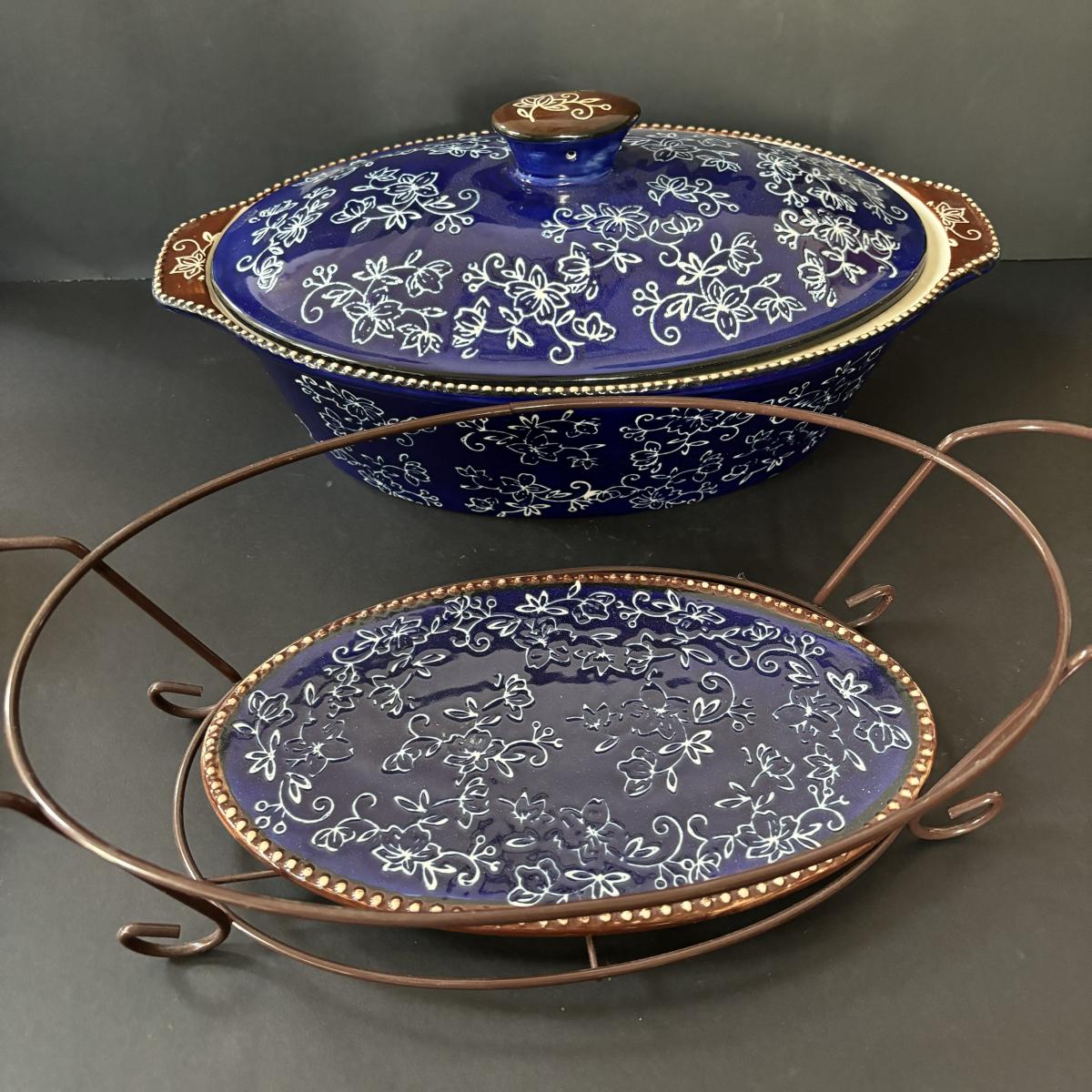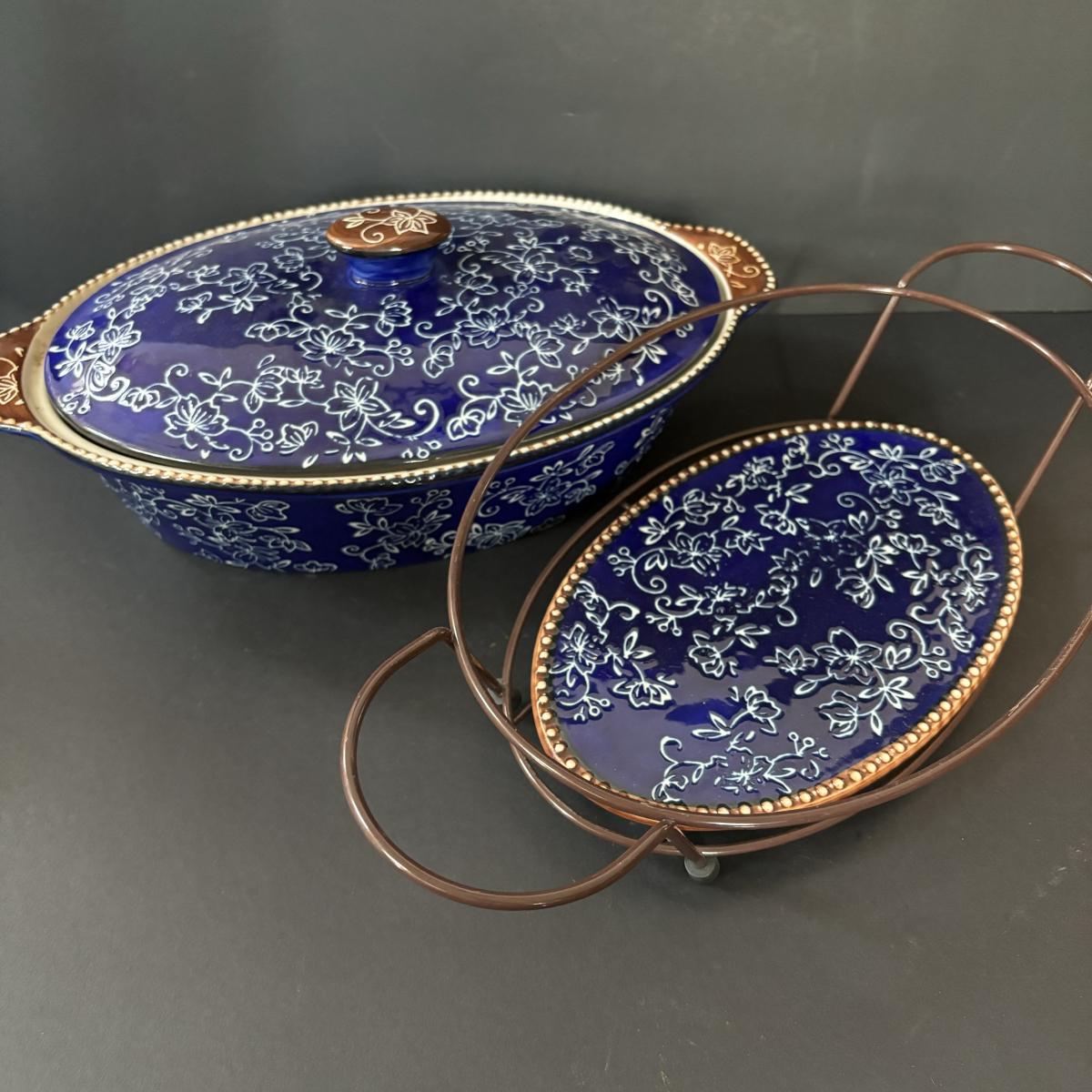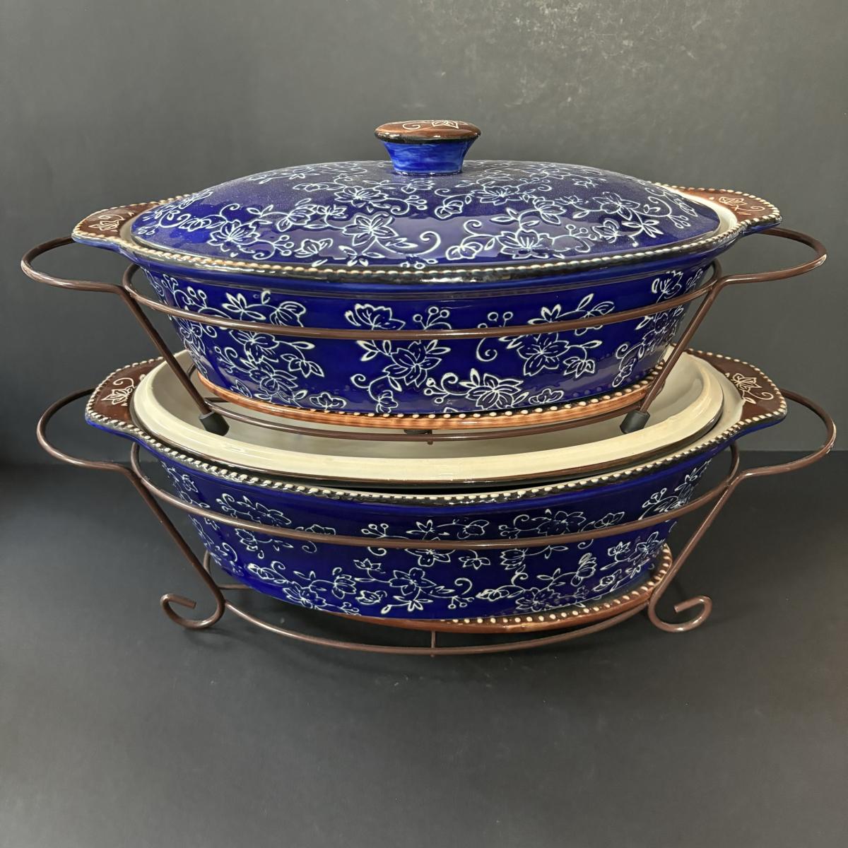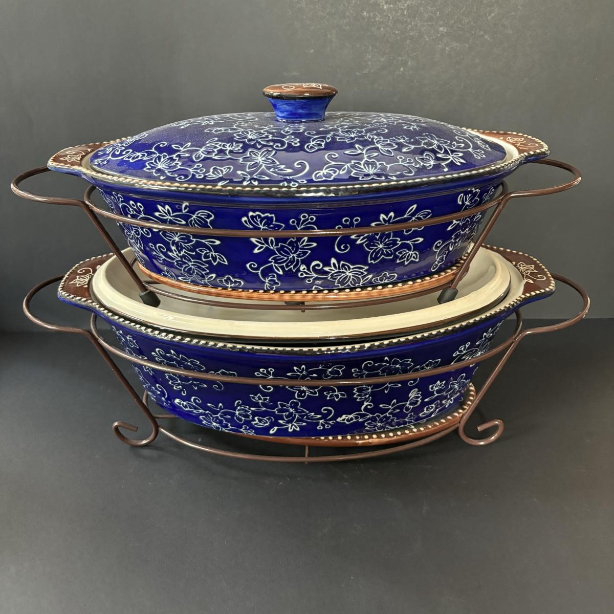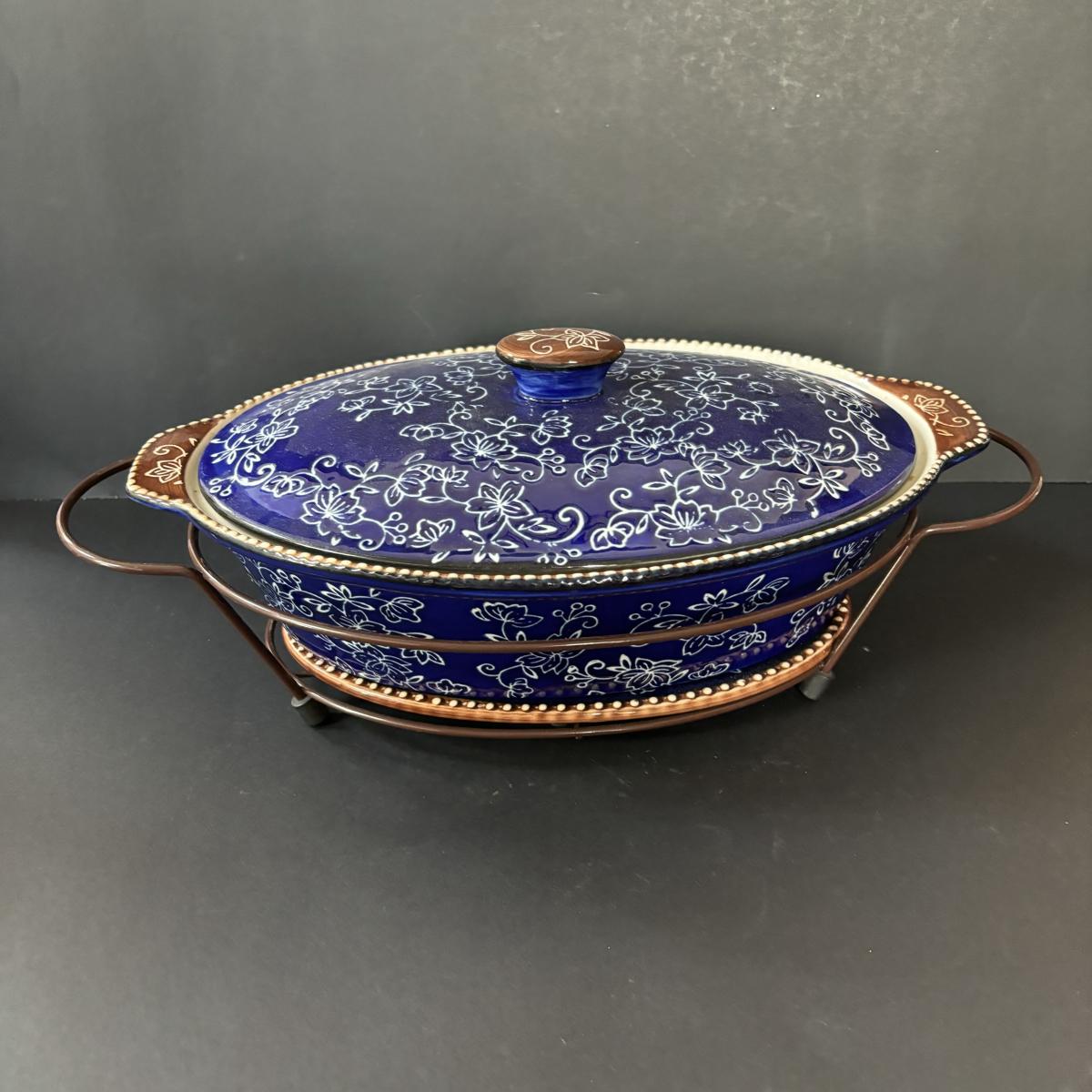 LOT 226: Temp-Tations by Tara Blue Floral Lace Ovenware by Tara 2qt & 3.5qt Casserole Dishes + Stand, Lid & Trivet