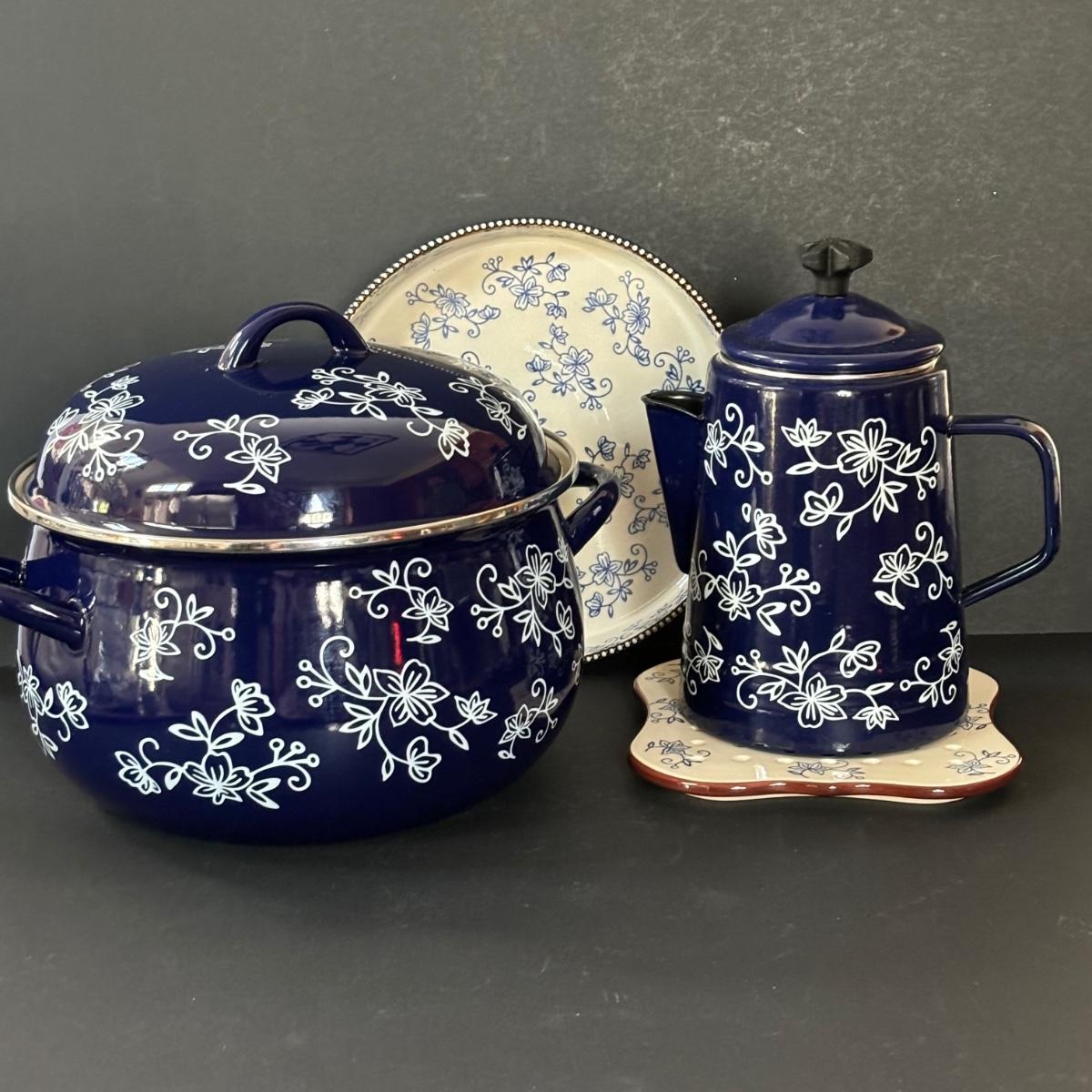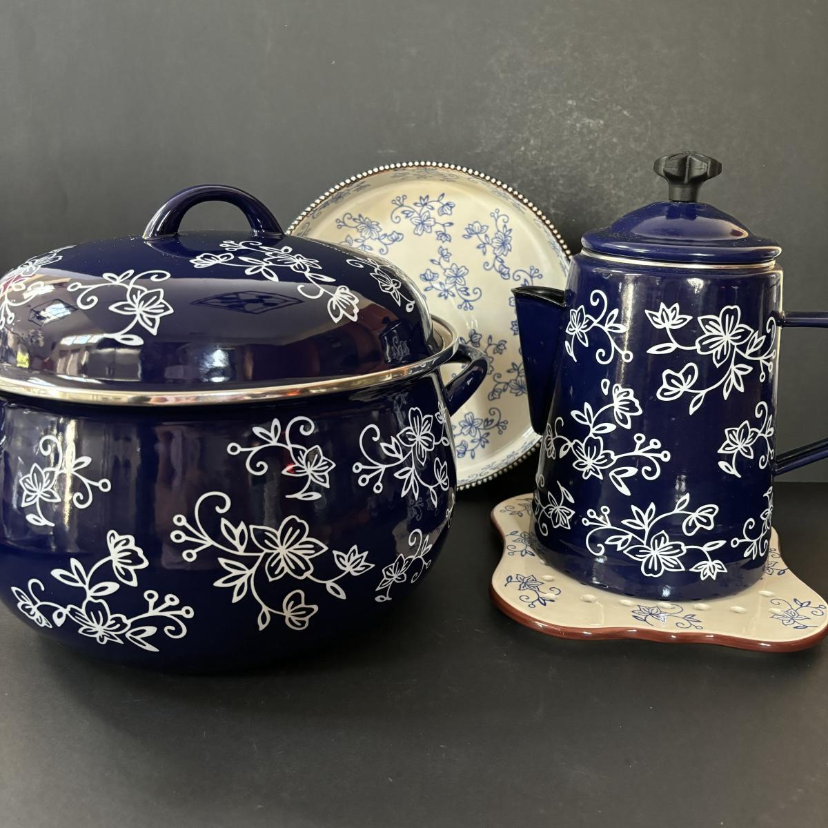 LOT 227: Temp-Tations by Tara Blue Floral Lace Stock Pot, Coffee Pot & More