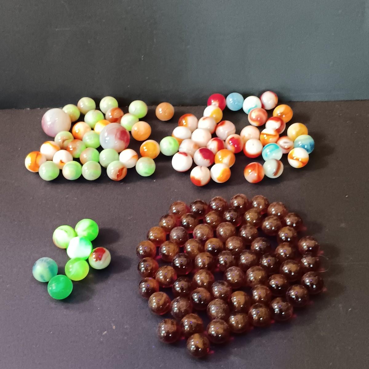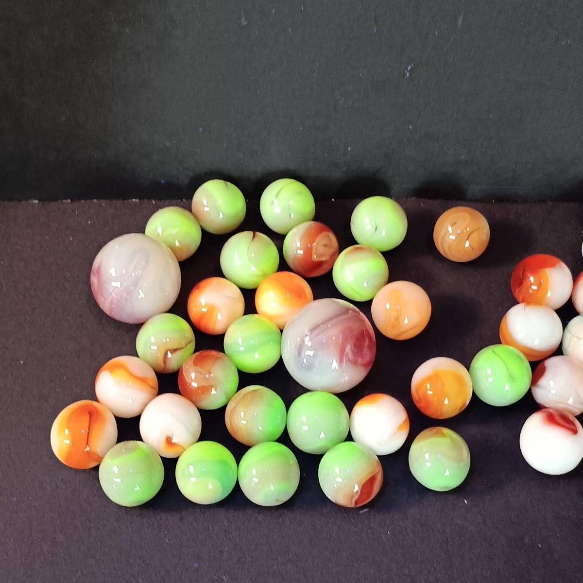 LOT 230: Uranium / Vaseline Glass and Fluorescent Marbles w/ Agate Pattern Marbles