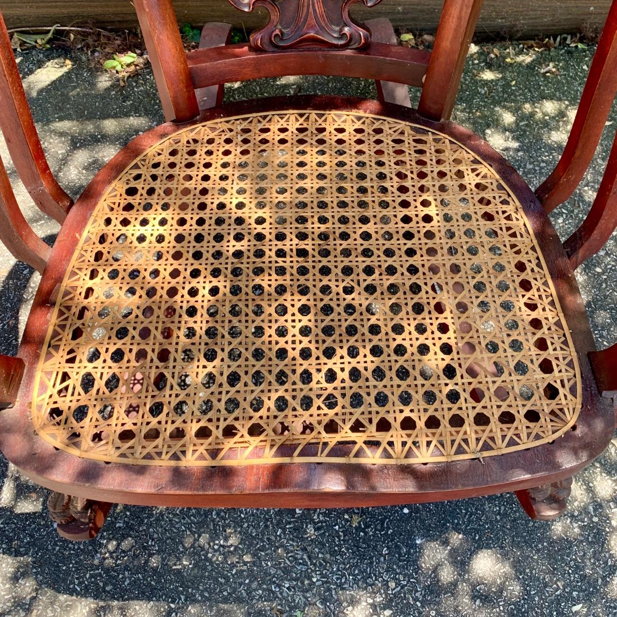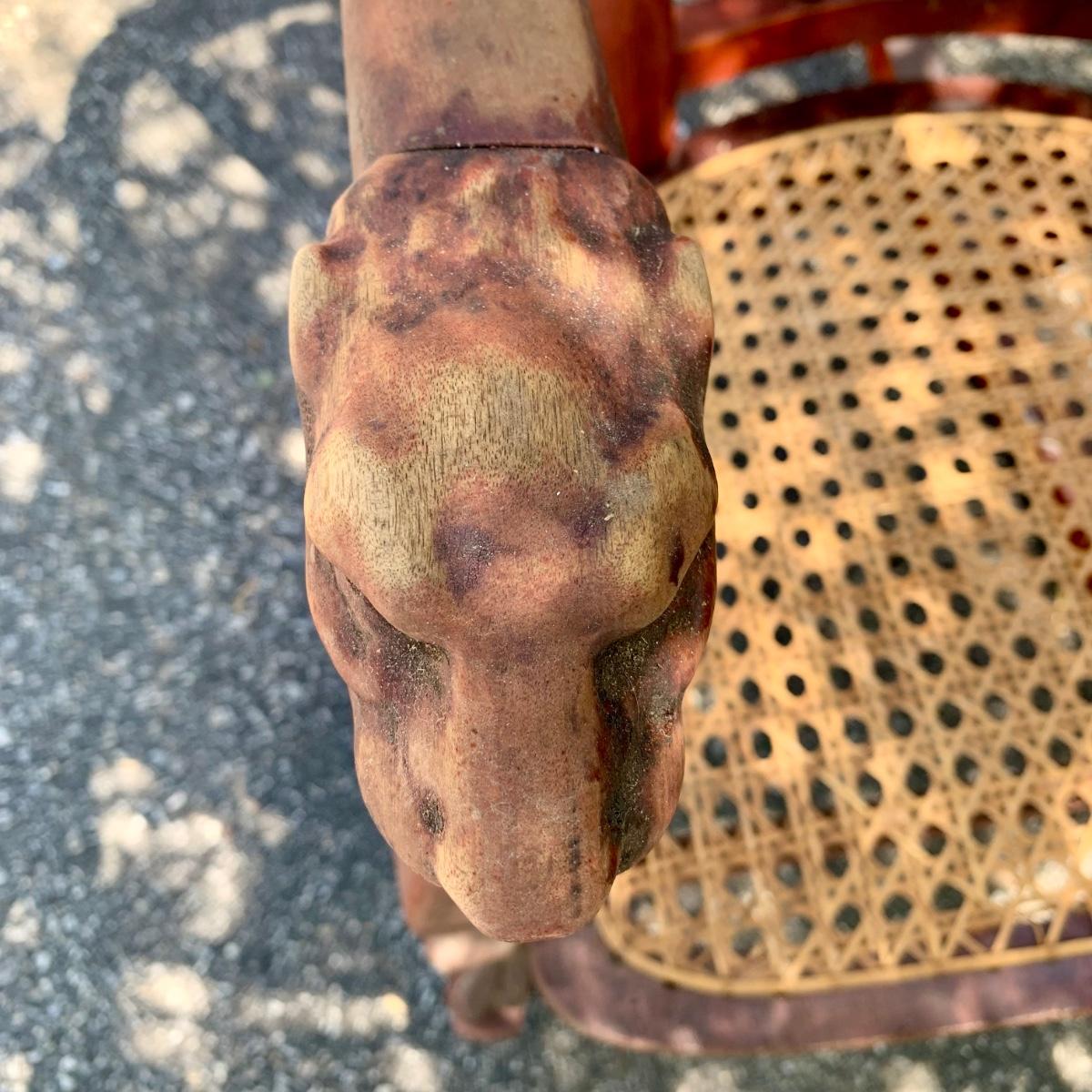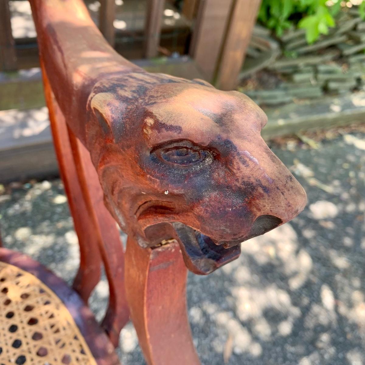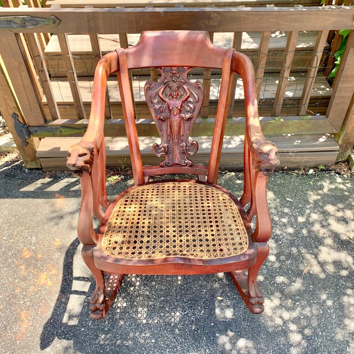 LOT 143 S: Vintage Ornate Wooden Rocker w/ Cane Seat, Lion Head Arm Rests, Claw Foot Legs, & Beautiful Goddess Back Rest