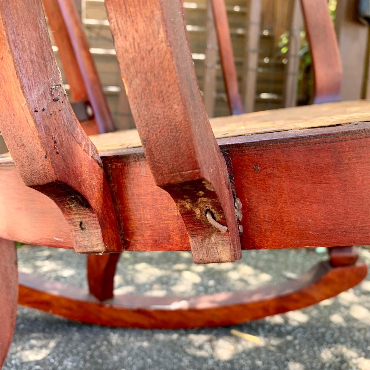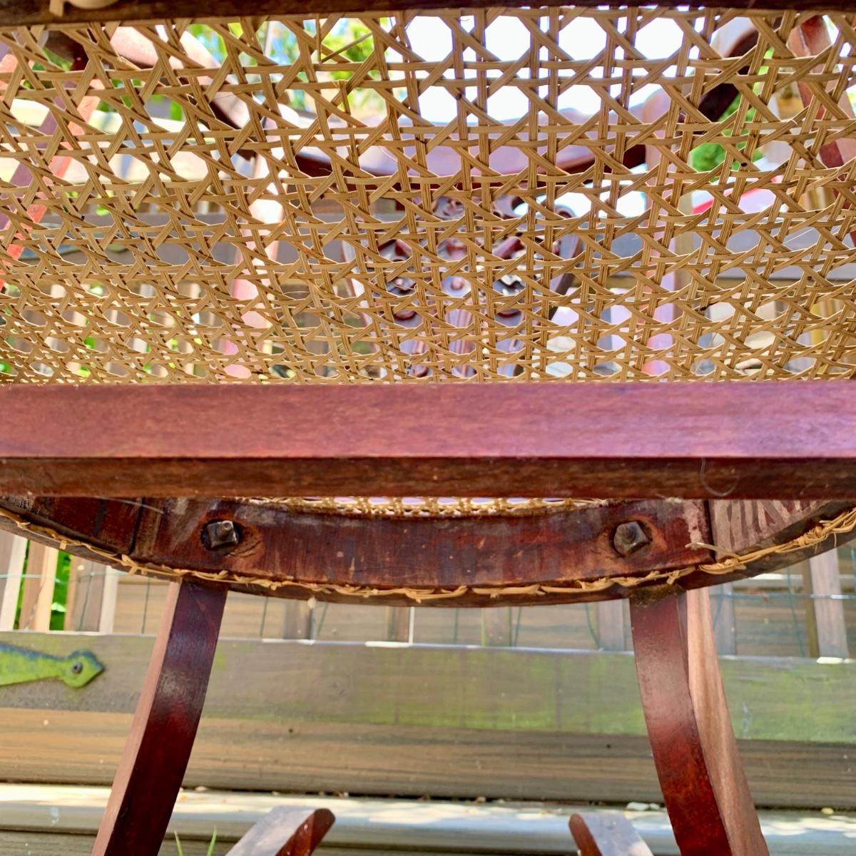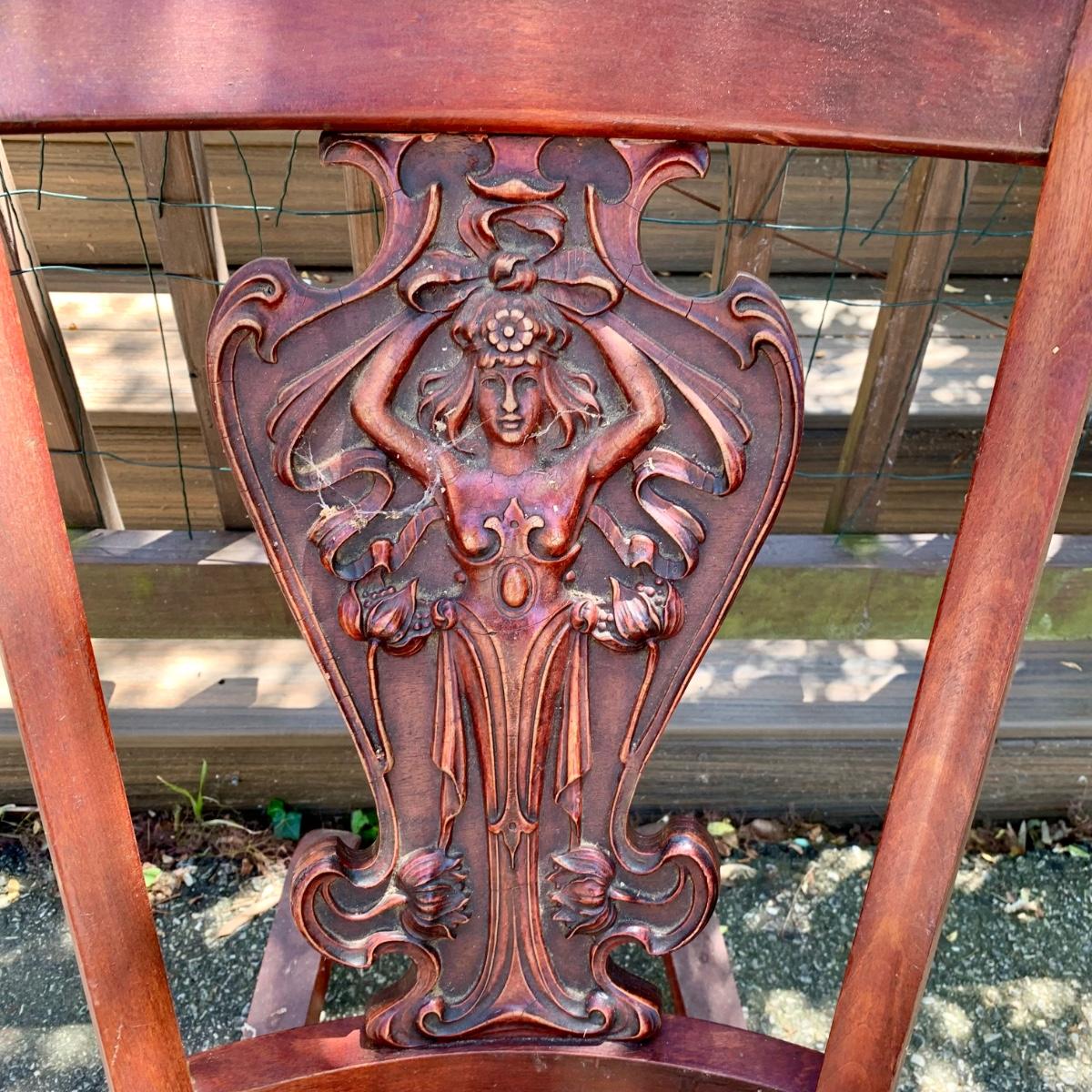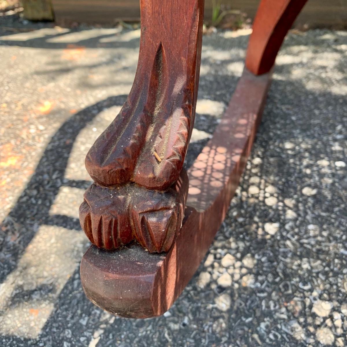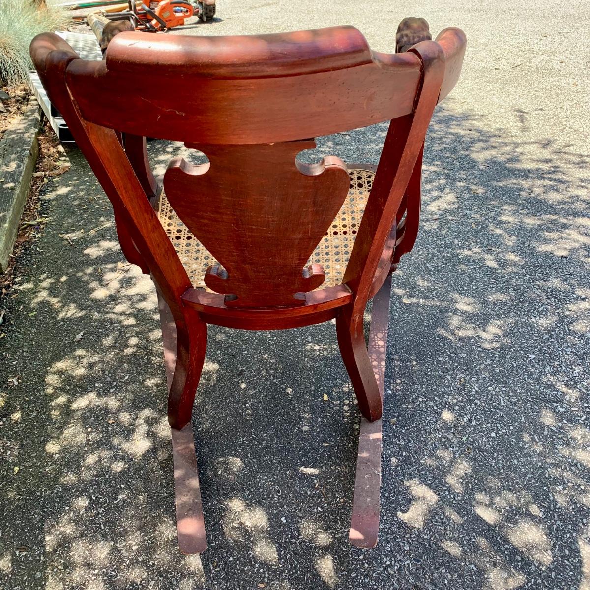 LOT 143 S: Vintage Ornate Wooden Rocker w/ Cane Seat, Lion Head Arm Rests, Claw Foot Legs, & Beautiful Goddess Back Rest