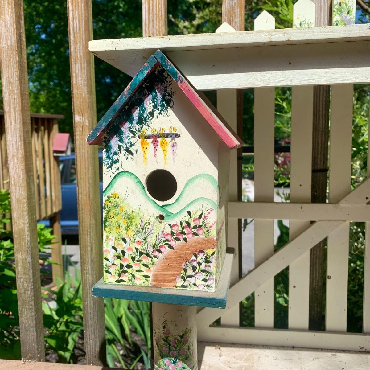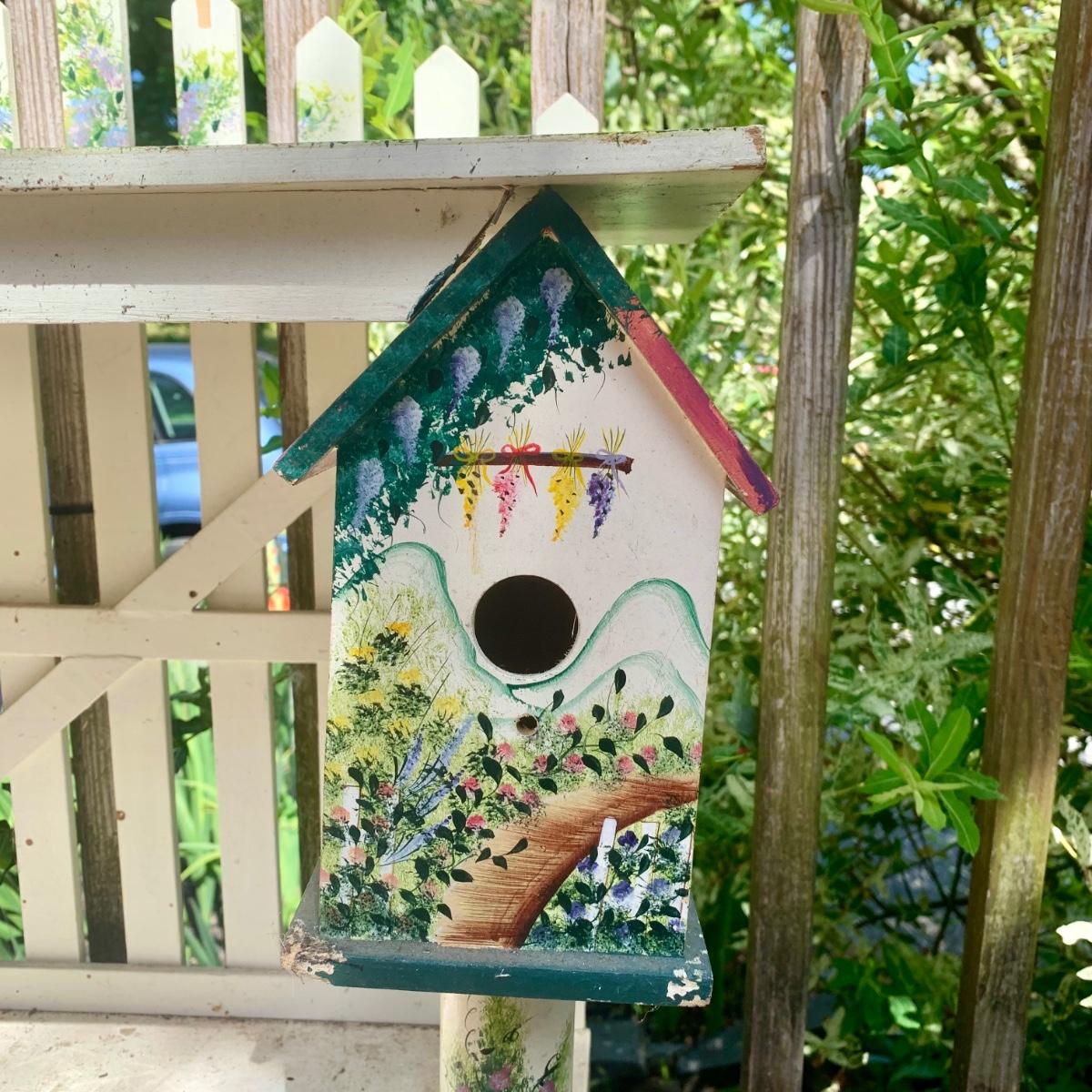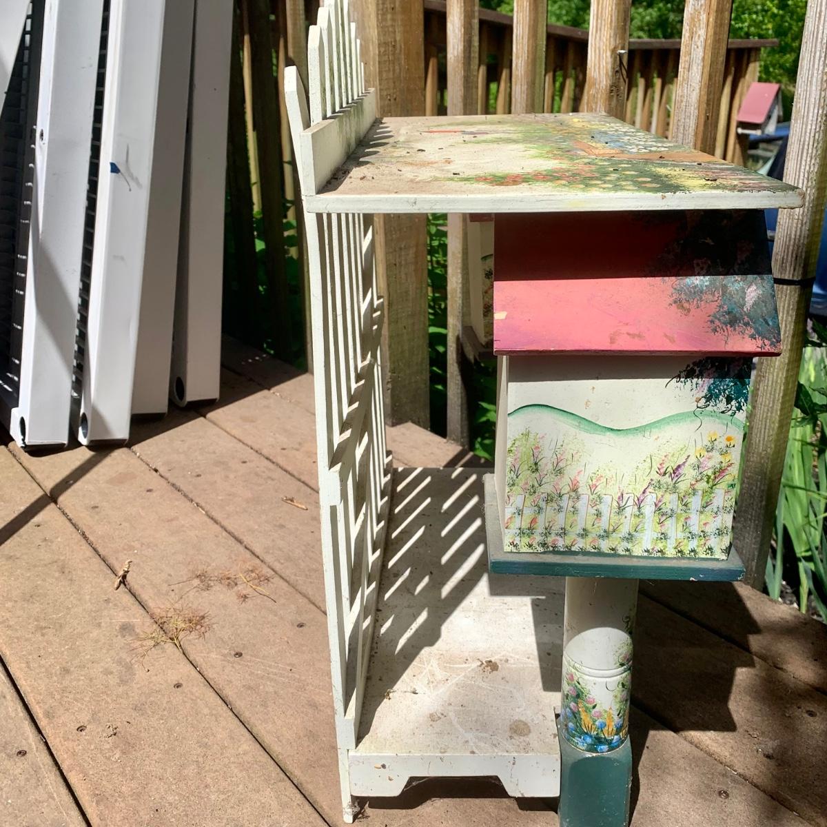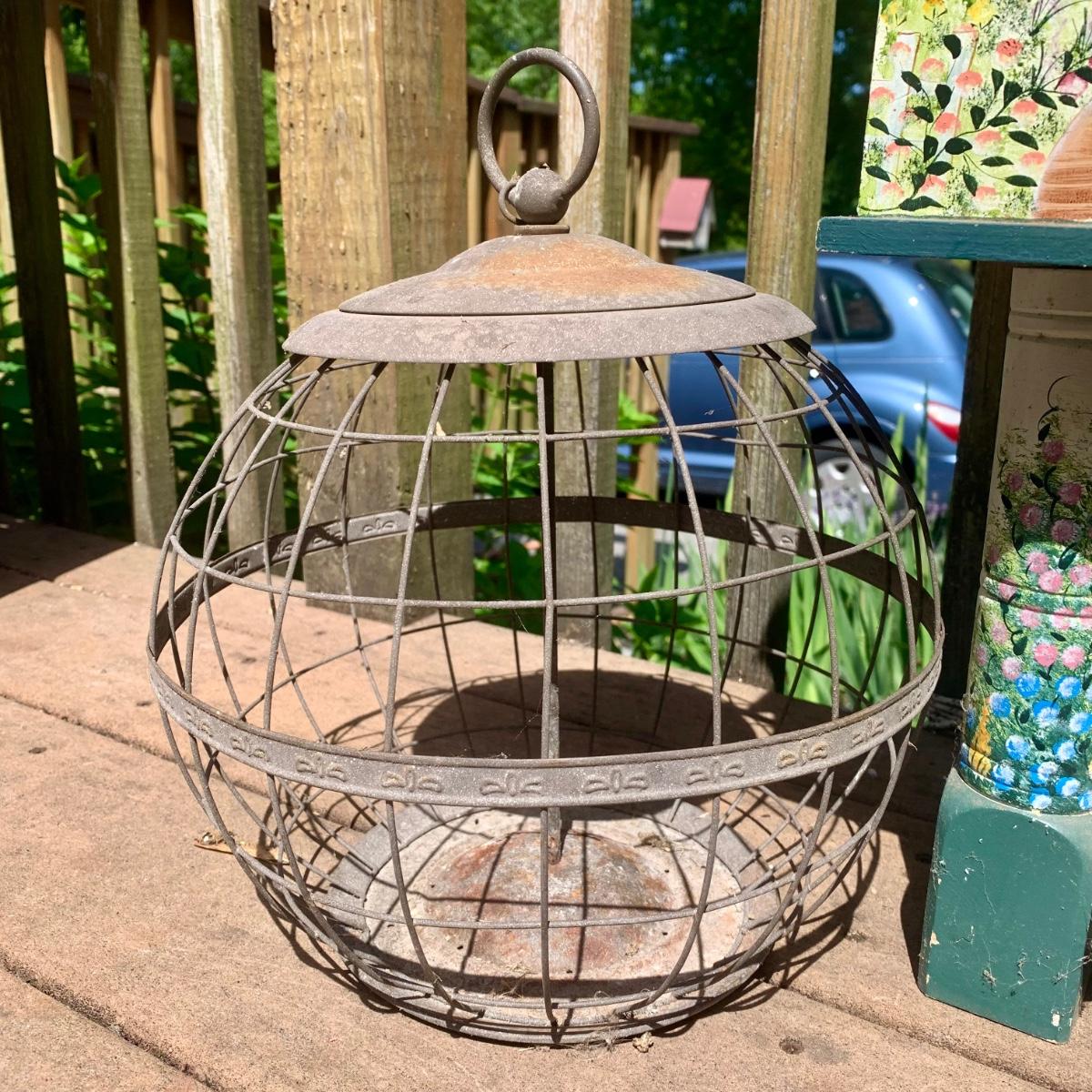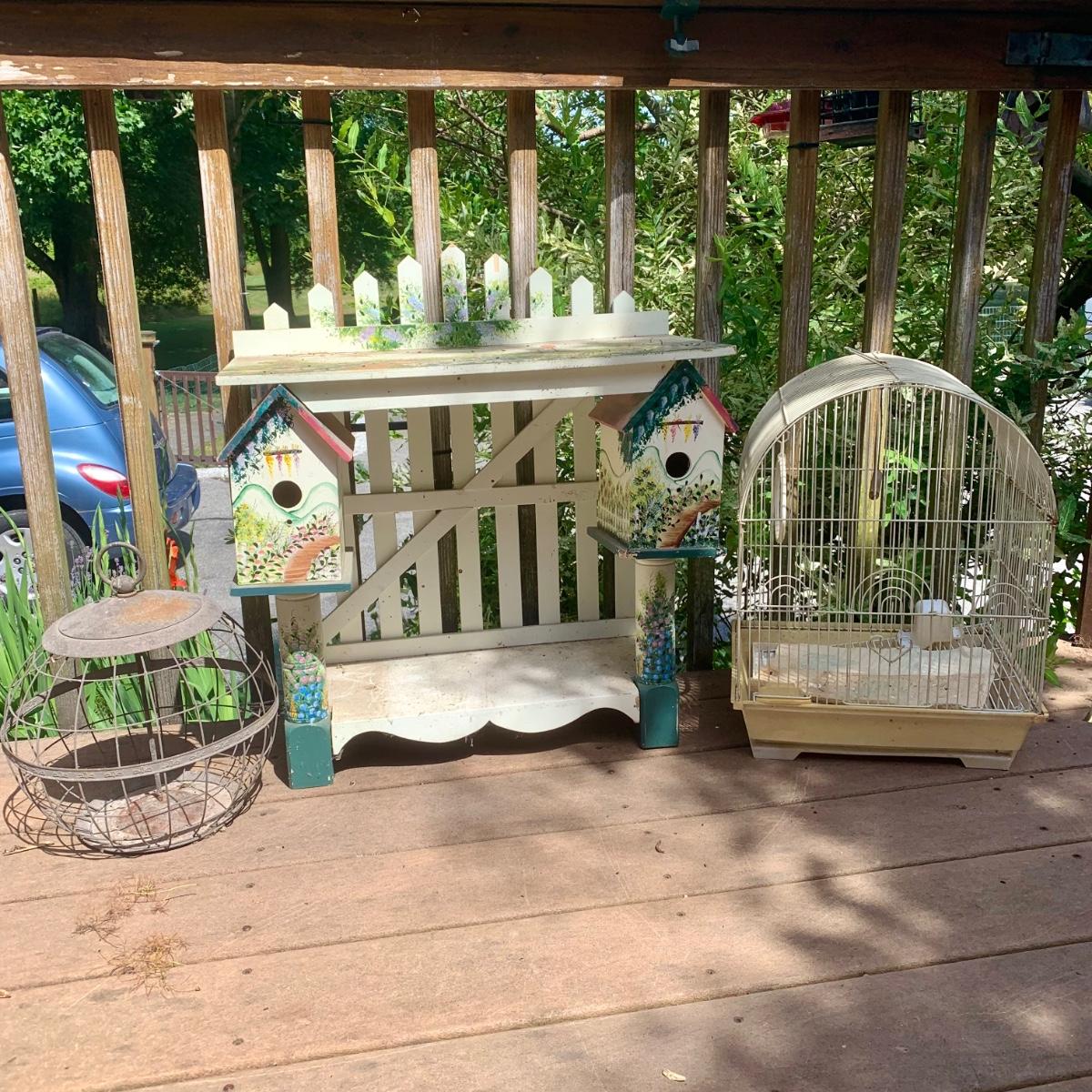 LOT 162 O: Hand Painted Wooden Bird House Side Table, Bird Cage, & Hanging Metal Bird Feeder