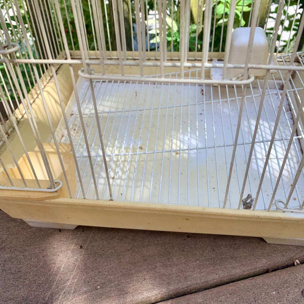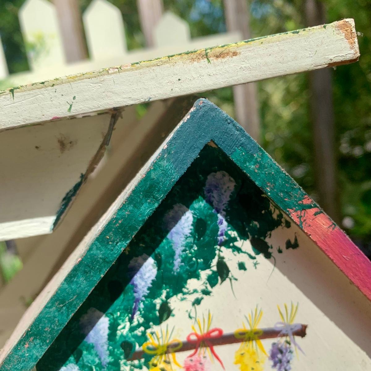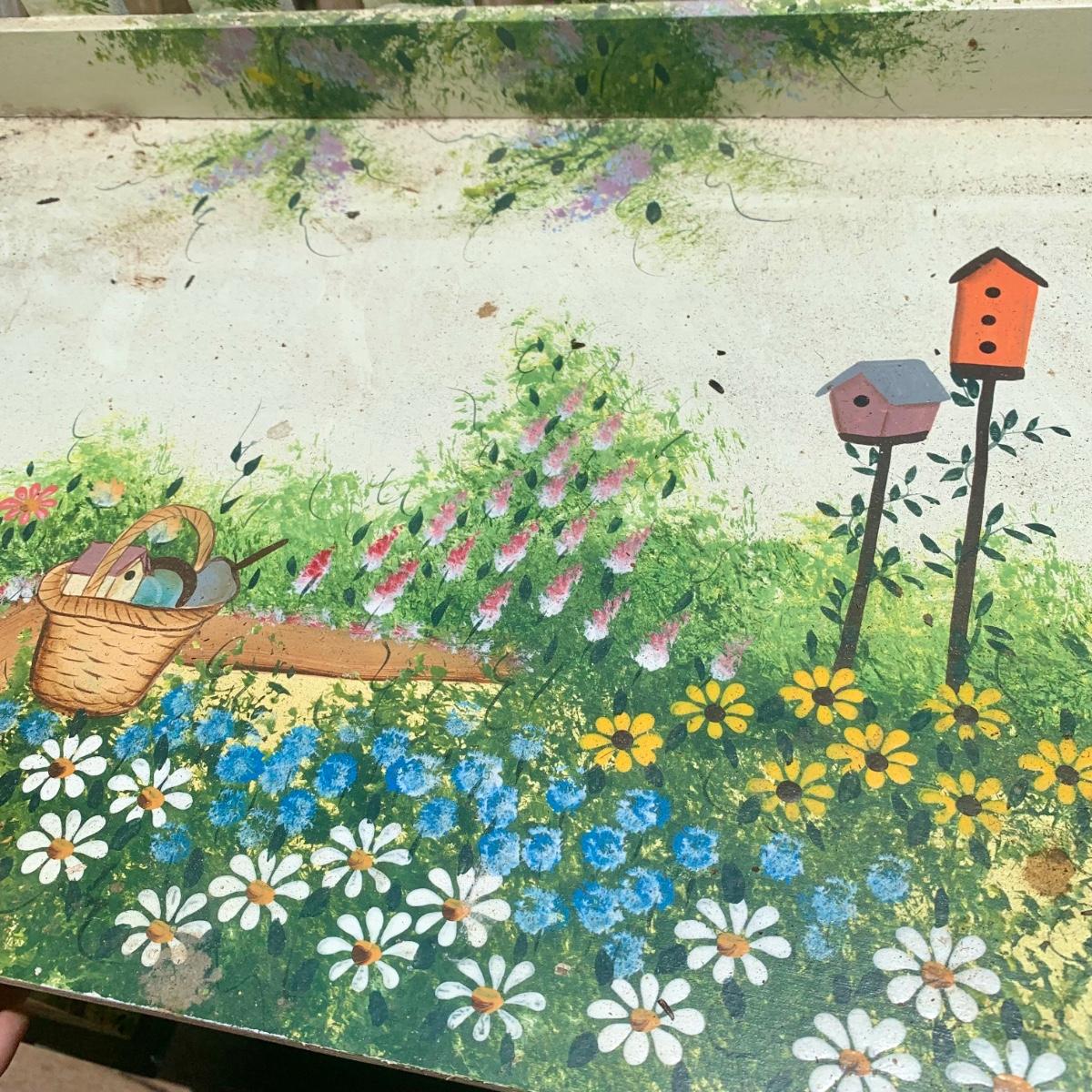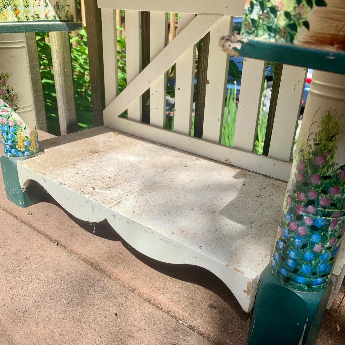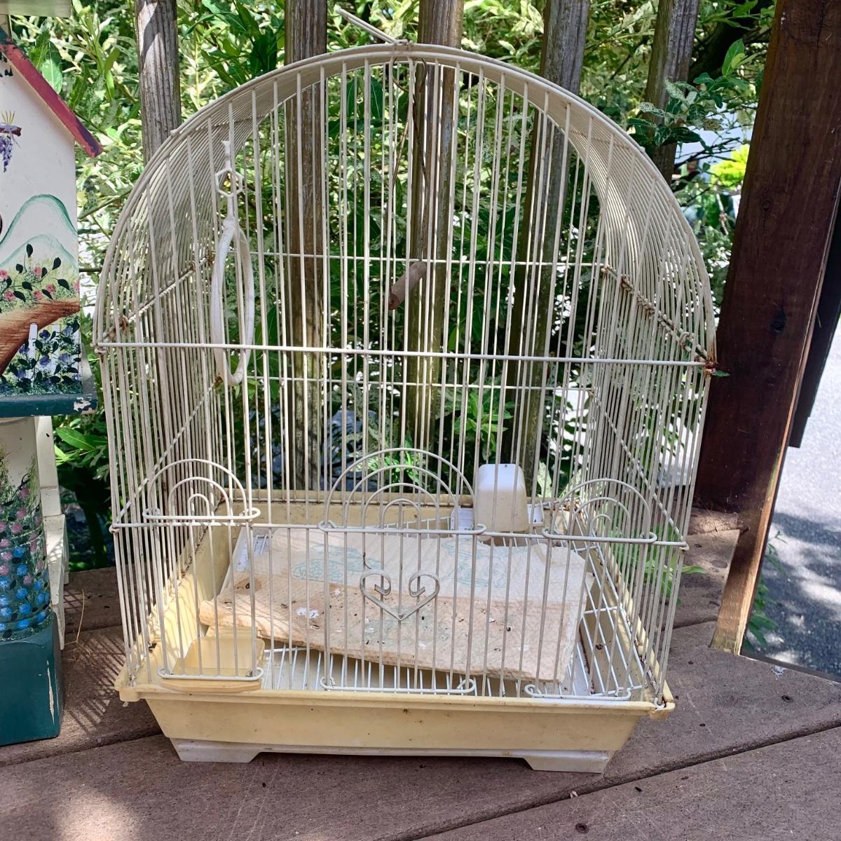 LOT 162 O: Hand Painted Wooden Bird House Side Table, Bird Cage, & Hanging Metal Bird Feeder