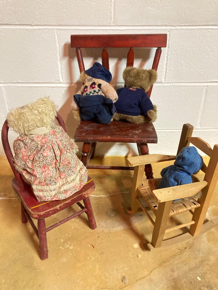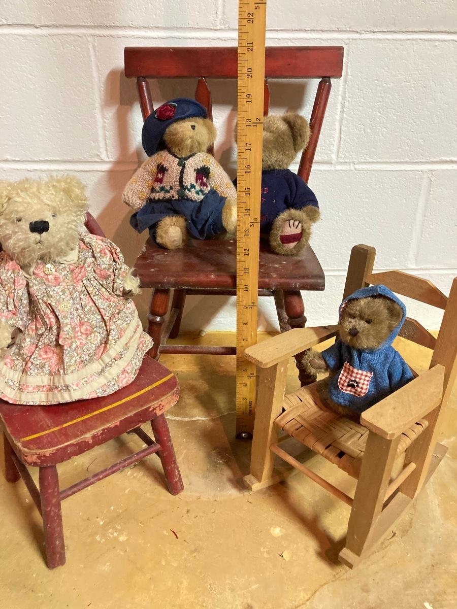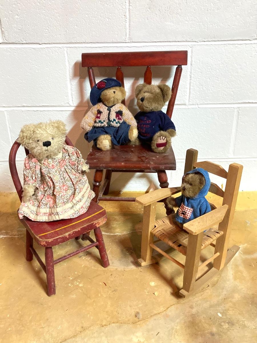LOT 65: Three Small Vintage Wooden Chair and Collection of Bear Stuffed Animals (Boyd's and More)