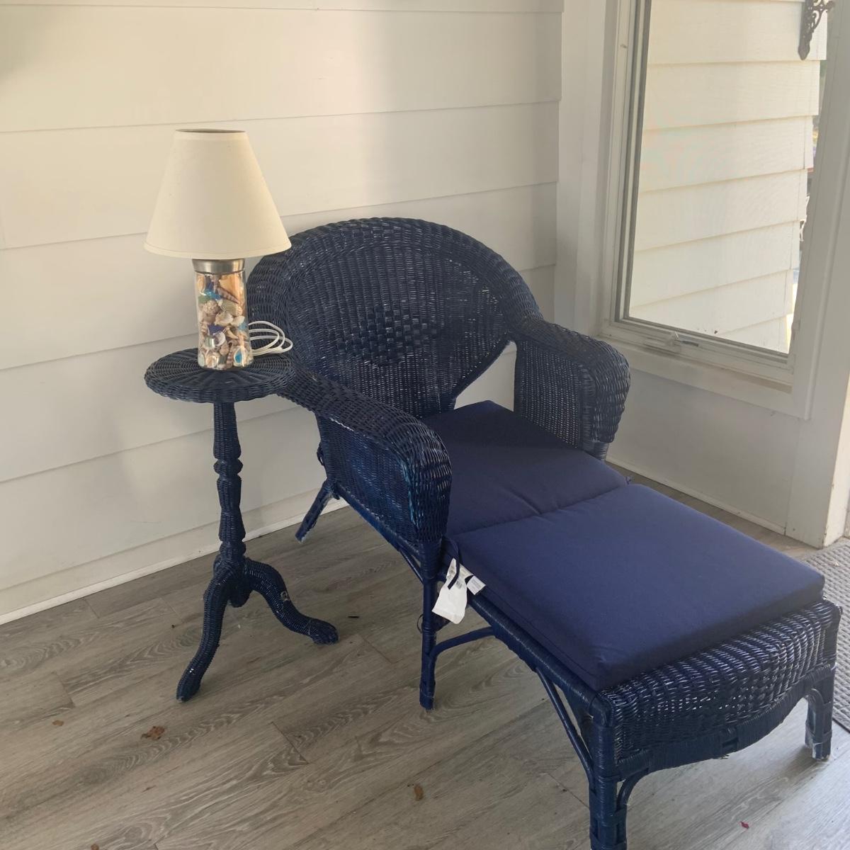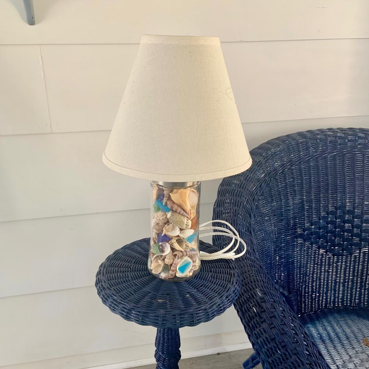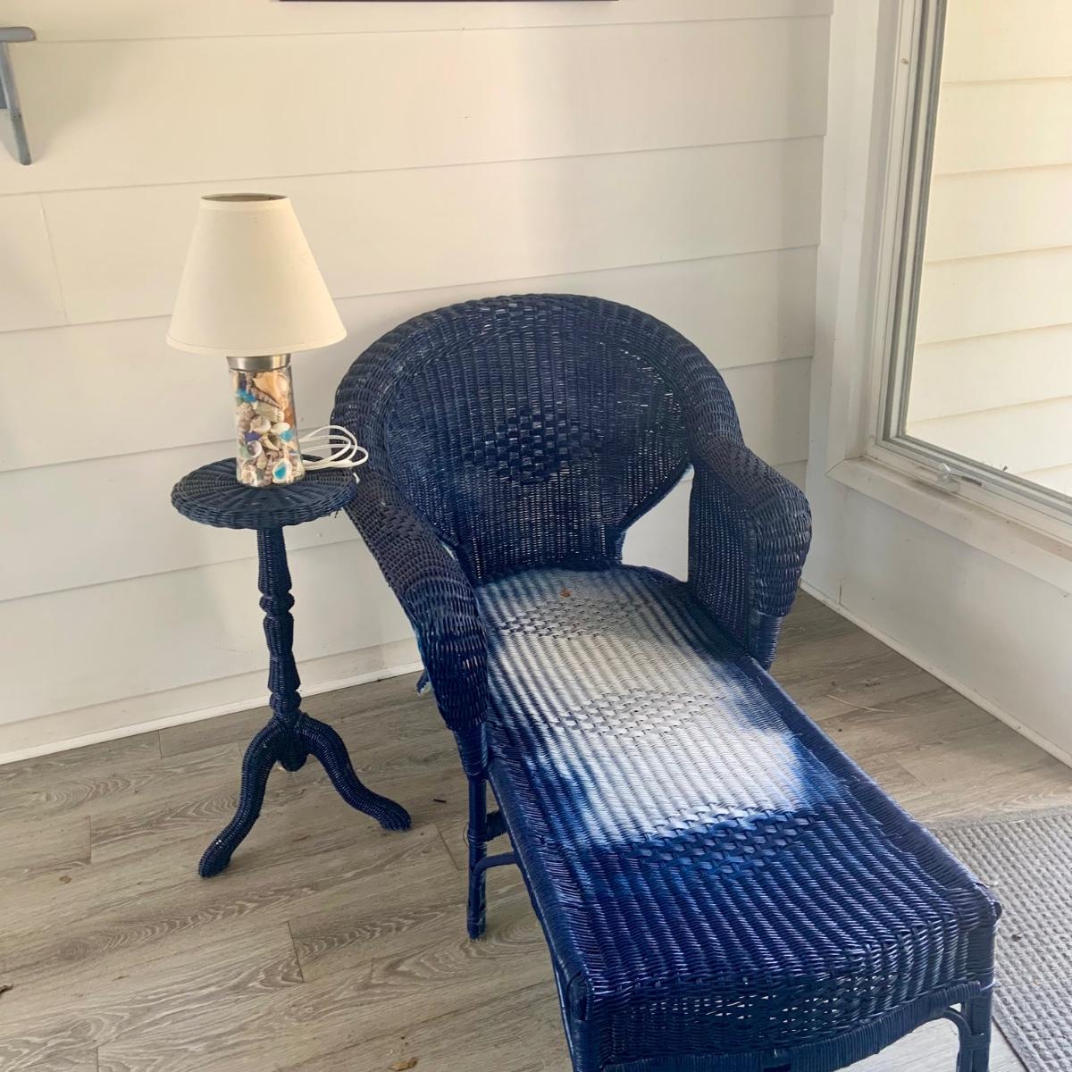 LOT:82: Blue Painted Wicker Loung Chair and Side Table Along with a Seashell Lamp and Natical Themed Wall Art