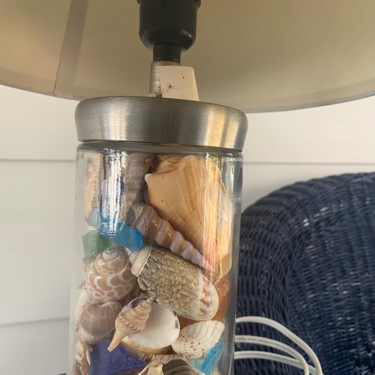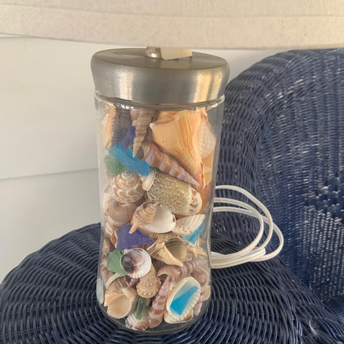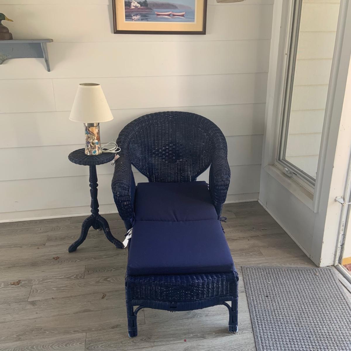 LOT:82: Blue Painted Wicker Loung Chair and Side Table Along with a Seashell Lamp and Natical Themed Wall Art
