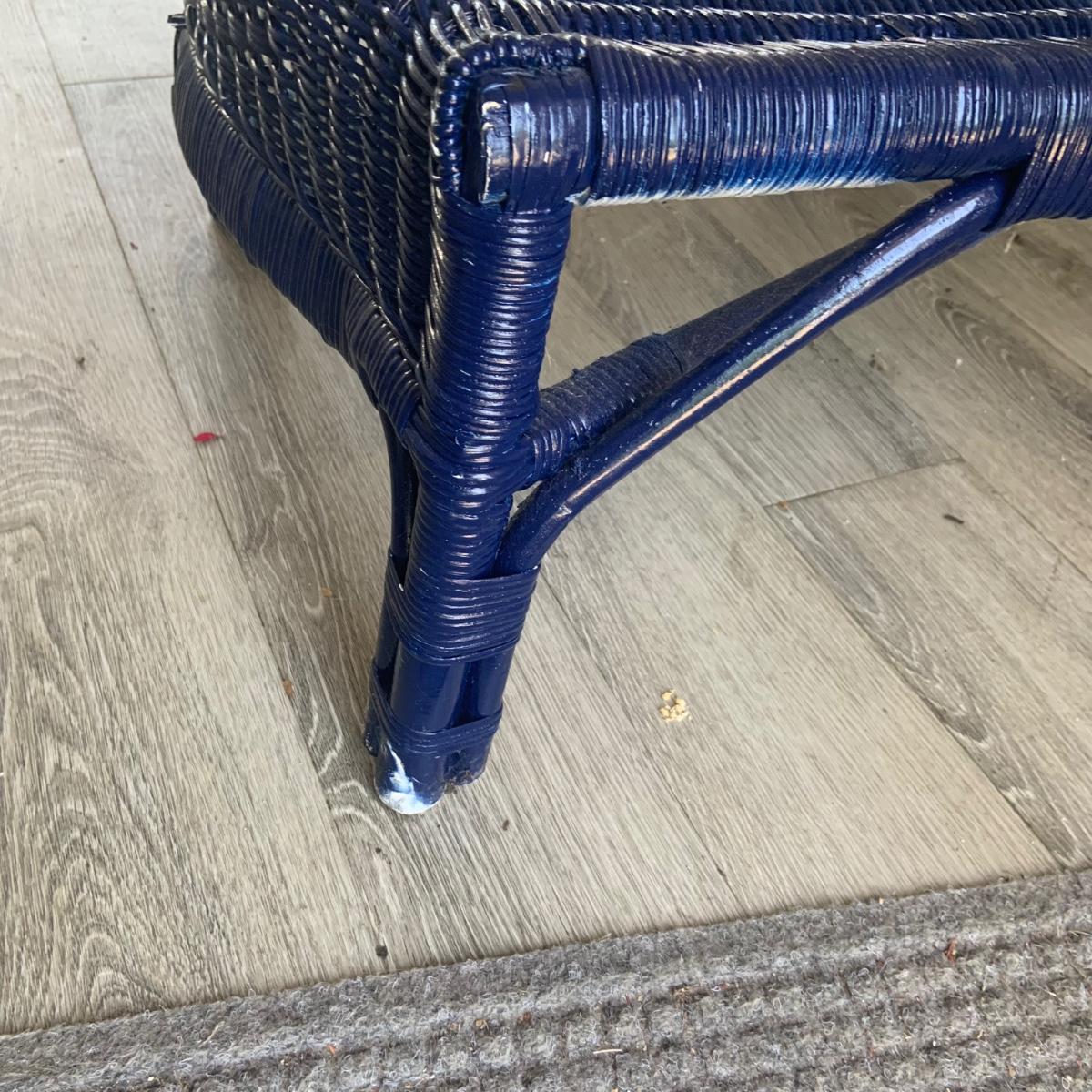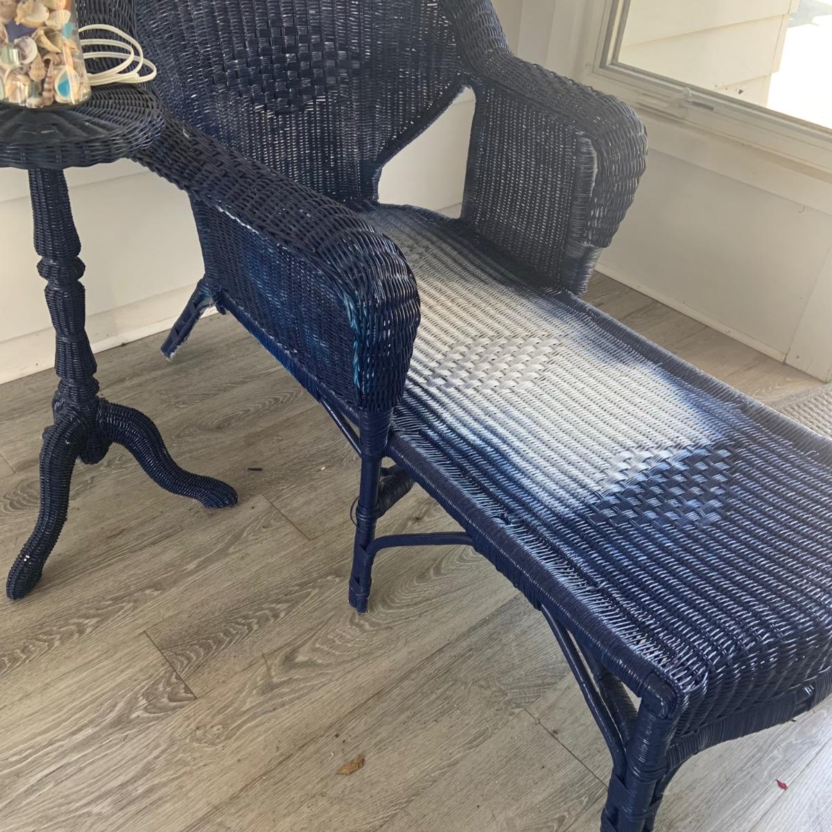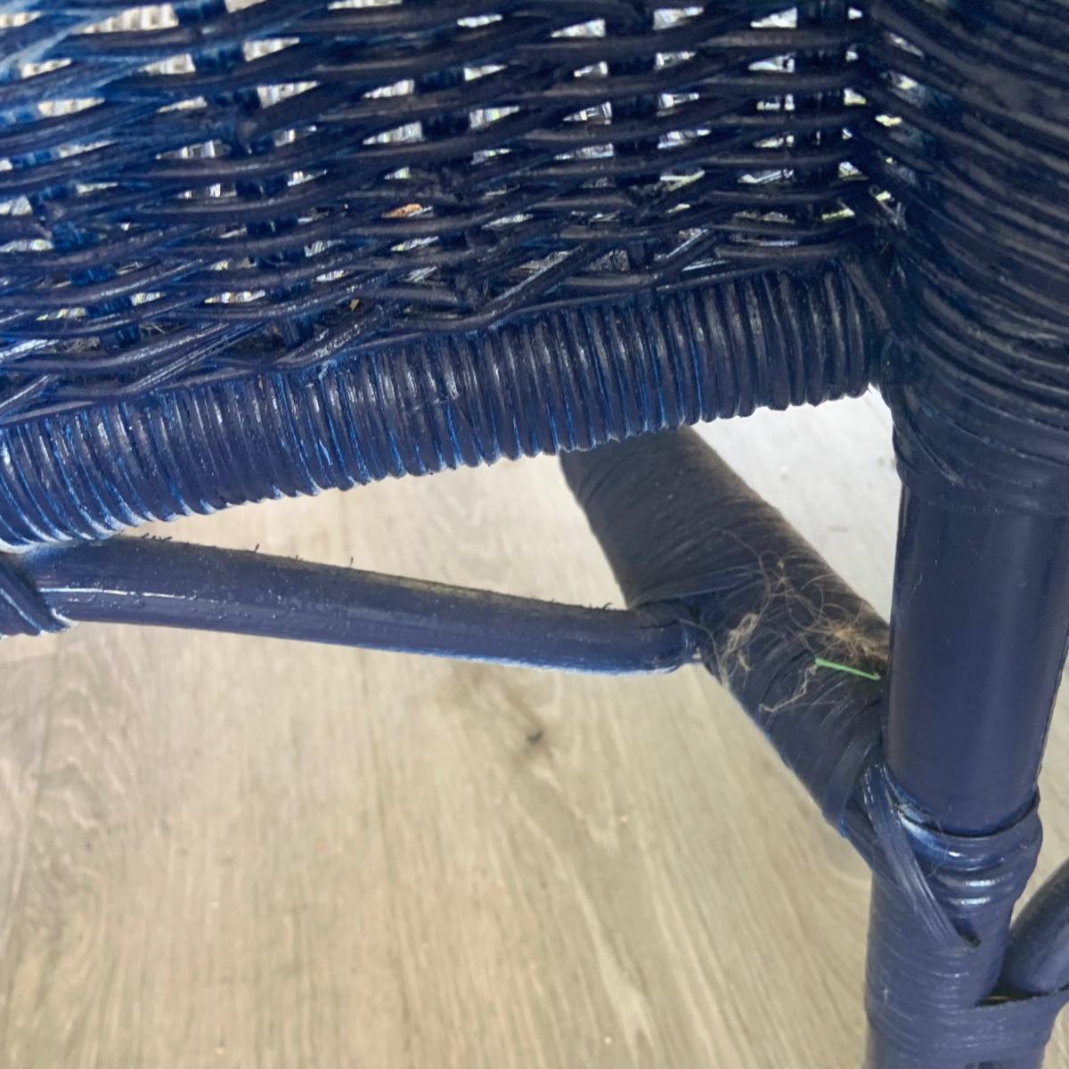 The wicker is painted blue, and the chair has a white section that is not painted.