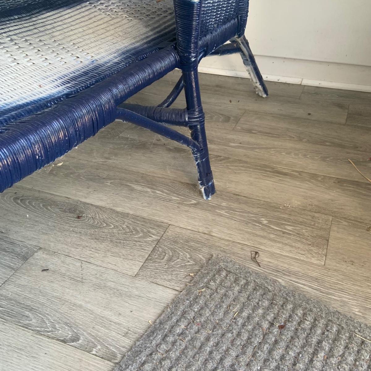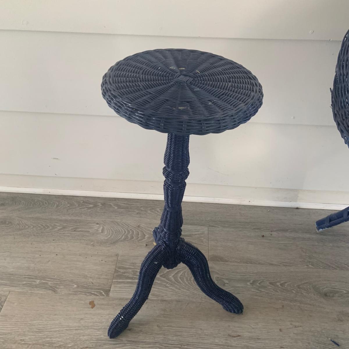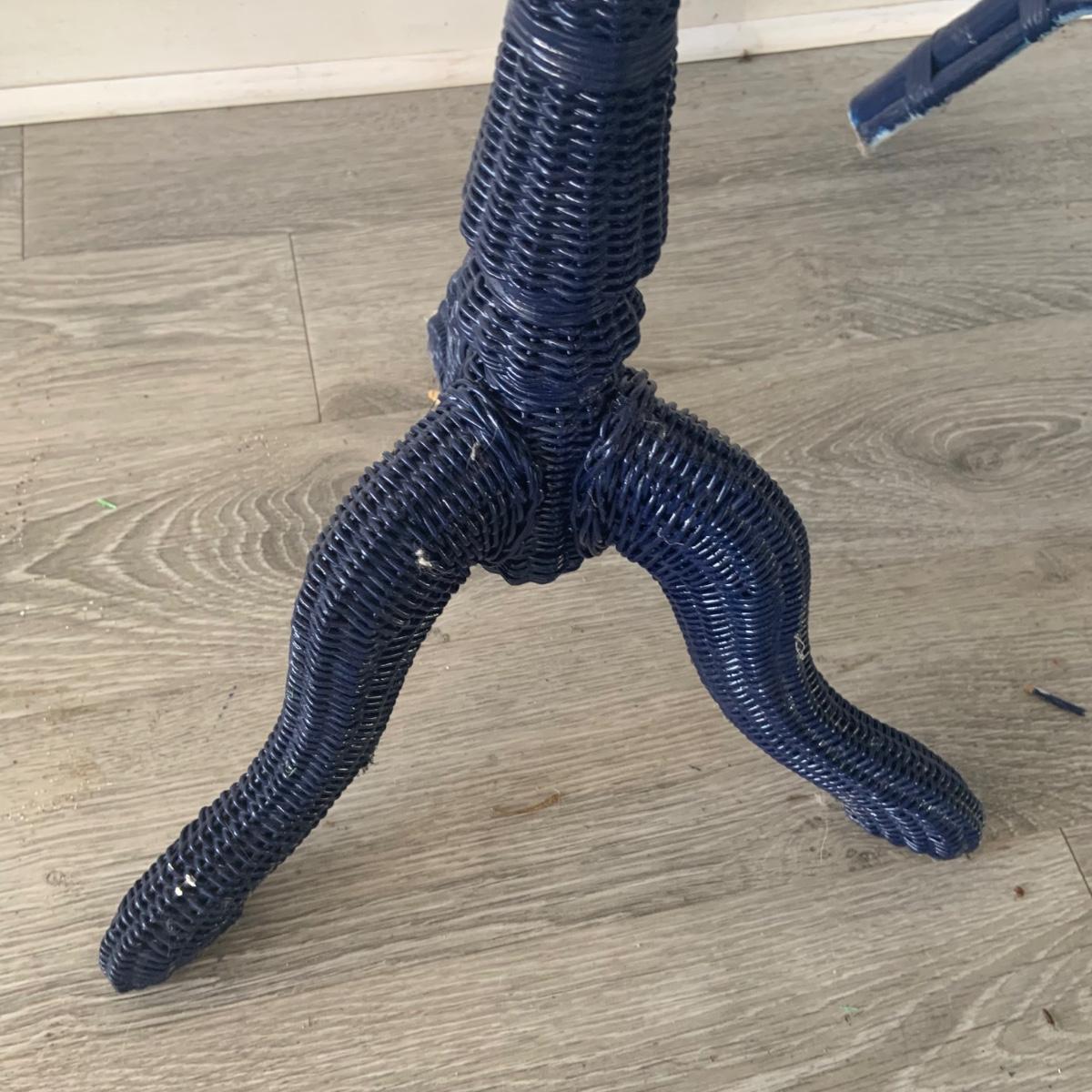 The wicker is painted blue, and the chair has a white section that is not painted.