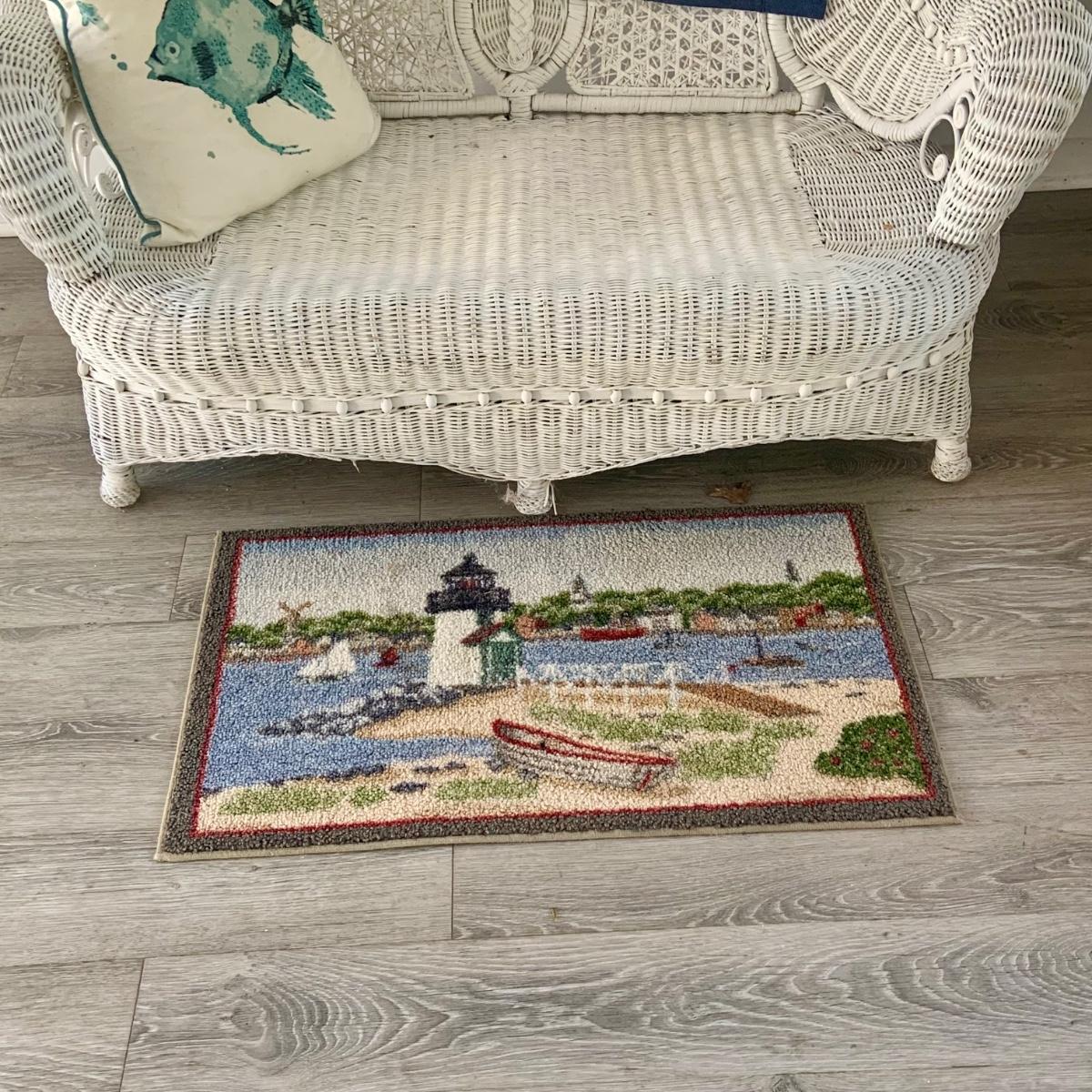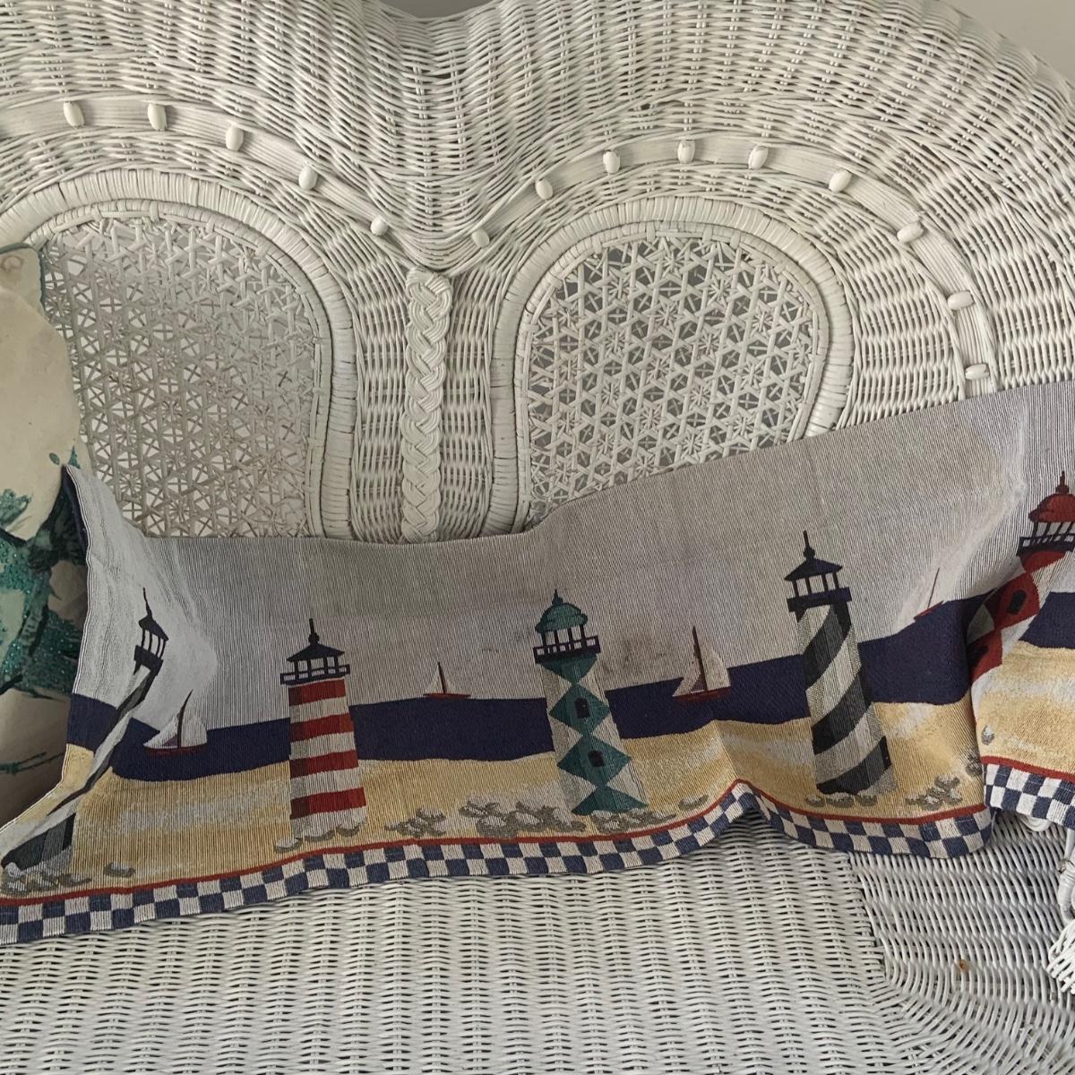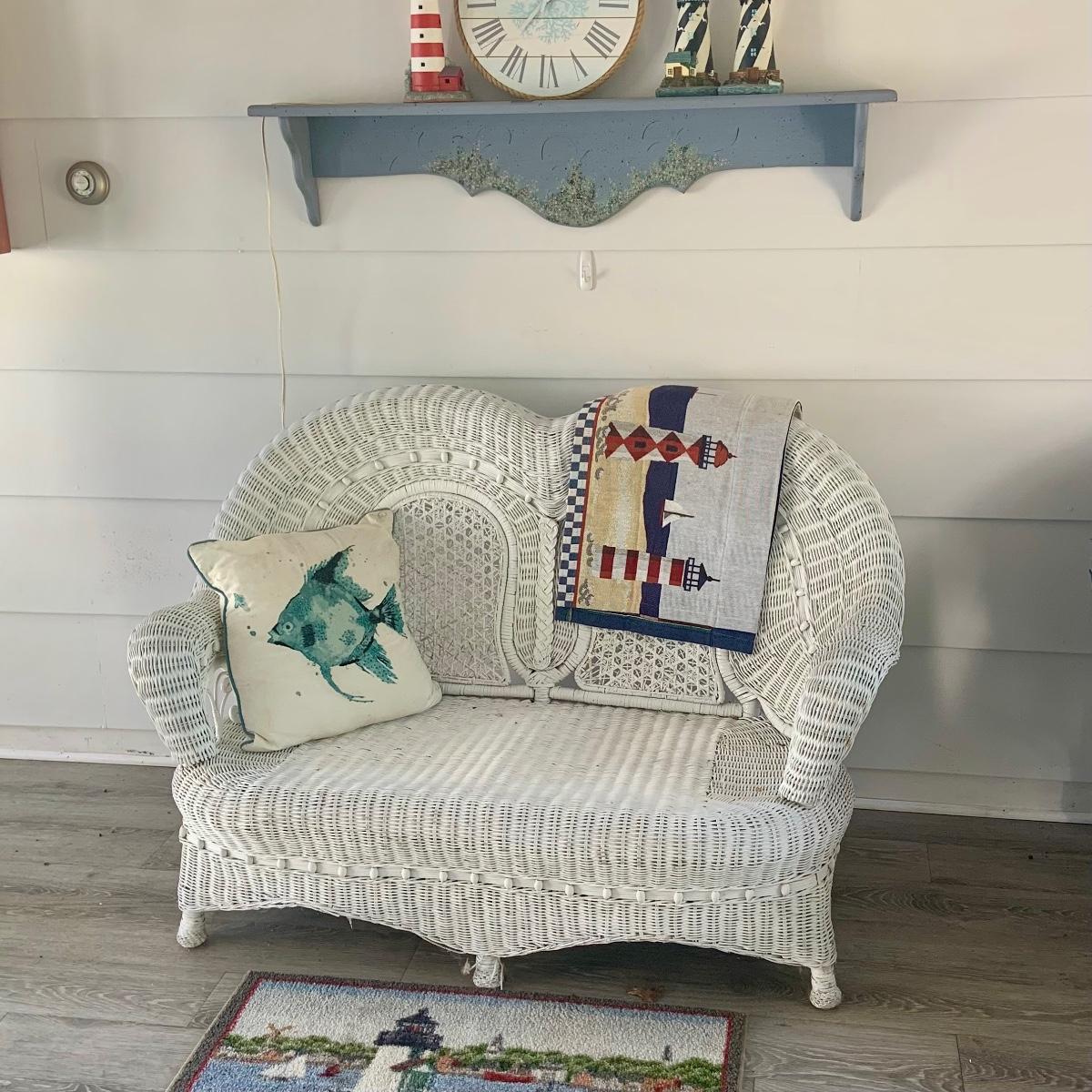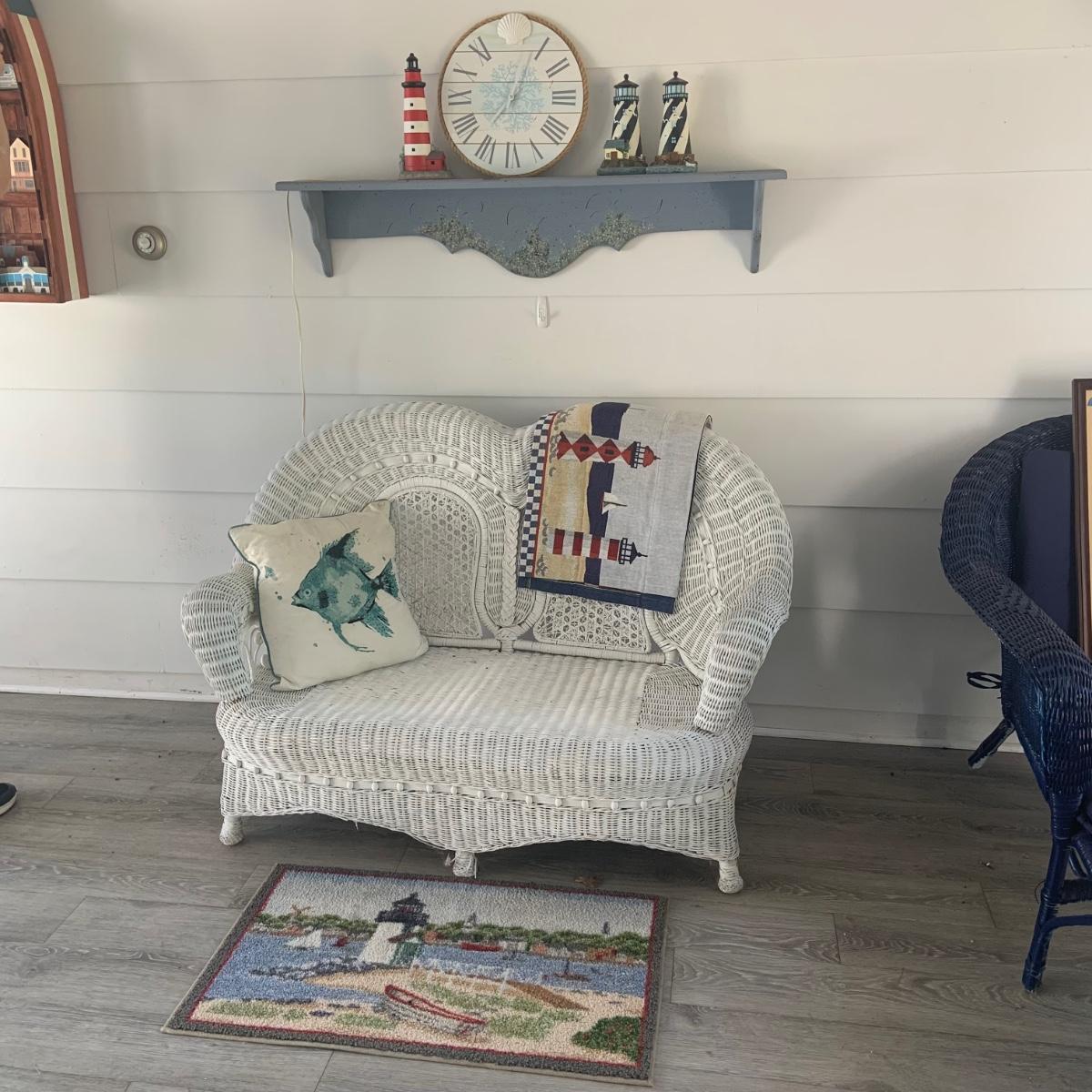 LOT:83: White Wicker Loveseat and Nautical Patio Decor including a Shelf, Clock, Lighthouse Rug, Runner, Book Ends and a Lefton Lighthouse Light