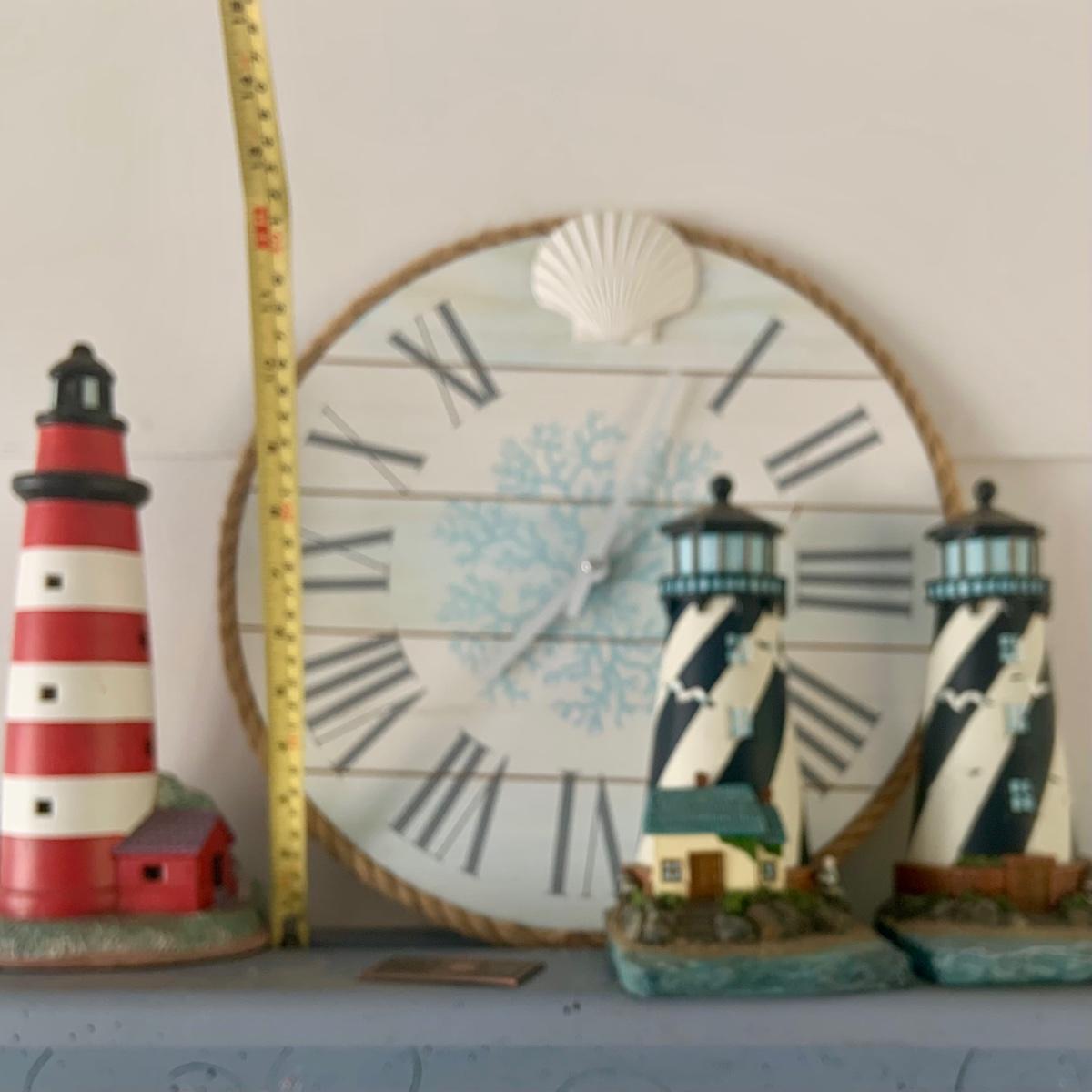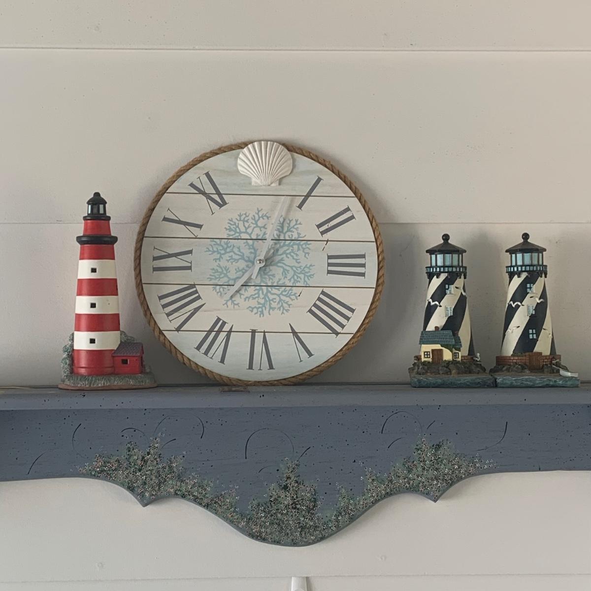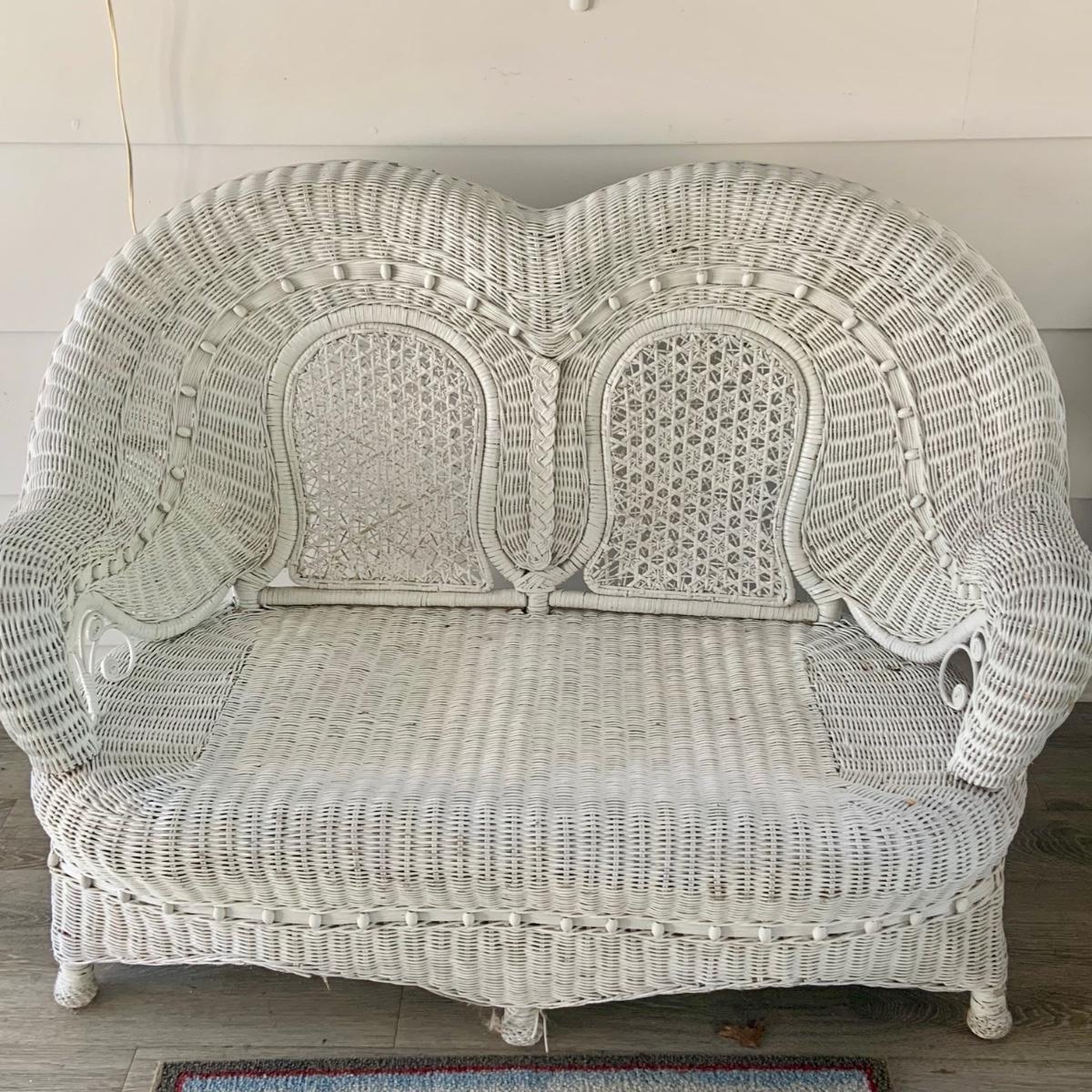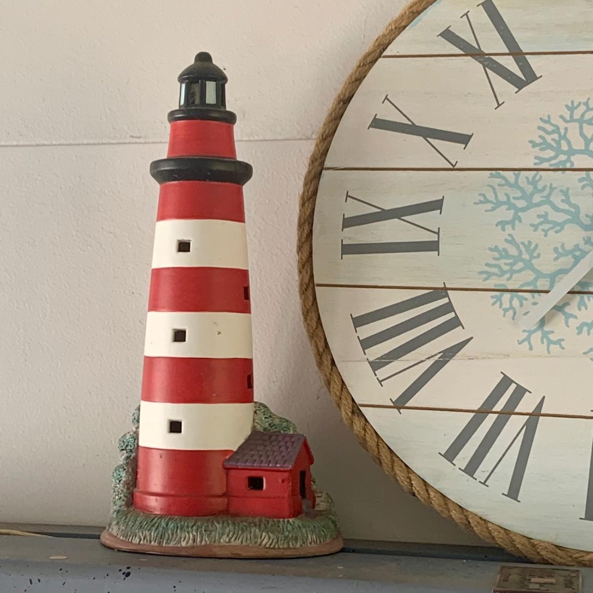 LOT:83: White Wicker Loveseat and Nautical Patio Decor including a Shelf, Clock, Lighthouse Rug, Runner, Book Ends and a Lefton Lighthouse Light