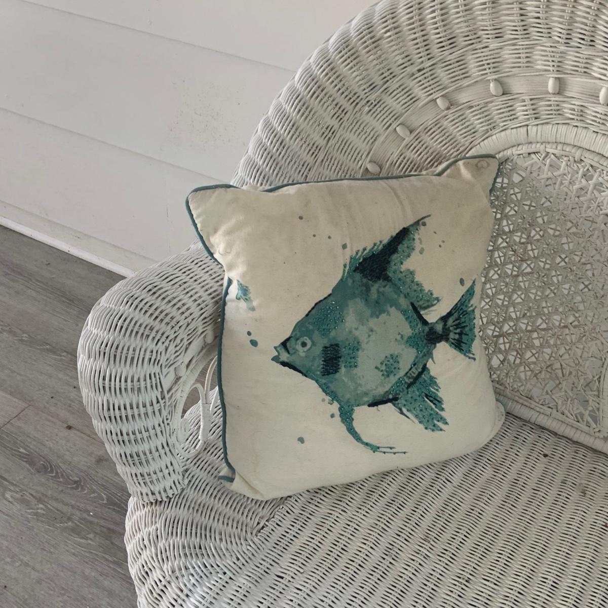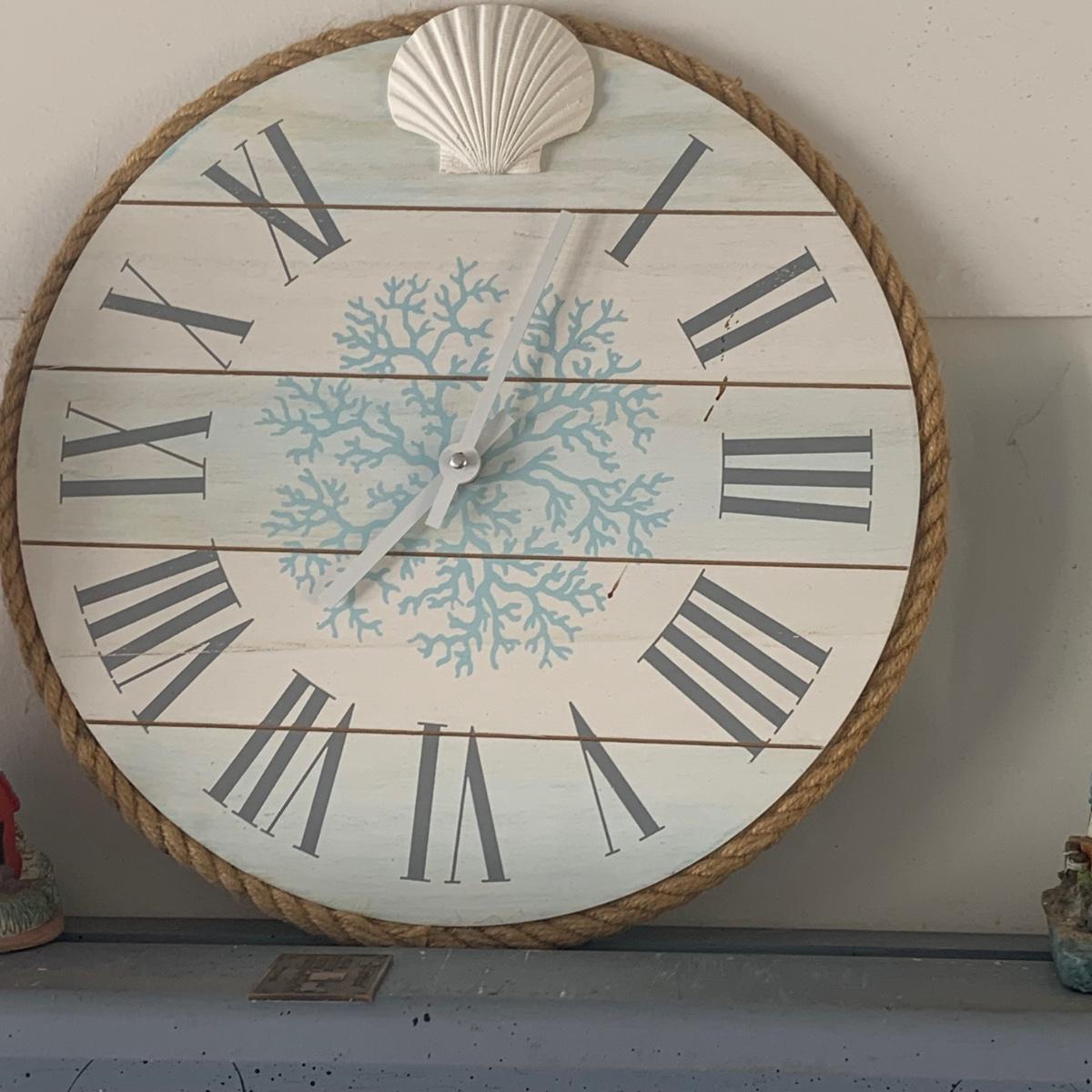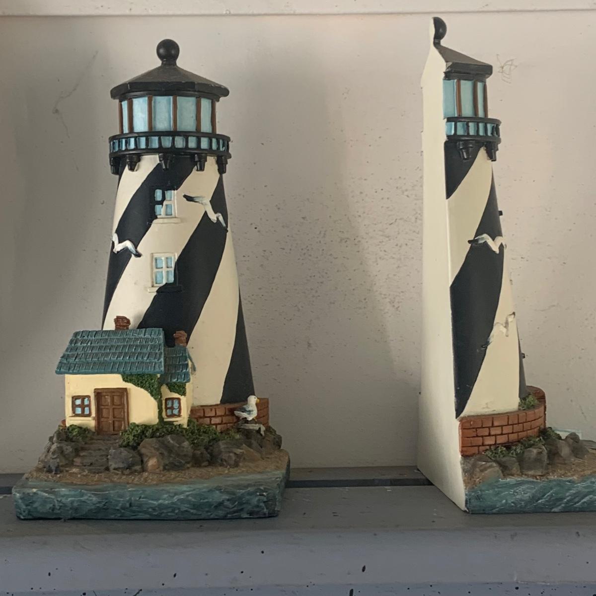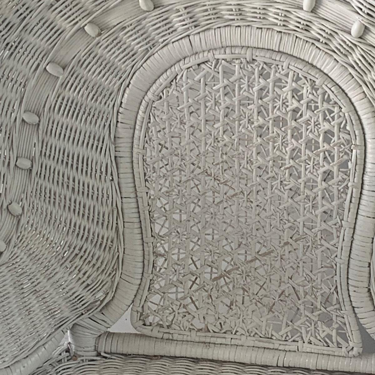 LOT:83: White Wicker Loveseat and Nautical Patio Decor including a Shelf, Clock, Lighthouse Rug, Runner, Book Ends and a Lefton Lighthouse Light