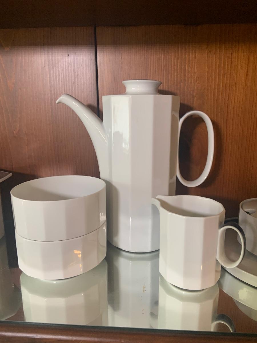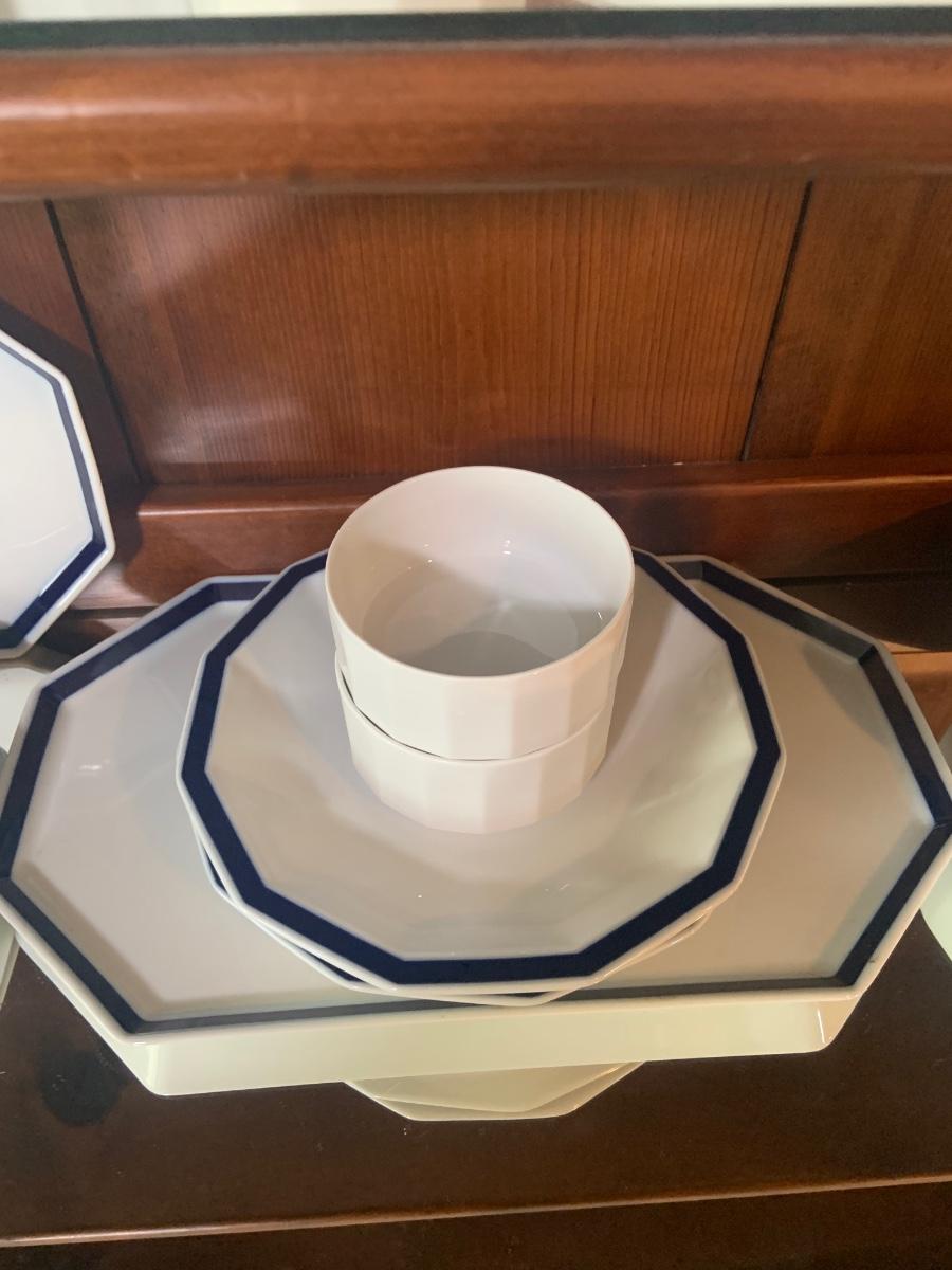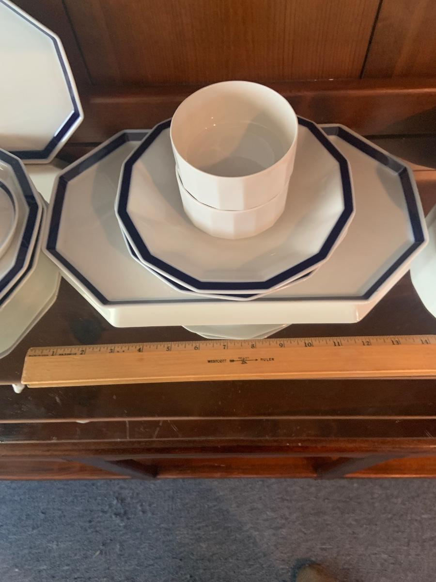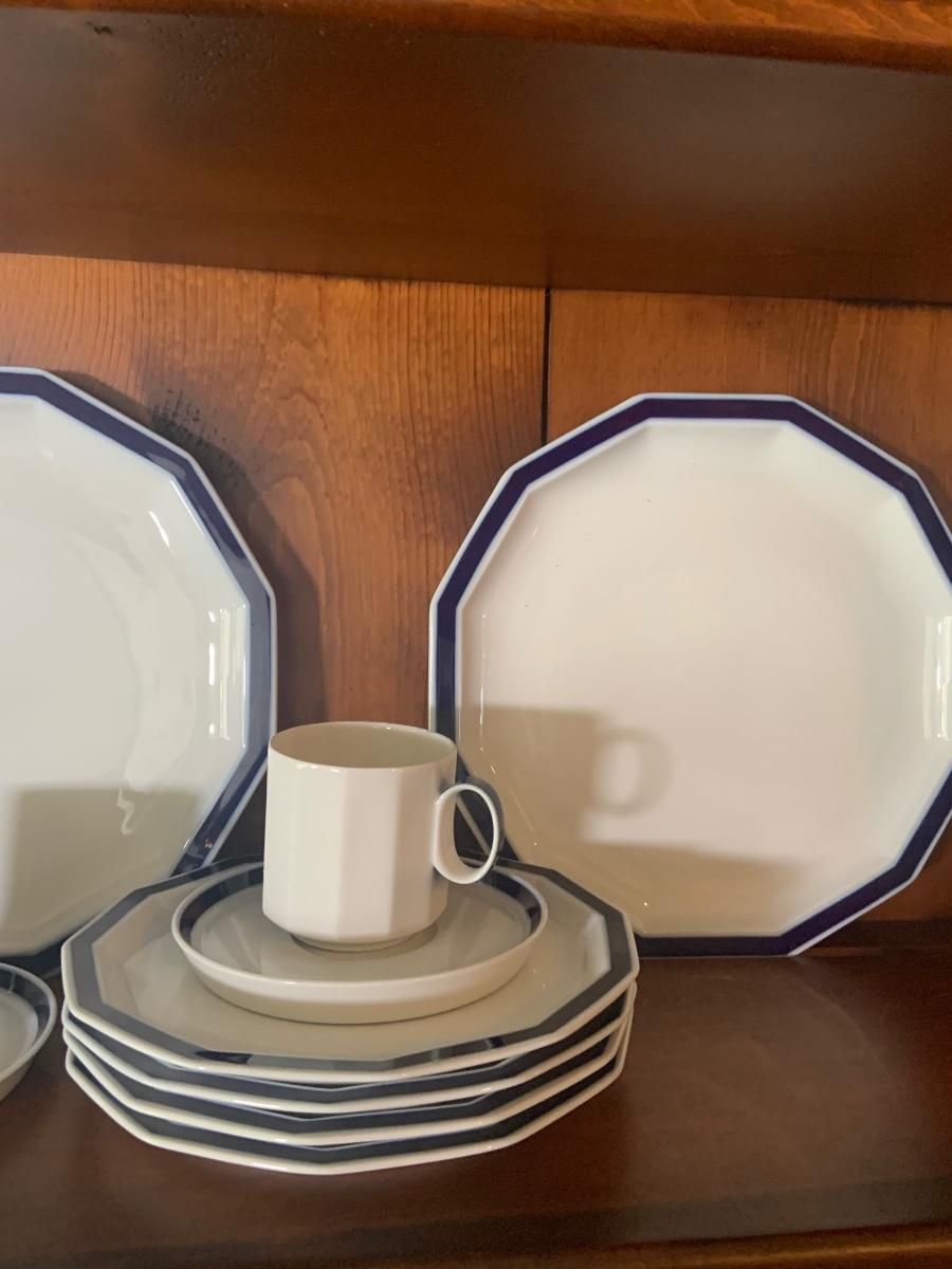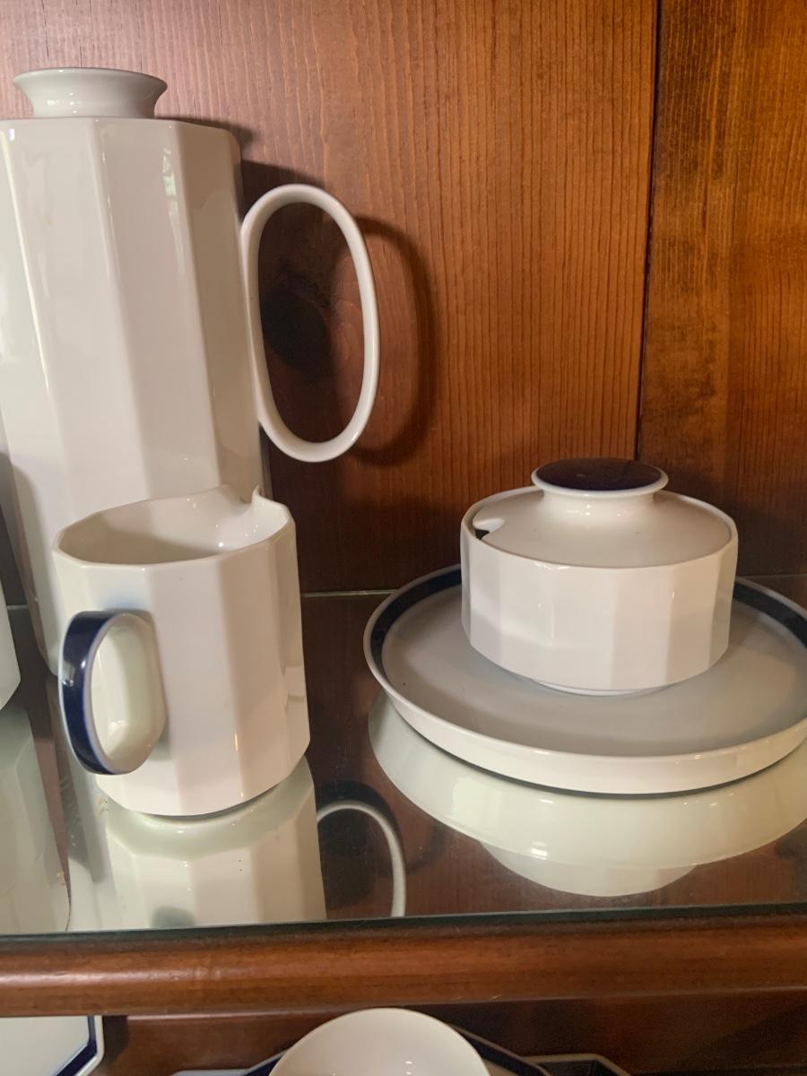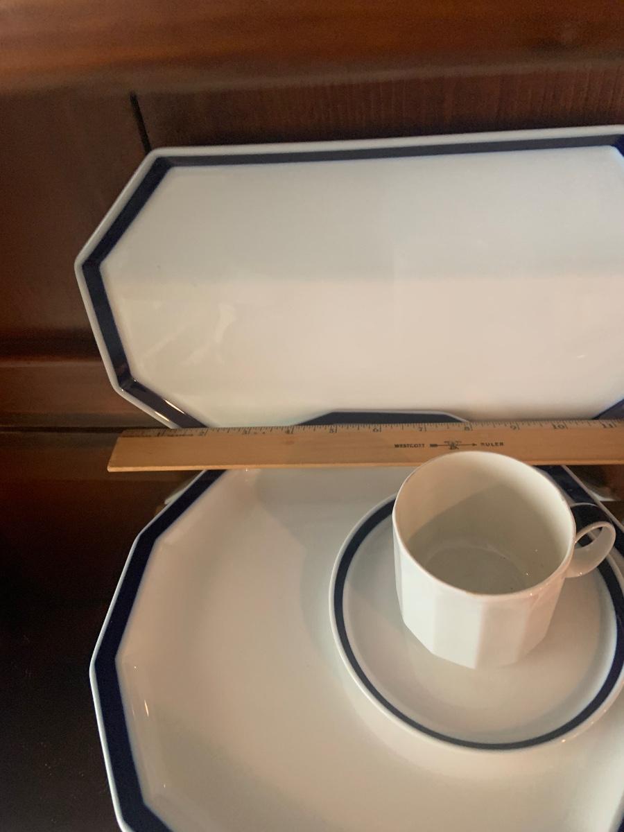 LOT:87: Rosenthal Mykonos Blue Trim Polygon Dinner Service Set -Coffee Pot, Cups Saucers, Creamer, Sugar Bowl. Dinner Plates, Soup Bowl/Cups Serving Dishes/Lids, Salad Bowl & Sized Serving Platters