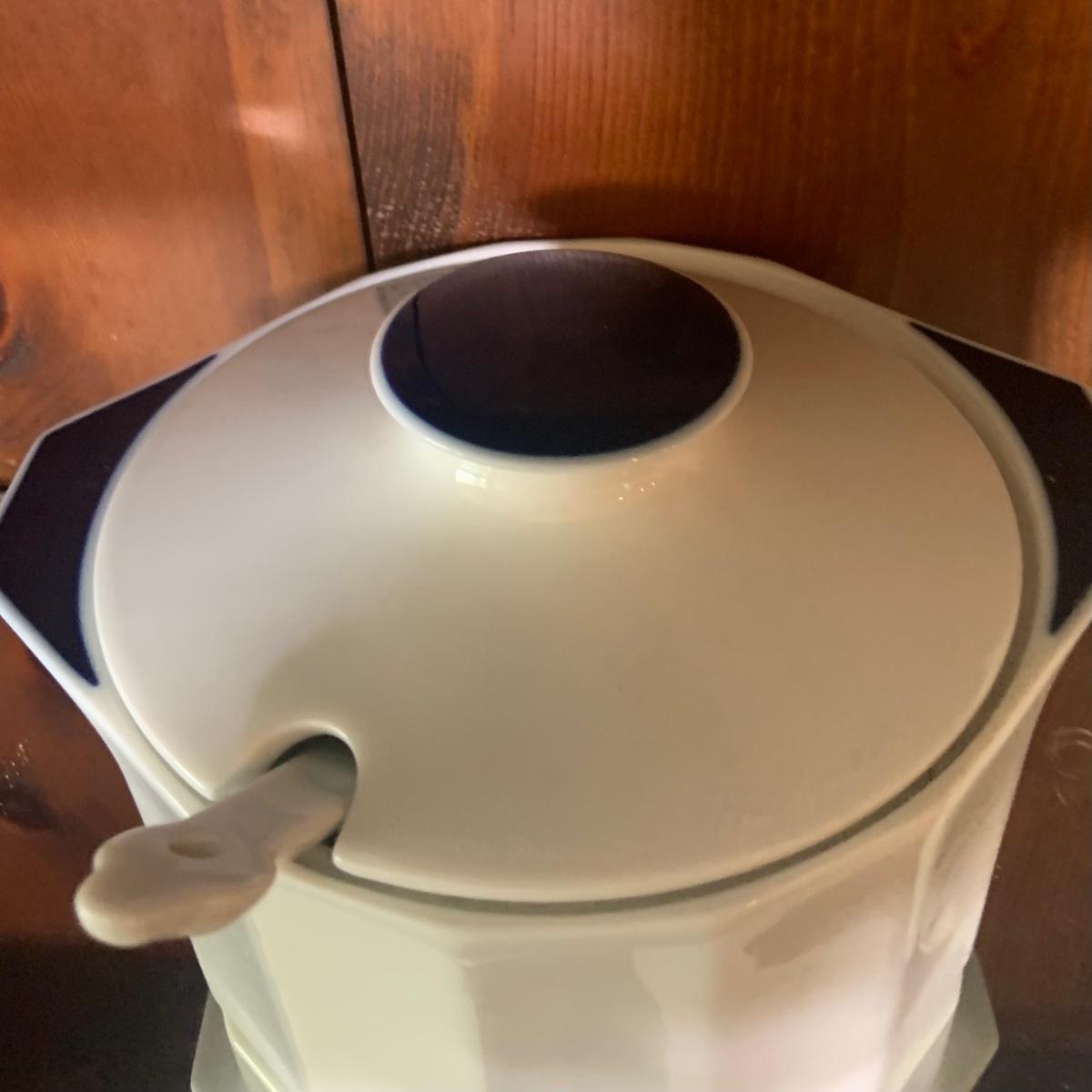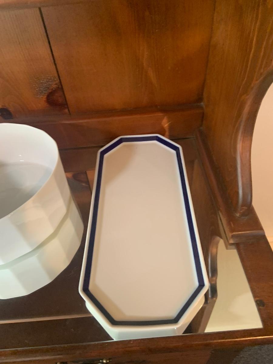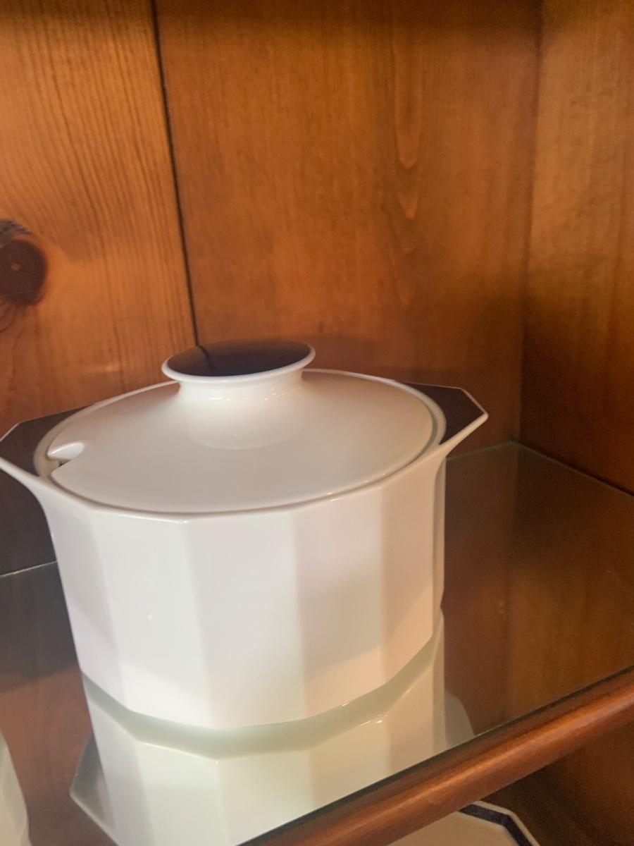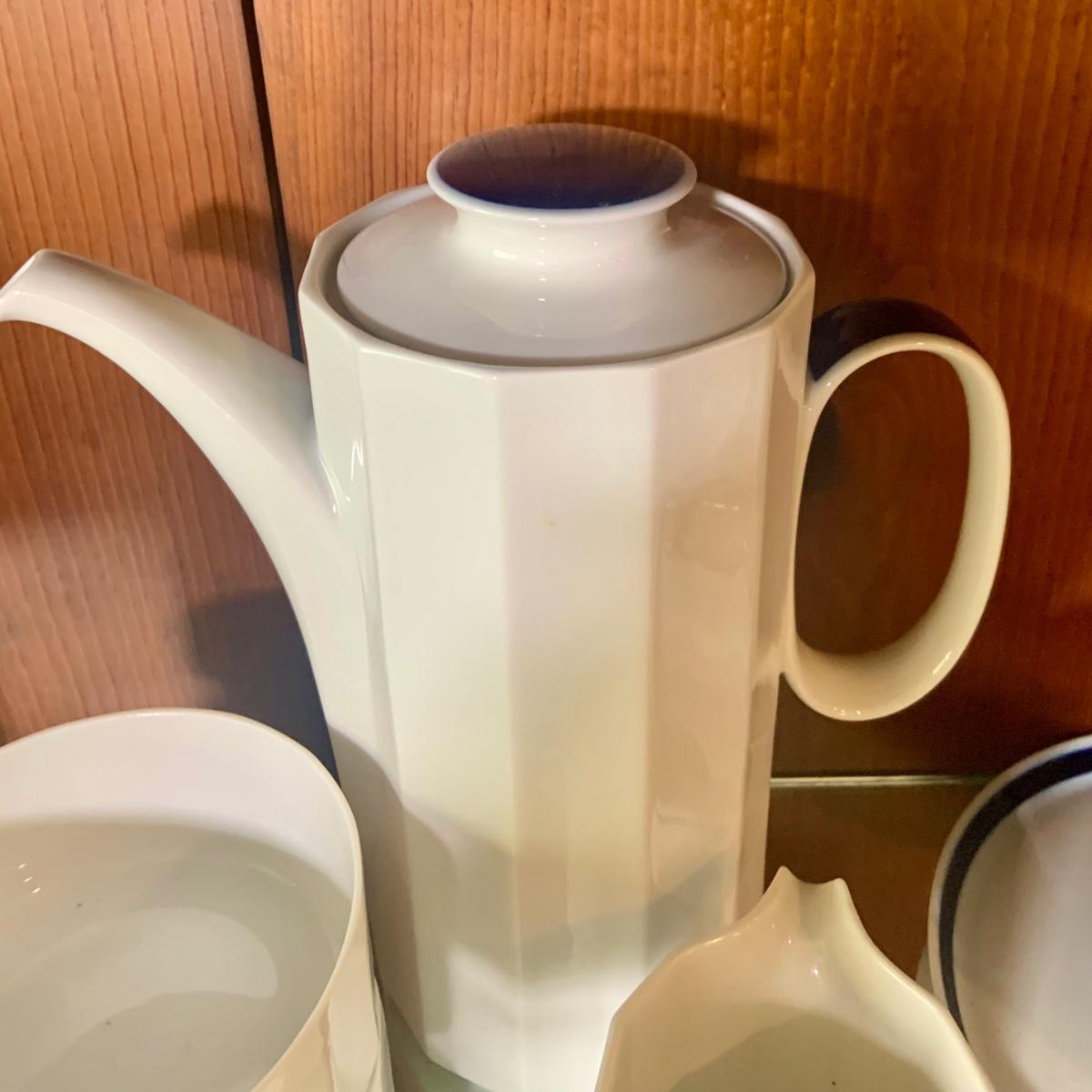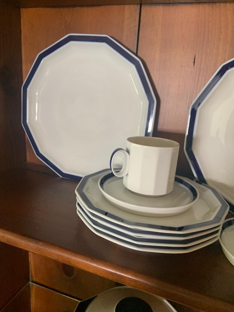LOT:87: Rosenthal Mykonos Blue Trim Polygon Dinner Service Set -Coffee Pot, Cups Saucers, Creamer, Sugar Bowl. Dinner Plates, Soup Bowl/Cups Serving Dishes/Lids, Salad Bowl & Sized Serving Platters