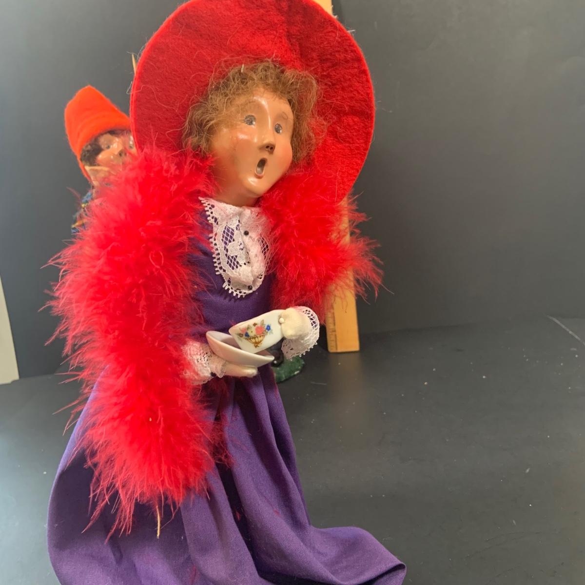LOT:101: Byers Choice Carolers - Vintage Conductor, Girl with French Horn, Vintage Boy with Music and Fancy Lady Sitting for Tea