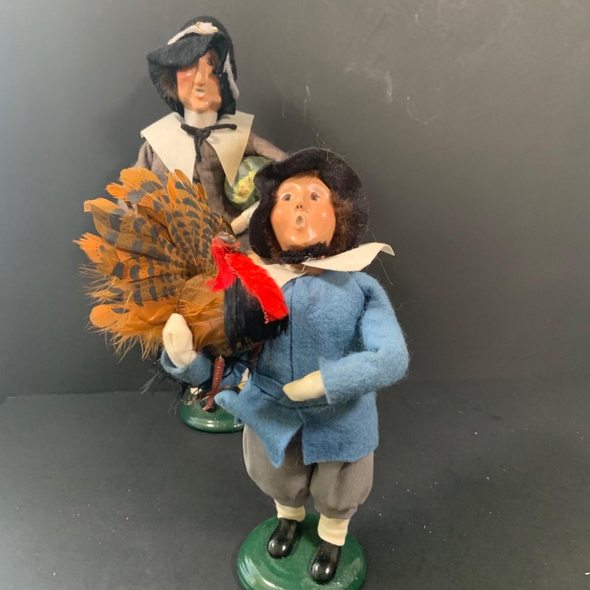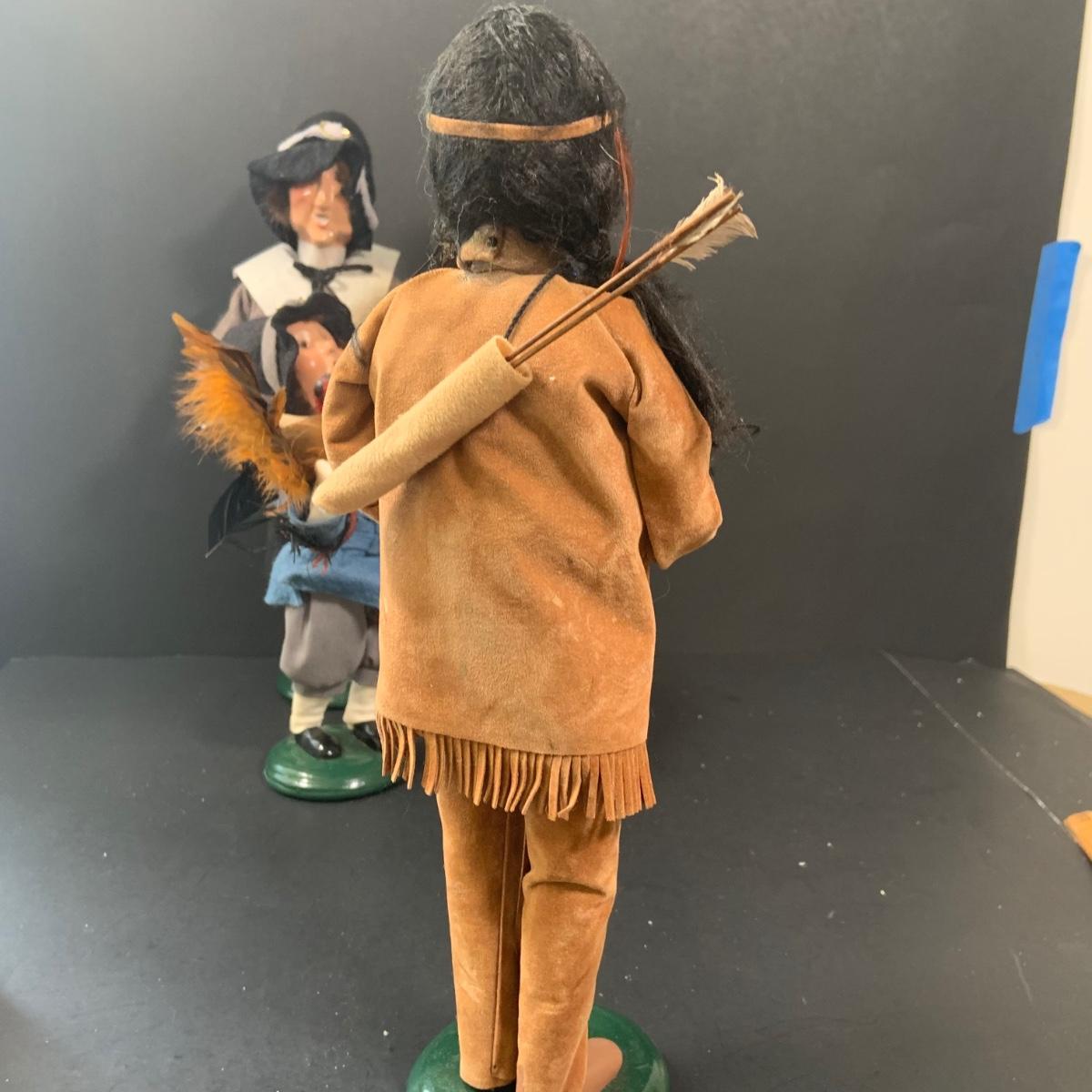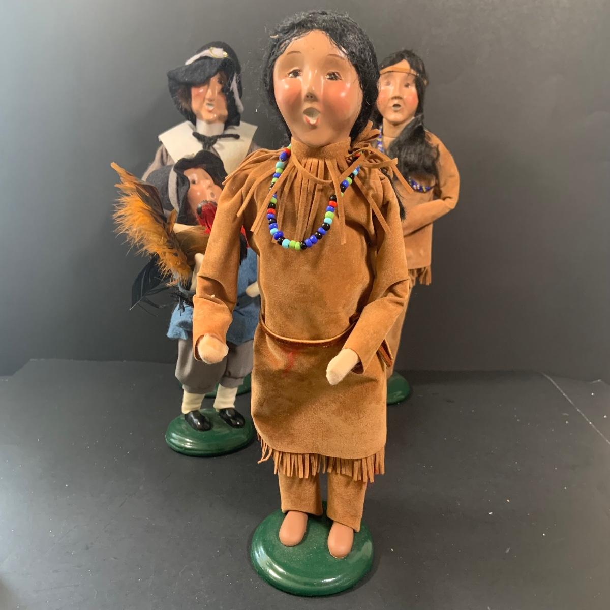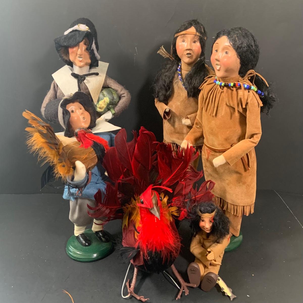 LOT:102: Byers Choice Thanksgiving Carolers - Pilgram Man and Boy, Native American Man Woman and Sitting Child and Oversized Turkey