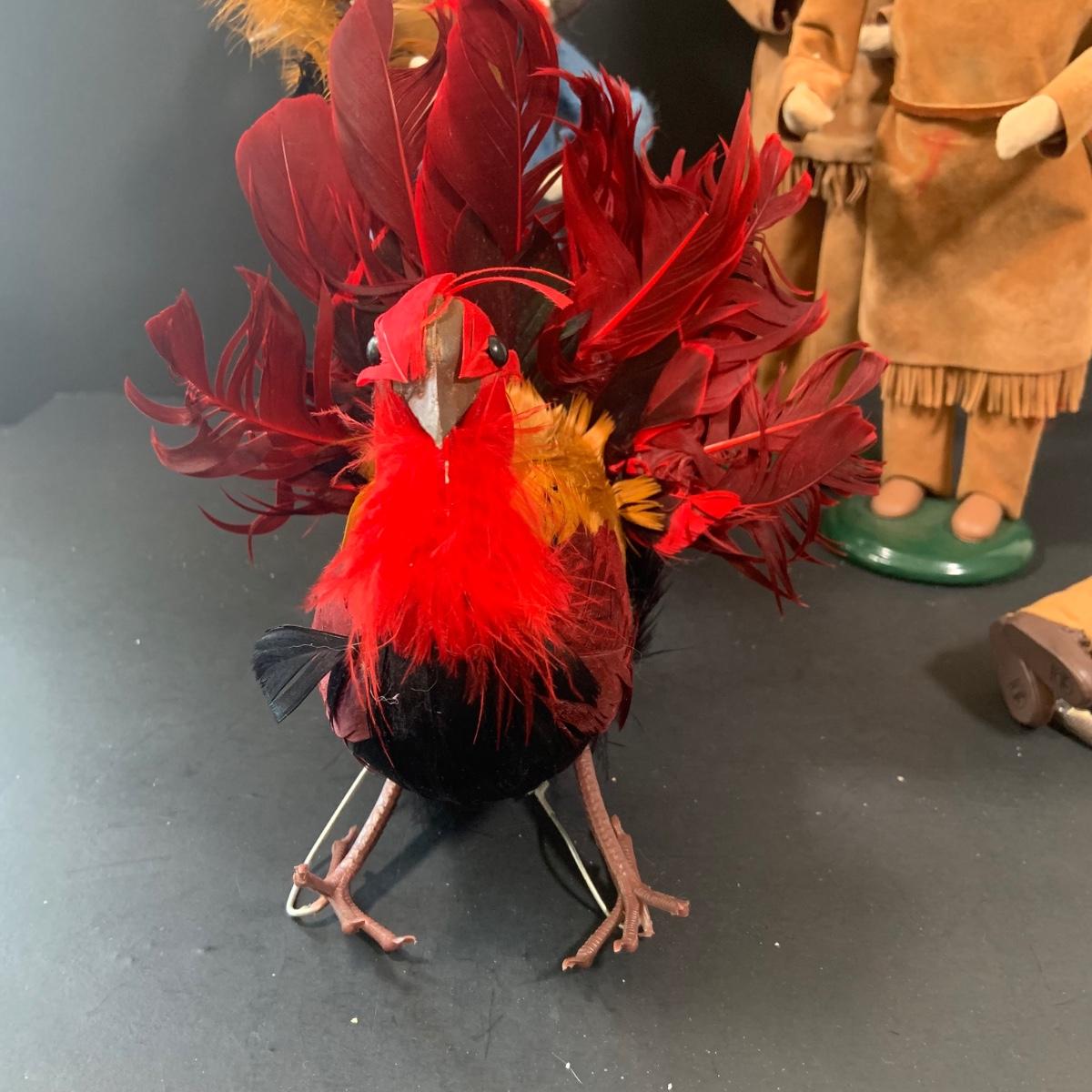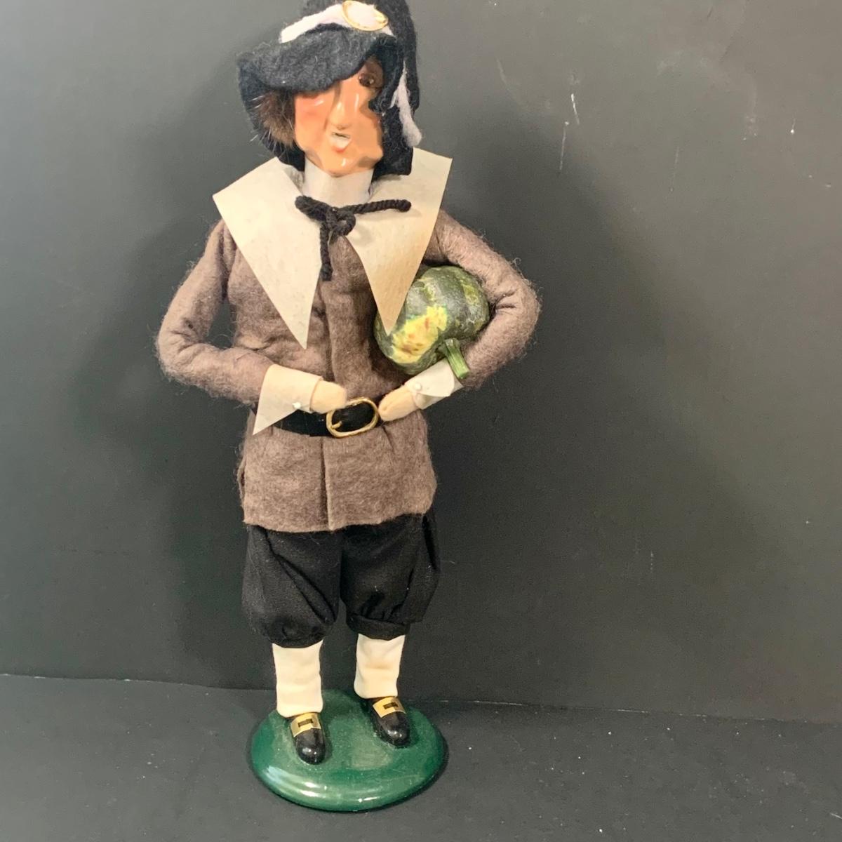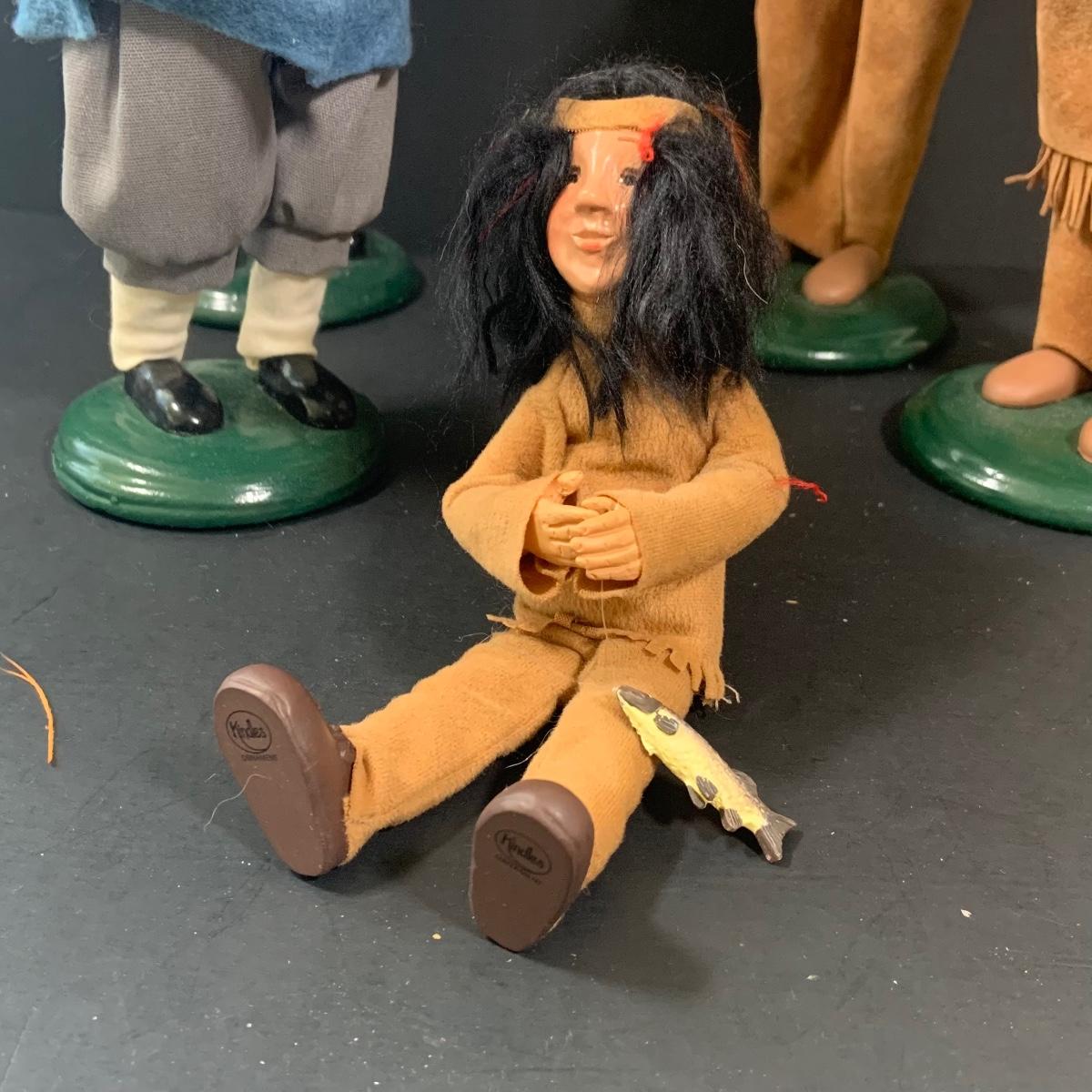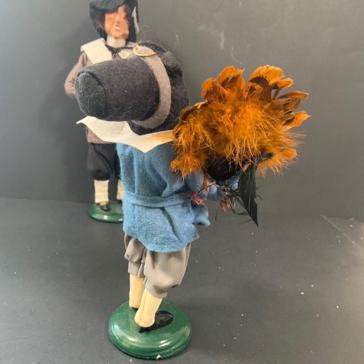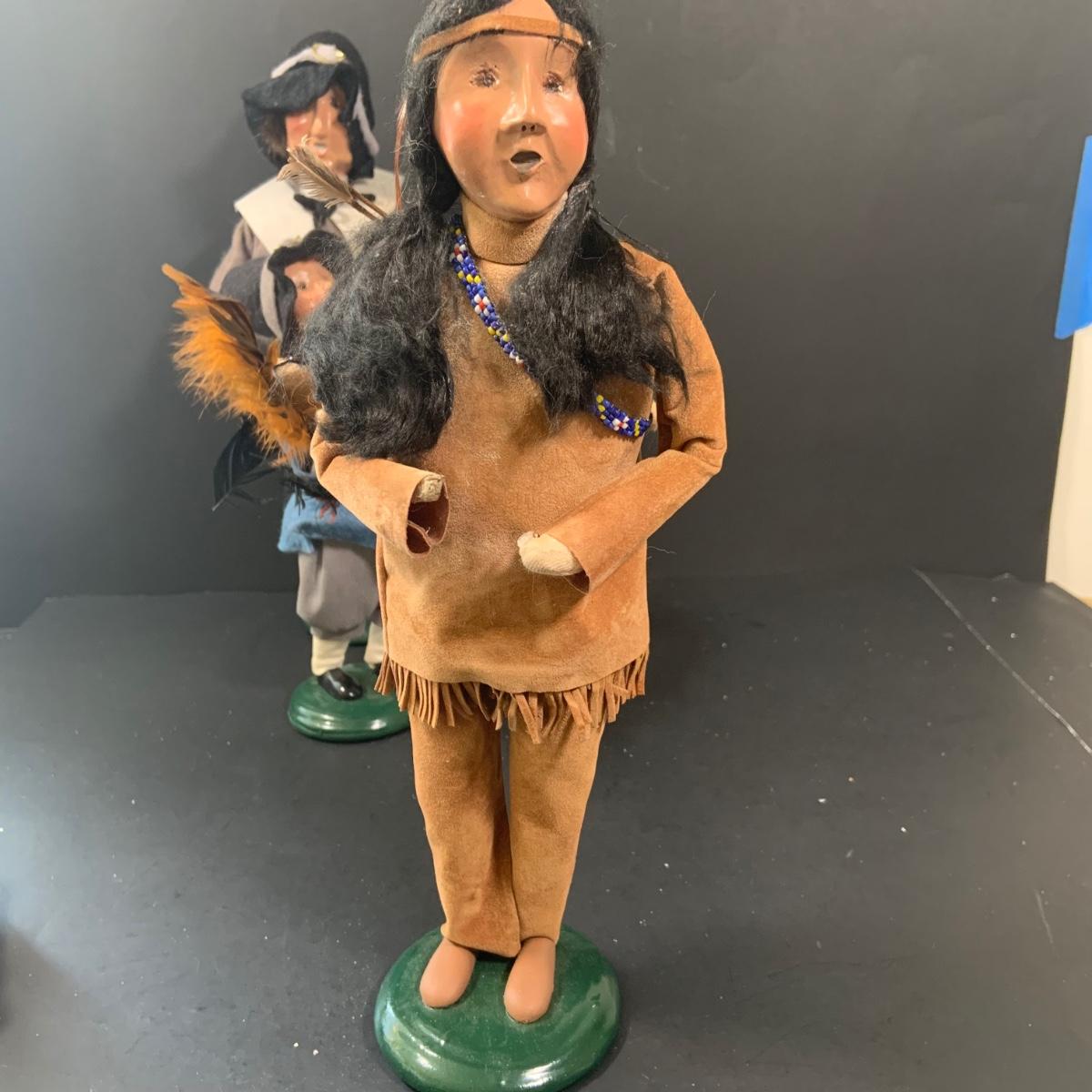 LOT:102: Byers Choice Thanksgiving Carolers - Pilgram Man and Boy, Native American Man Woman and Sitting Child and Oversized Turkey
