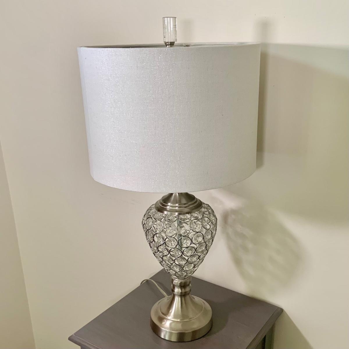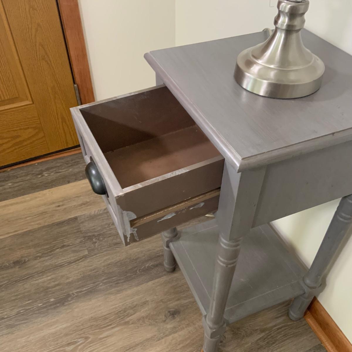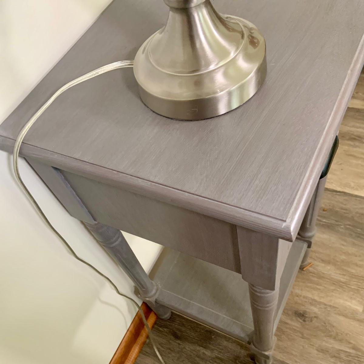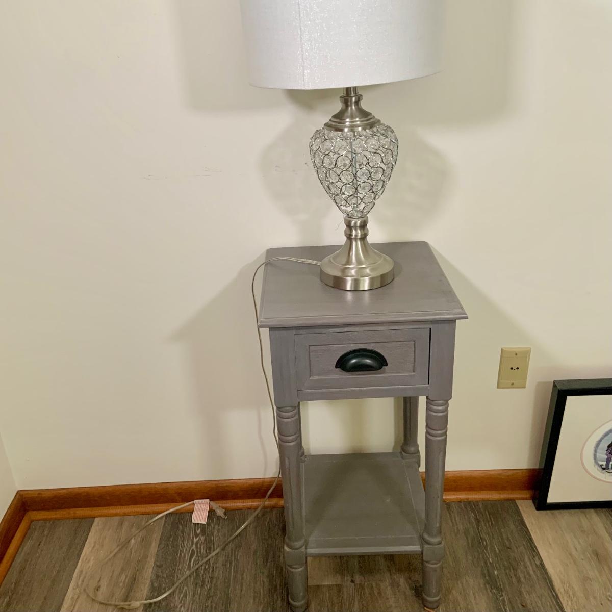 LOT:105: Wooden Side Table Painted Gray and a Crystal and Crome Table Lamp