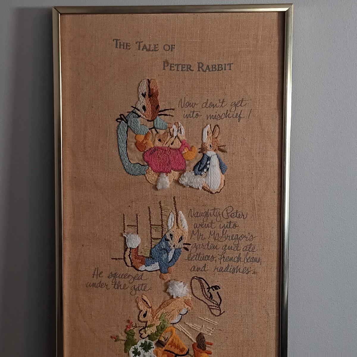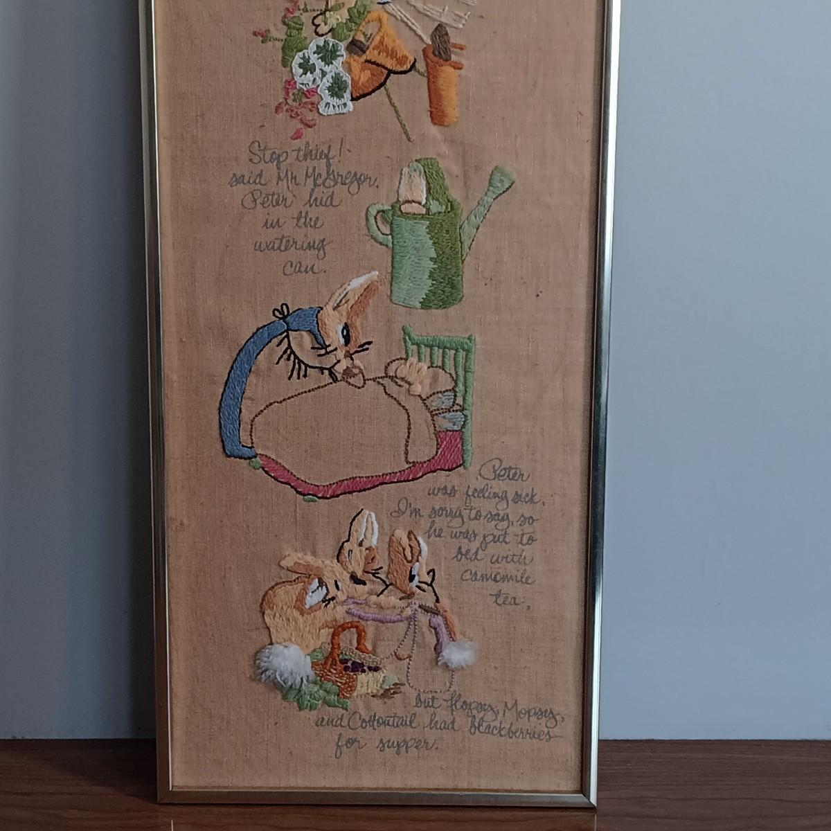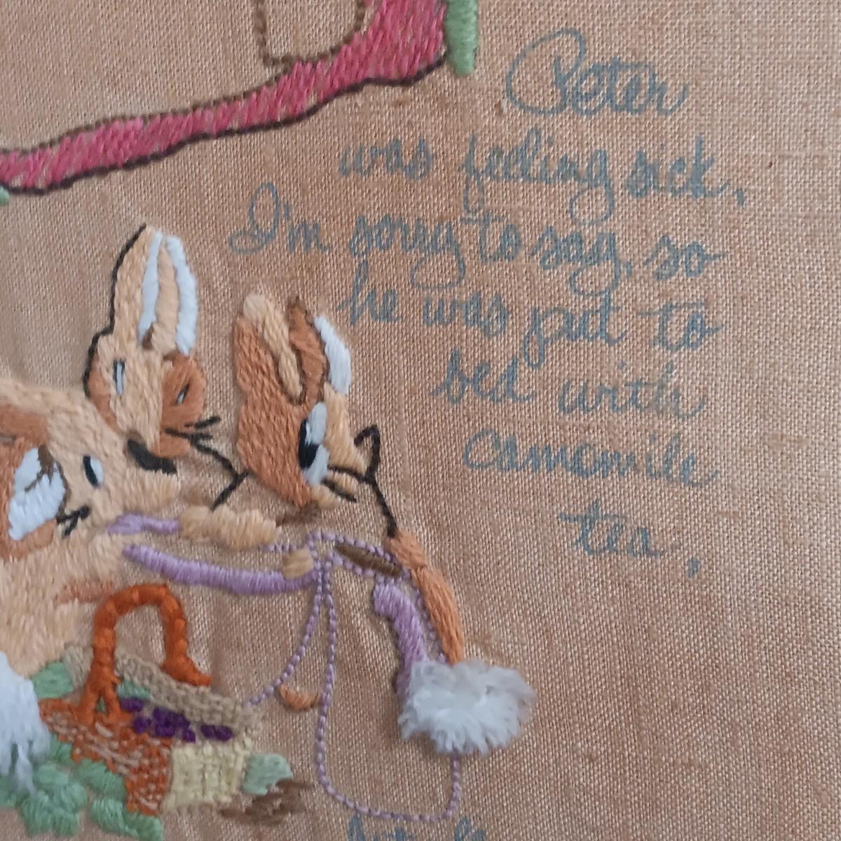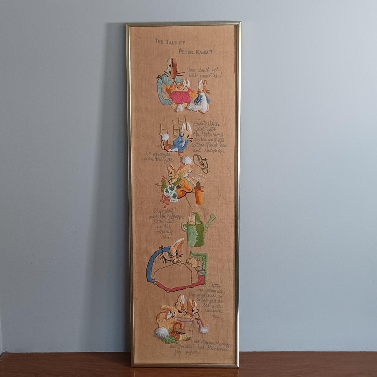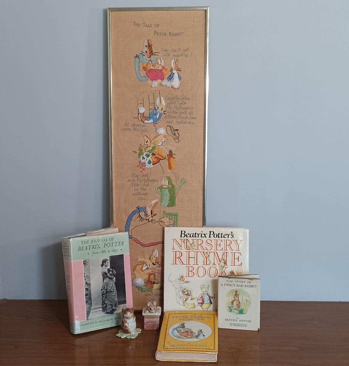 LOT 131: Beatrix Potter 10" x 33" Vintage Cross Stitch, Tom Thumb and Timmy Willie Beswick Figurines & Books