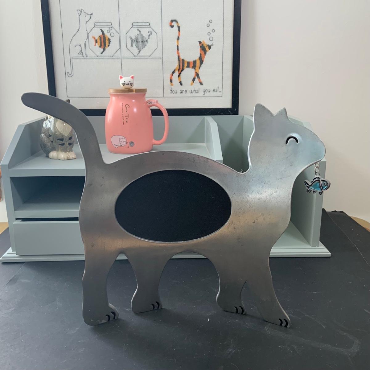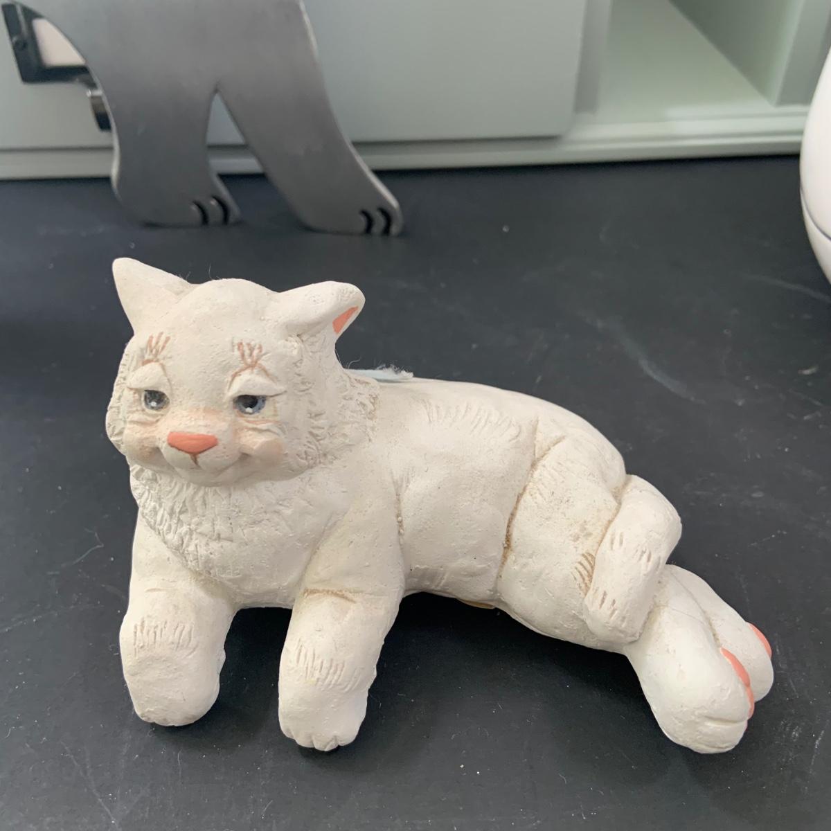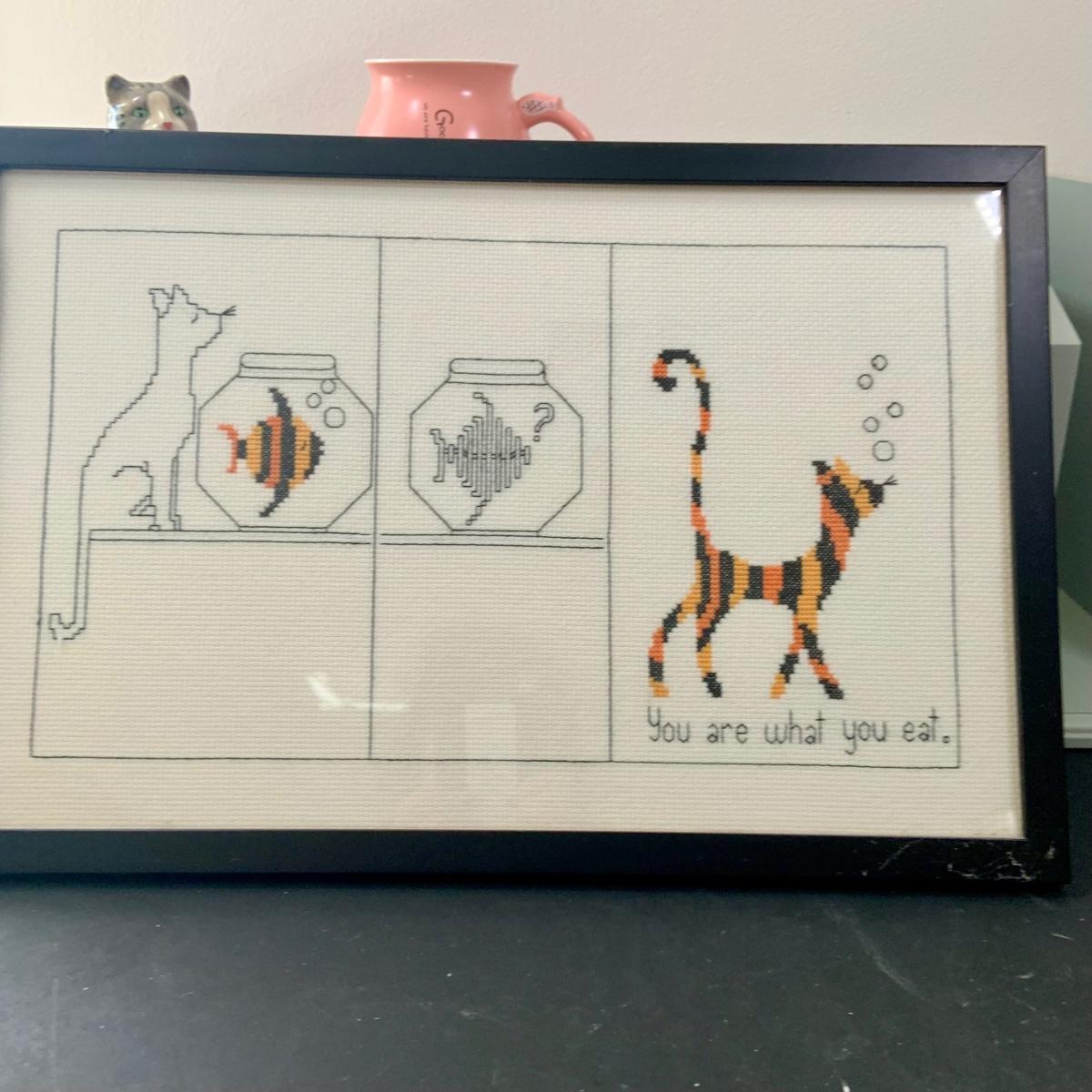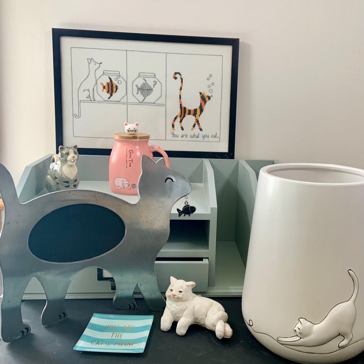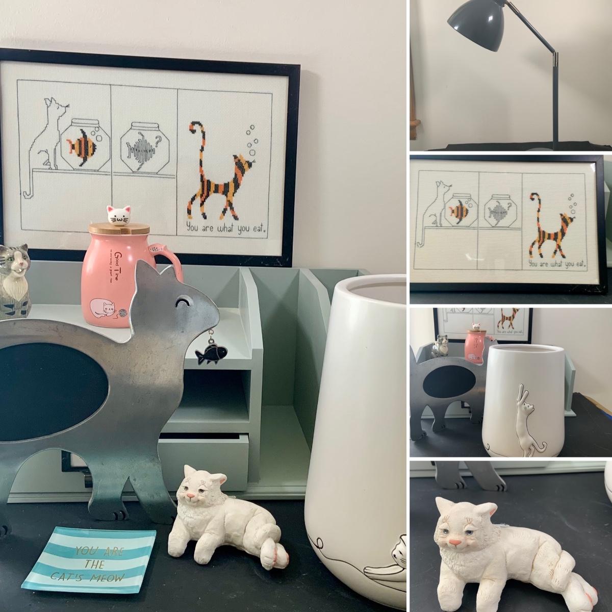 LOT 136: Cat Collection- Framed Cross-stitch, Office Decor, Figurines & More